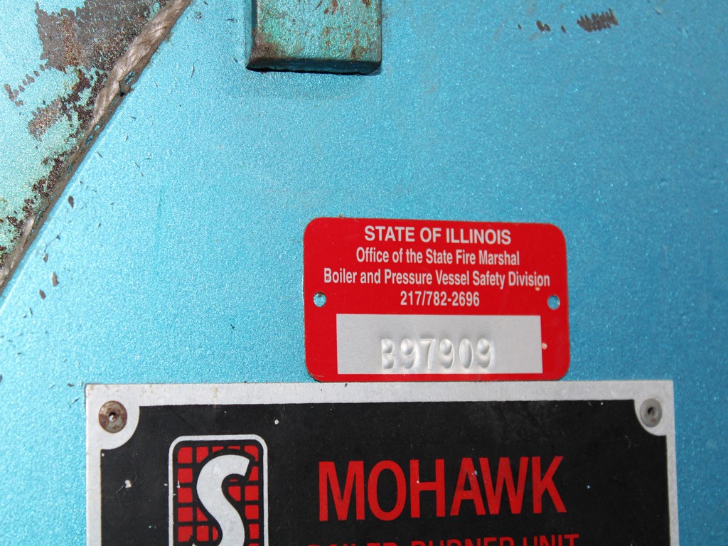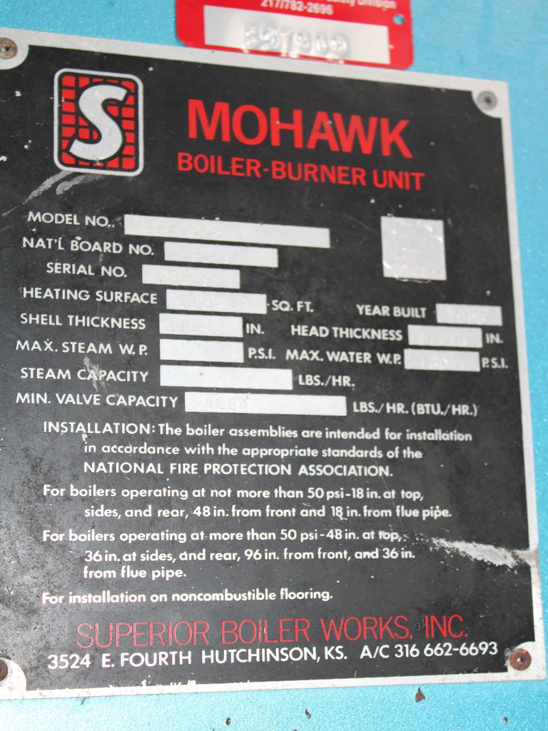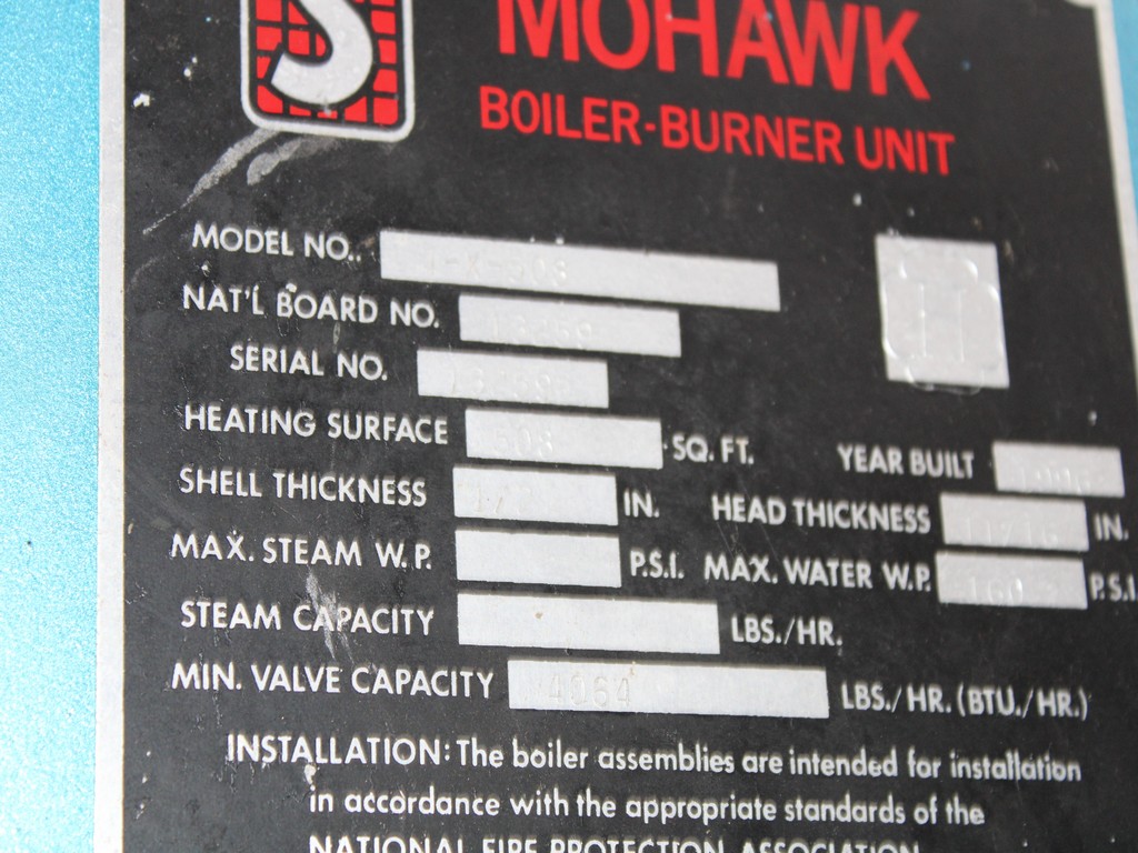 1996, Natural Gas Fired, 508-Square Feet Heating Surface, 160-PSI, 4064-BTU/Hour Minimum Valve Capacity, 1/2" Shell Thickness, HONEYWELL Burner Control, New Burner Center on 9/19/2019.