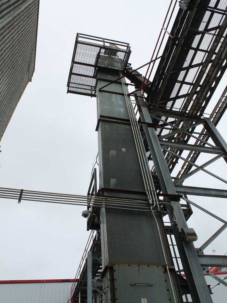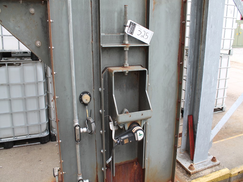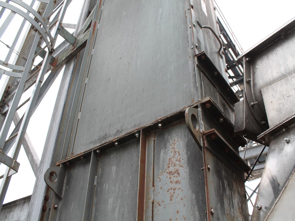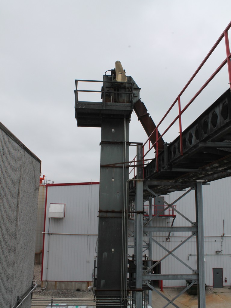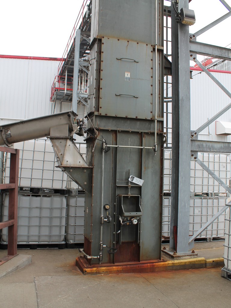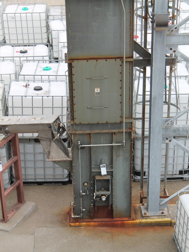 No. BE-615 Bucket Elevator, Continuous Discharge, 14" x 42" Steel Casing, 37'-11"H Discharge, (130) 8" x 5" Style MF Nylon Buckets, TEFC 3-HP Drive Motor with a Dodge SPD Gear Reducer, Cotterman 2-Stage Ladder with Safety Cages. NOTE: Does Not Include Pelco Security Camera.
