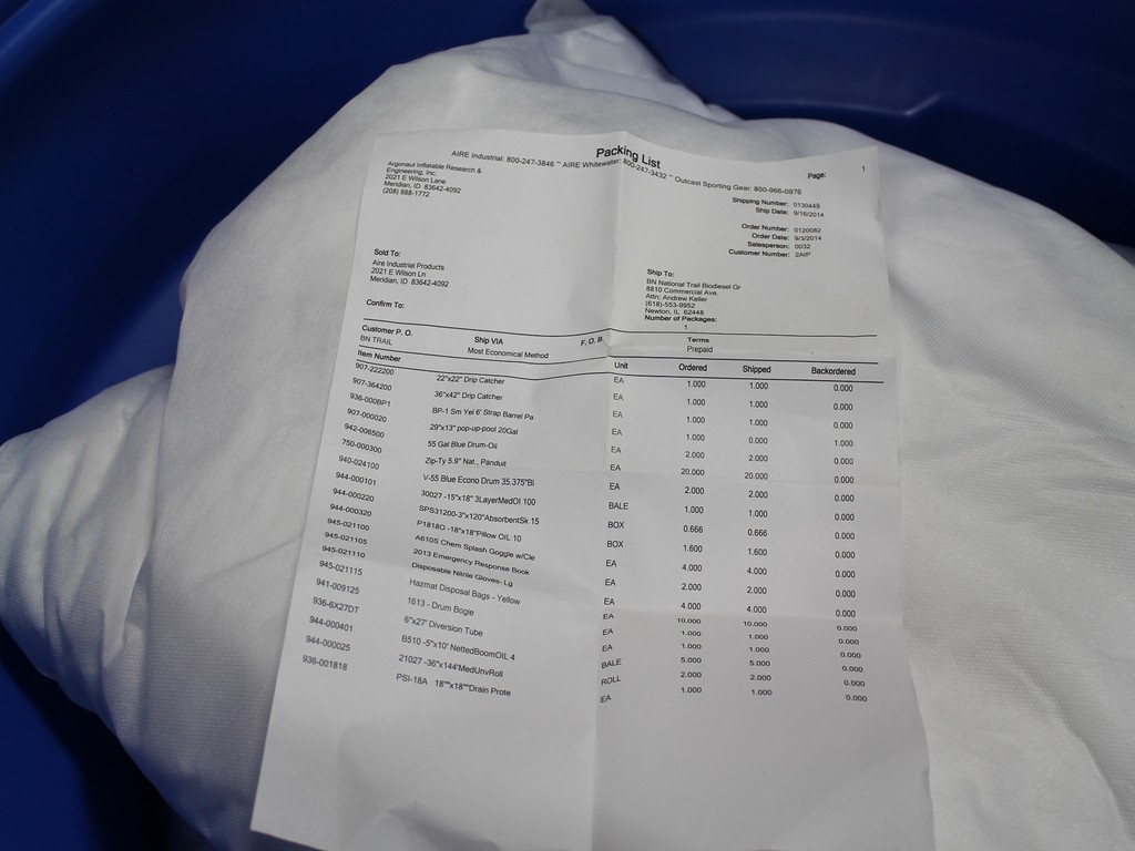 Consisting of but not necessarily limited to: EAGLE Model 1613 Drum Bogie; SMS Dimpled Pads, 2-Bales at 100 per Bale; 3-Prosorbents B510 Sock Net Boom, 5" Dia. x 10'L; 2-Rolls Med Unv Rolls, 36" x 144'; 2-V-55 Blue Oil Drums with Sealable Lids; Nitrile Gloves; Yellow Hazmat Disposable Bags, etc.