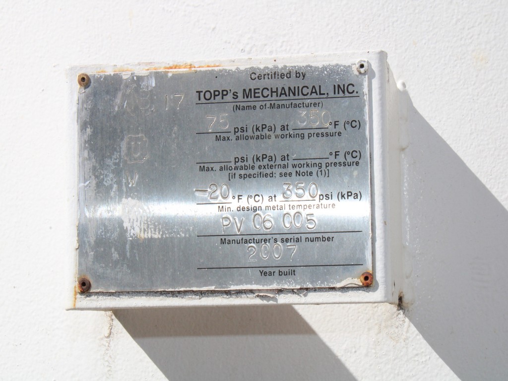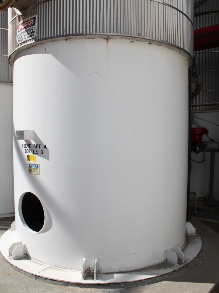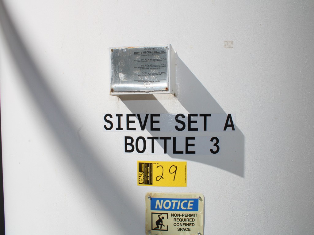 Sieve Set A Bottle 3, 2007, Carbon Steel, 90" Diameter Tank, 288" Long Tank Body, 7,930 Gallons, Dome Top and Bottom, Manway and Base Ring, (2) 90" Diameter 0.028" Size 304 SS Wire Mesh, 6" and 4" Bottom Outlets, (2) 10" and (1) 18" Top Outlets, Design: 75-PSI Full Vacuum, 350deg. F Temperature, Operation: 50-PSI Full Vacuum, 300deg. F Temperature, Empty Weight 19,200 lbs. NOTE: Unit has been removed from service since photos were taken and is now located in the West storage yard.