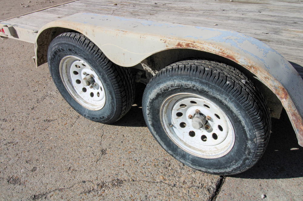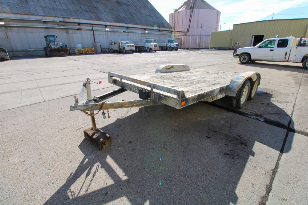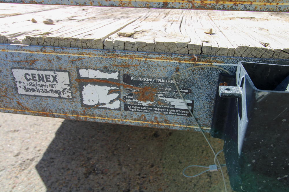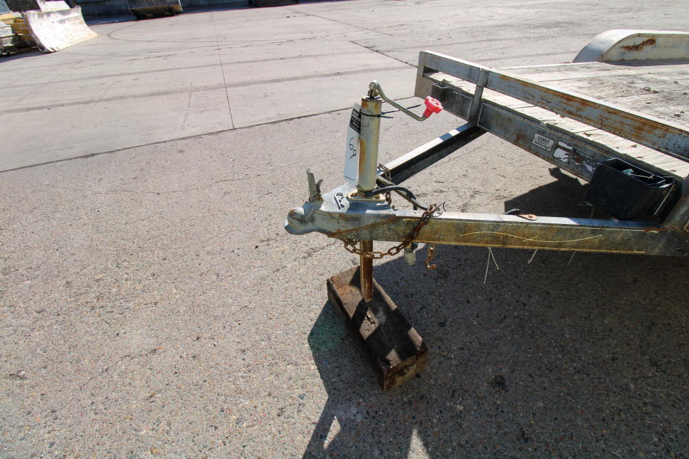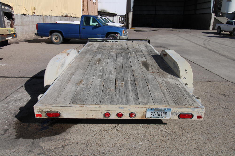 2001, Tandem Axle, Single Rear Wheels, 14,000# GVWR, 20'L Deck, 4' Beavertail, Fold Down Ramps, Ground Bearing, Modified Welded Steps Covering Ramp/Beavertail, Stake Pockets, Chain Rail