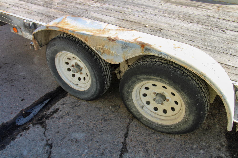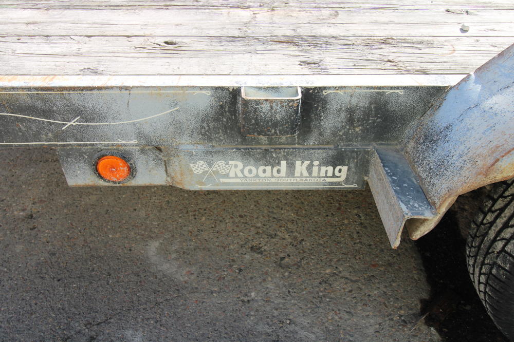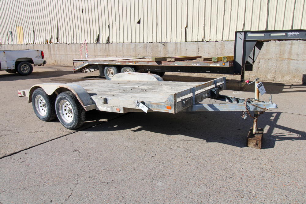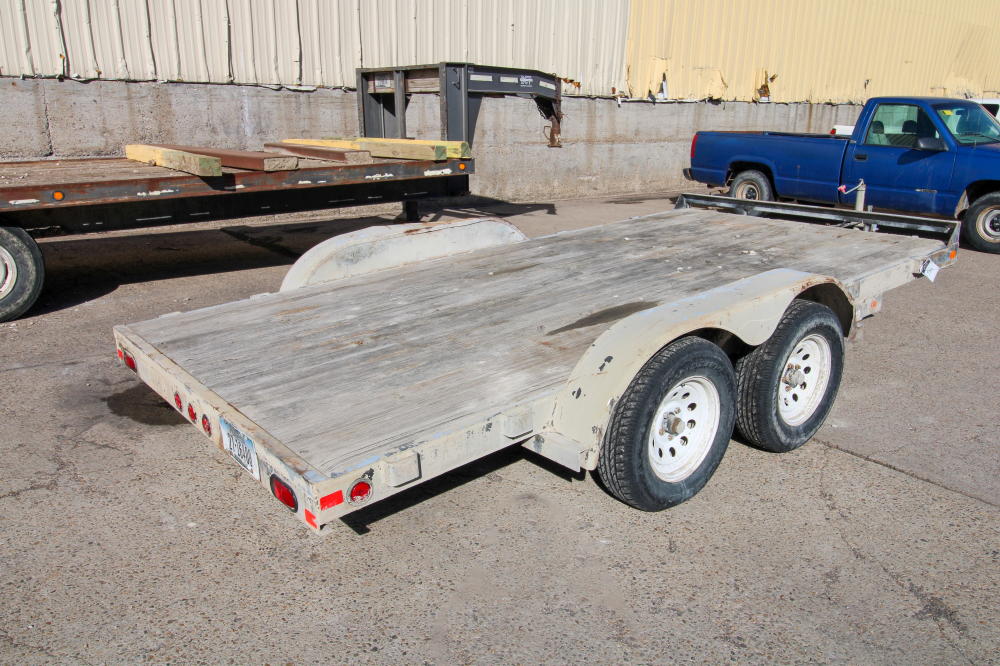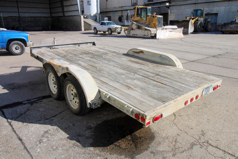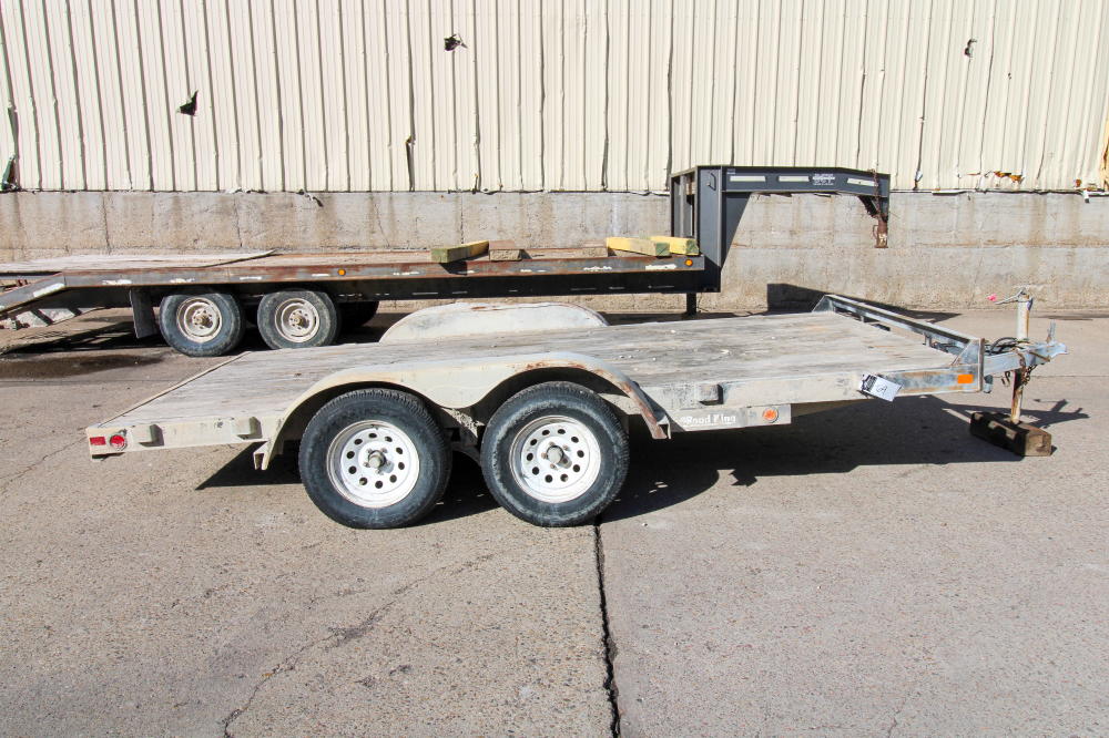 2001, Tandem Axle, Single Rear Wheels, 14,000# GVWR, 20'L Deck, 4' Beavertail, Fold Down Ramps, Ground Bearing, Modified Welded Steps Covering Ramp/Beavertail, Stake Pockets, Chain Rail