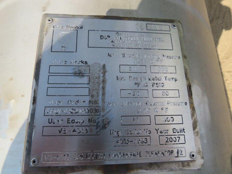 Condensate Seperator: Mfg by DCR Construction Inc. Max Pressure 50psi @300F. NB #210 Serial number 4513-7793, Built in 2007