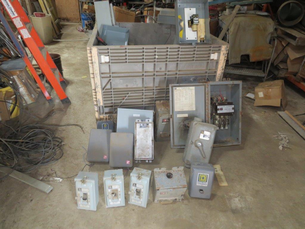 Crate of Electric Items: 39- Nema 1 starters; 2- Nema 2 starters; 1- Nema 3 starters; 2- Empty Starter Boxes; 1- 225amp Circuit Breaker; 1- 100 amp Circuit Breaker; 2- Time Clocks; 3- Square D Magnetic Relays, Class 9065, Type A0112, Series A, New.