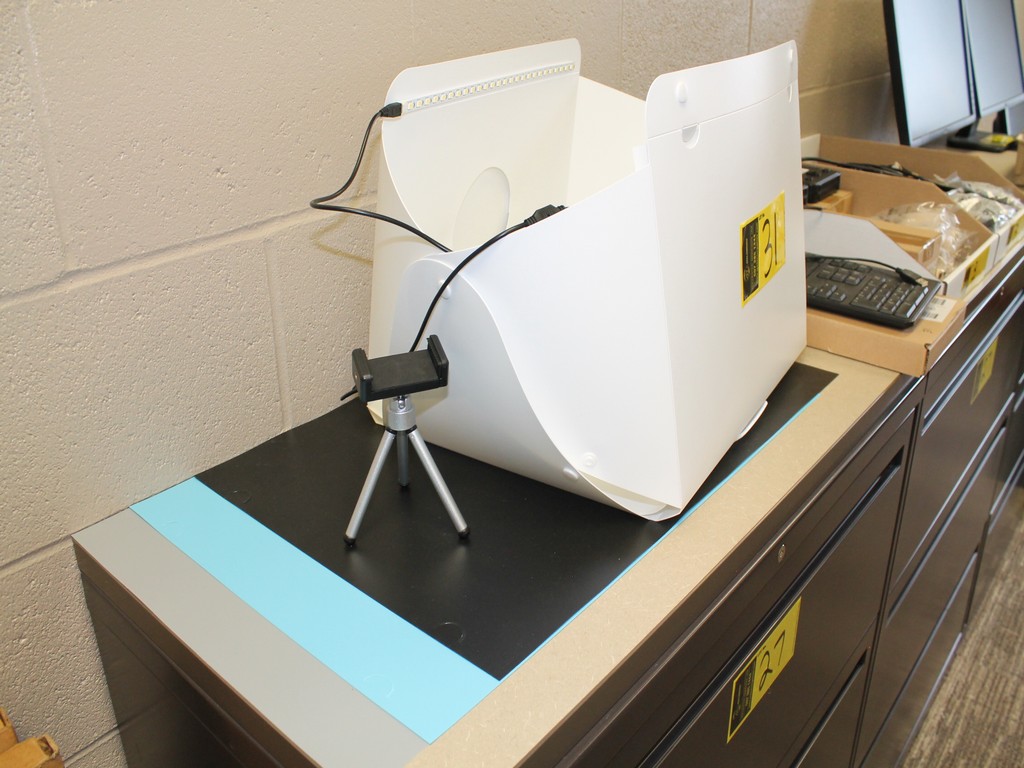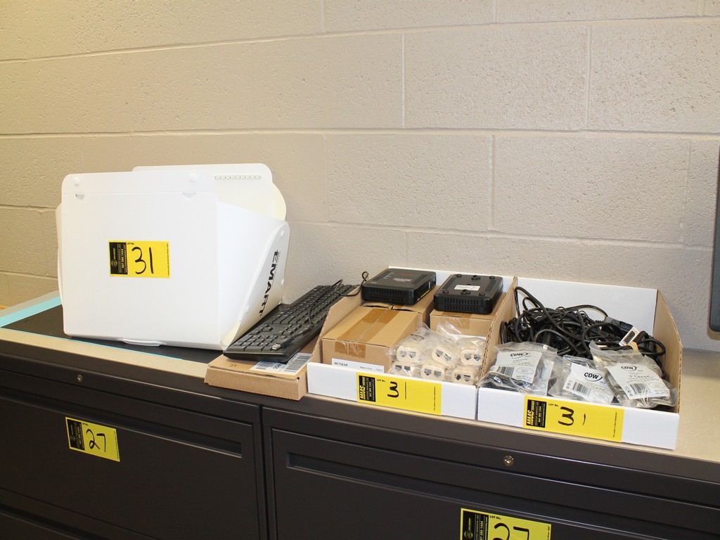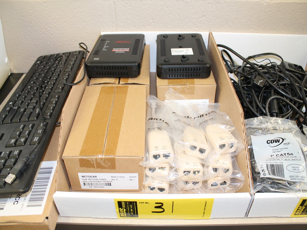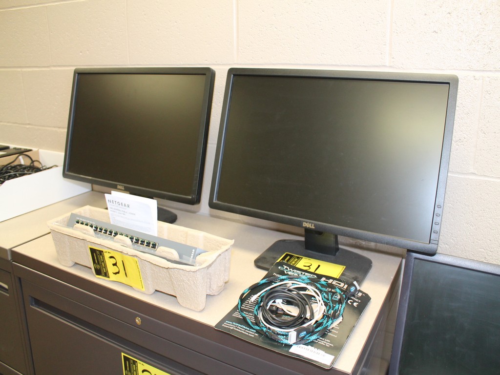Consisting of but not limited to: Laptop Computer, Core i5 Processor, Windows 7; Dell Docking Station; Wired Keyboard and Mouse; (2) 22" Wide Screen Monitors; (3) Frontier B90-755044-15 Routers; Netgear ProSafe 16-Port Gigabit Click Switch; Miscellaneous Wires; Portable Product Camera Box and LED Light Strip; Cell Phone Tripod; 3'H x 4'L Wall Mounted Dry Erase Board.