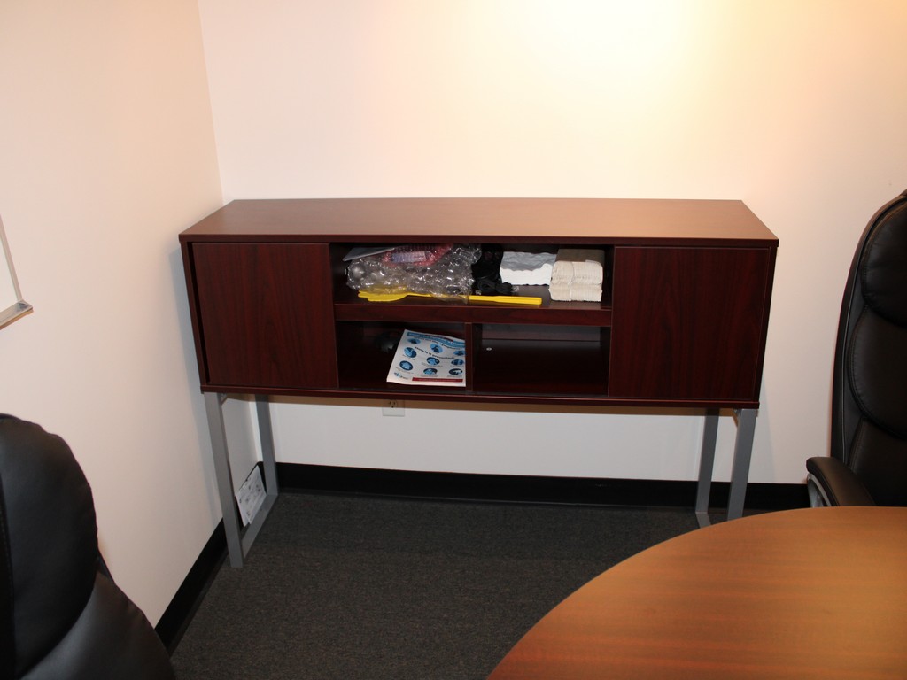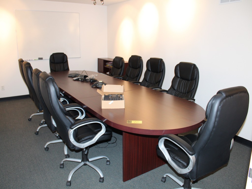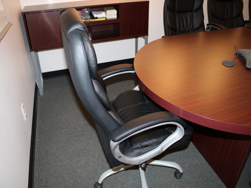 Consisting of but not limited to: (10) Leather Executive Office Chairs, Mesh Back, Arm Rests, 5-Roller Base; 165"L x Approximately 4'W Oval Conference Table, Wood Grain Laminate Top, 47"L Leaf, 3-Pedestal Base; 15"W x 49"L x 16"T Wood Cabinet, (2) Cabinets, (2) Shelves, On Metal Legs.