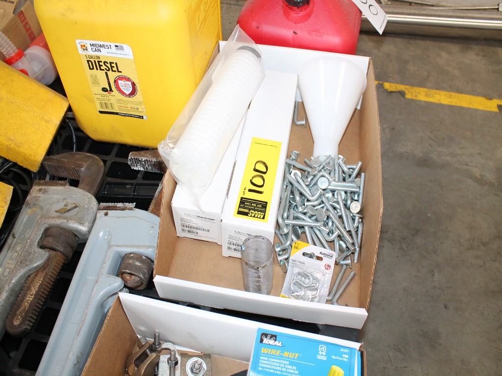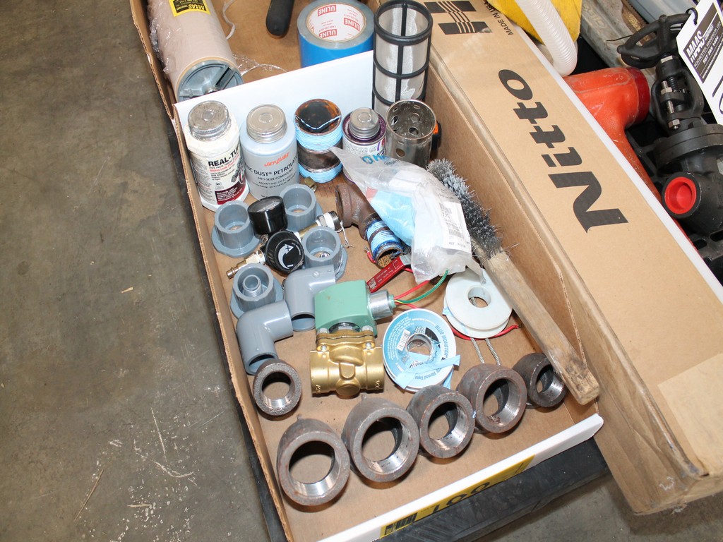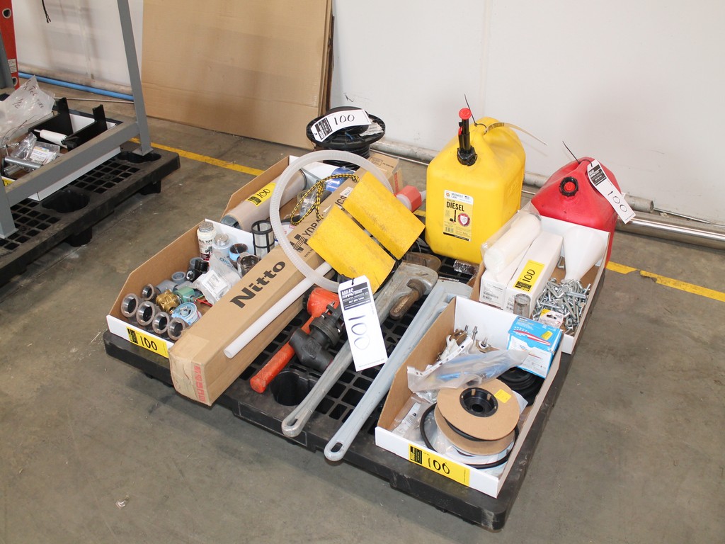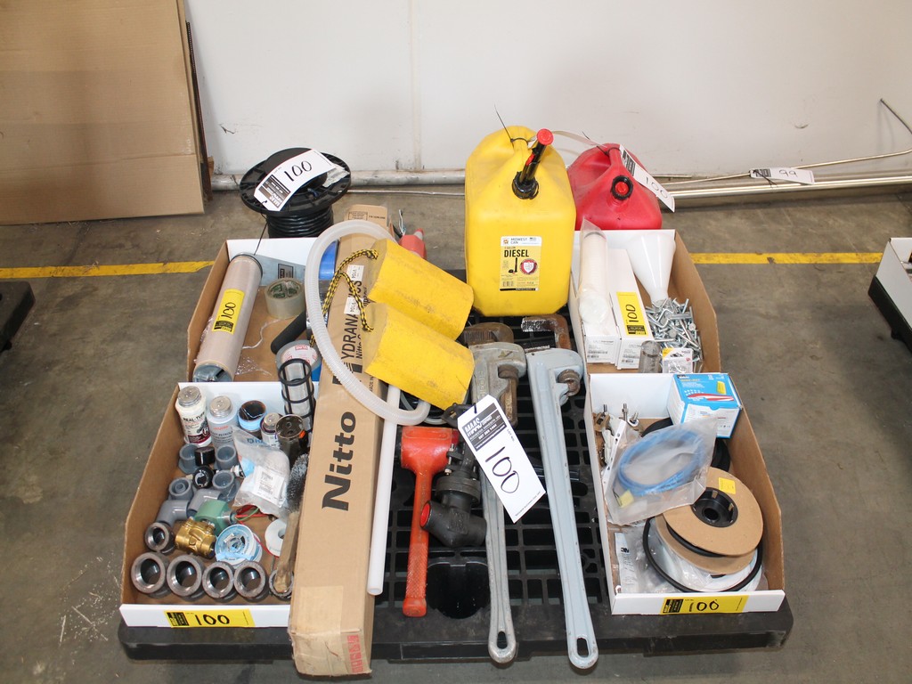 Consisting of but not limited to: Plastic Pallet, (2) Ridgid Aluminum 36" Pipe Wrenches; Flow Serve 1" Gate Valve; Nitto PN 10295 2000 Filter; (3) Microvantage 10" Filters; Wire Nuts; Packaging Tape; Clear Wrap; Various PVC/Black Pipe Fittings; Wheel Chocks; Plastic Gas Can and Diesel Can.