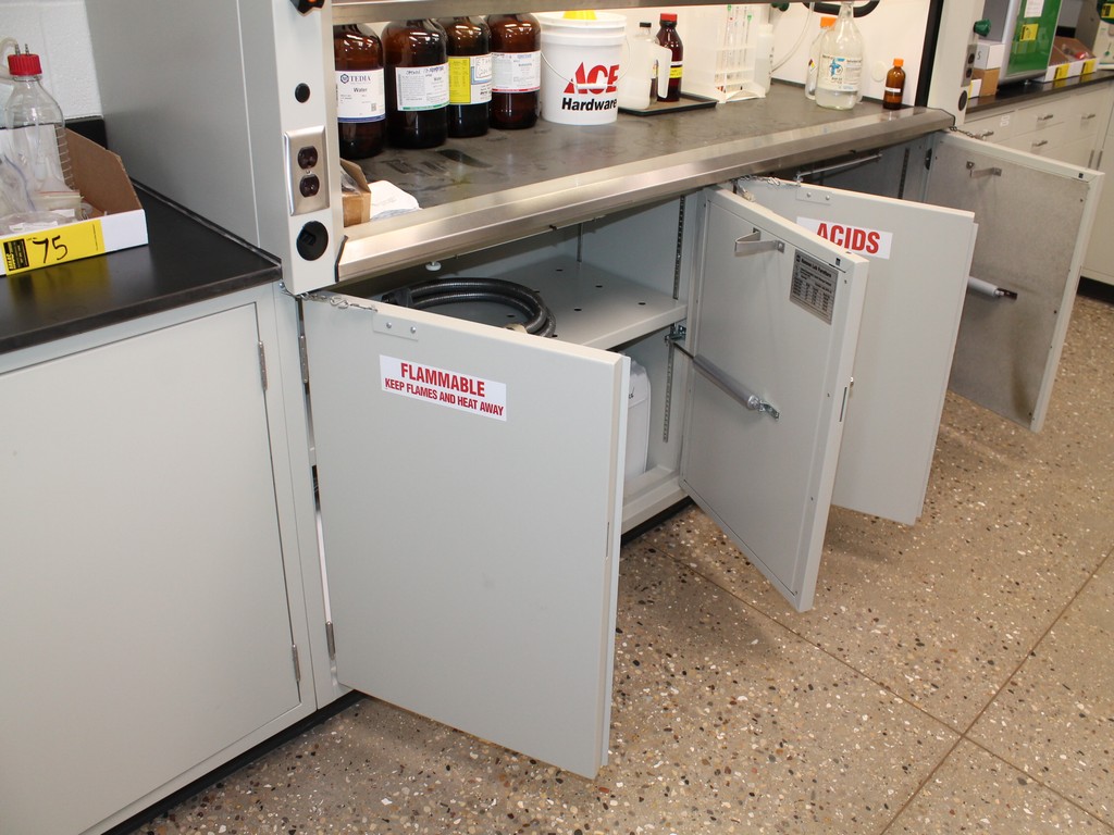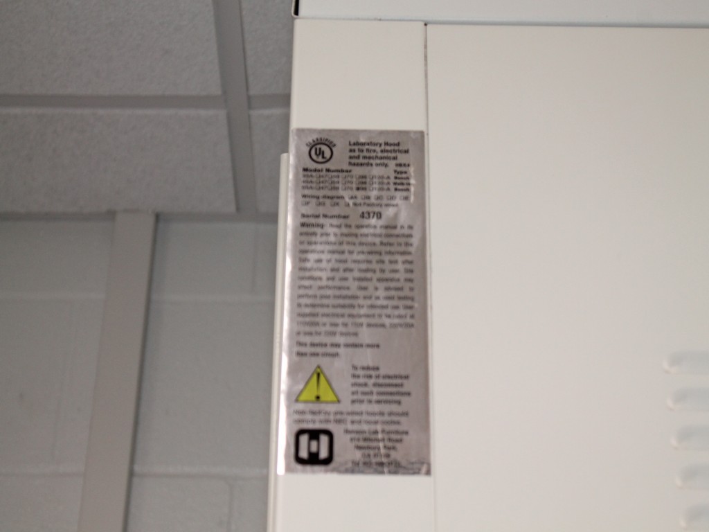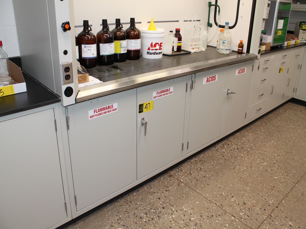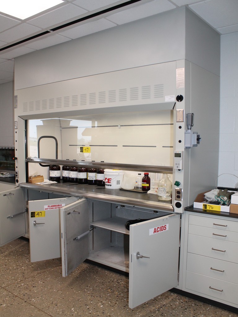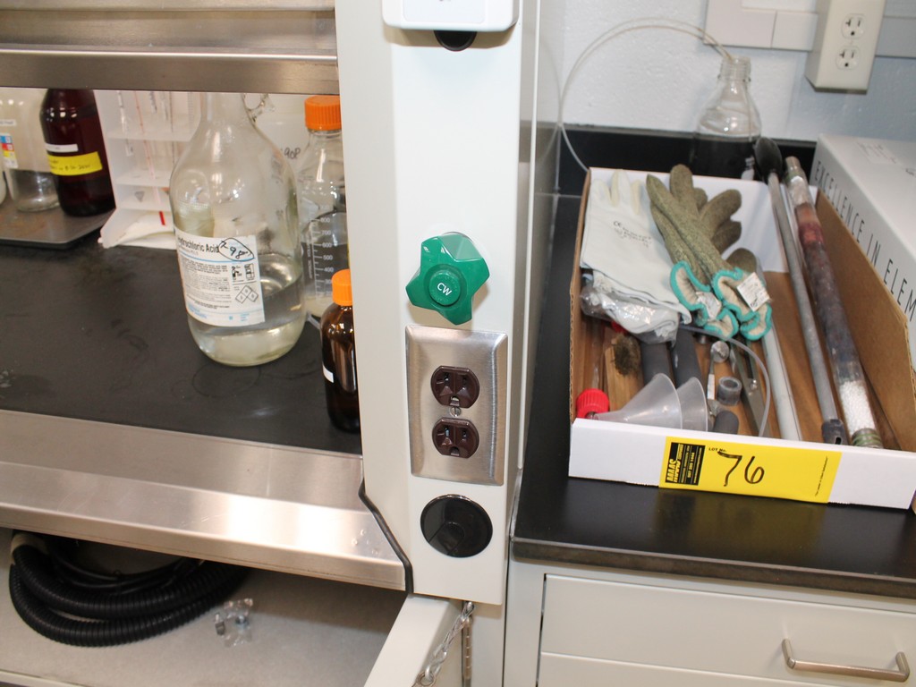 Consisting of but not limited to: Laboratory Fume Hood, 96"W, Exhaust, (2) Explosion Proof Lights, Flammable Liquid Storage Under Cabinets, Includes Miscellaneous Contents. NOTE: Buyer must have Electrical and Gas Supplies Capped, along with any Roof or Wall Penetrations.