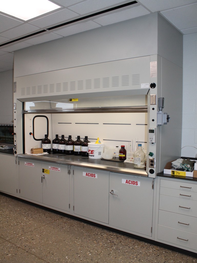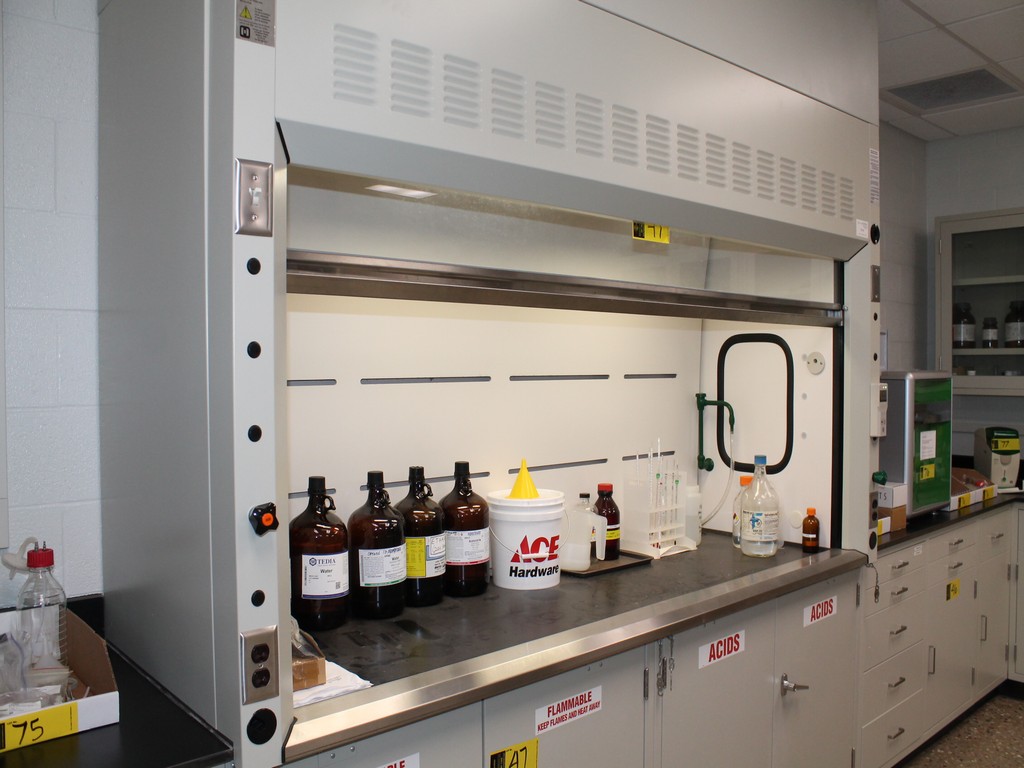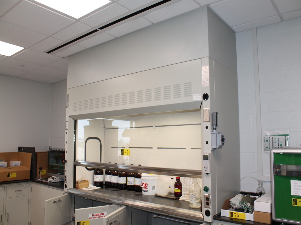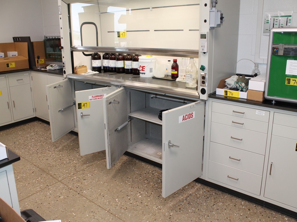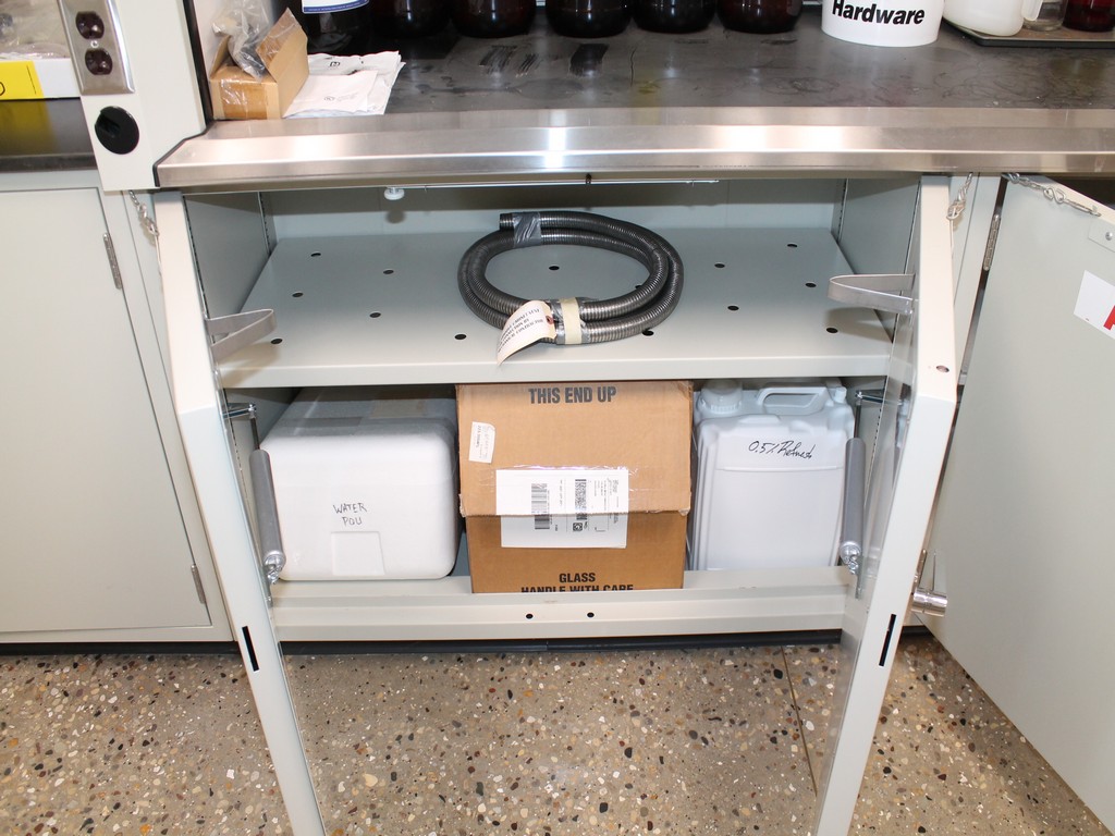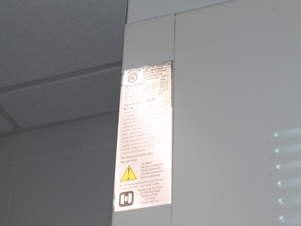 Consisting of but not limited to: Laboratory Fume Hood, 96"W, Exhaust, (2) Explosion Proof Lights, Flammable Liquid Storage Under Cabinets, Includes Miscellaneous Contents. NOTE: Buyer must have Electrical and Gas Supplies Capped, along with any Roof or Wall Penetrations.