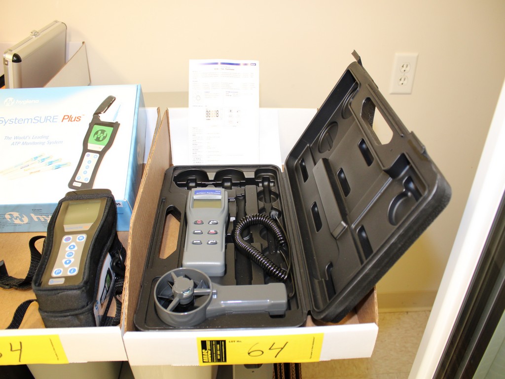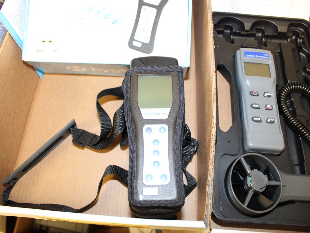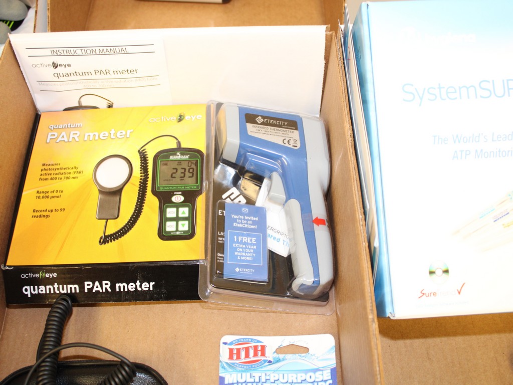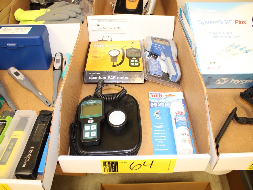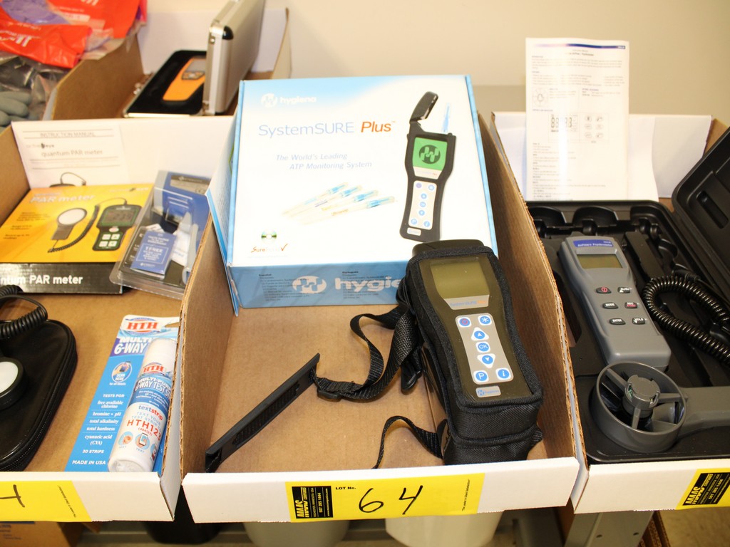 Consisting of but not limited to: HYGIENA SystemSURE Plus Luminometer, Stand, Hand Held; MASTERCOOL Airflow + Psychrometer 52236, Hand Held, Case; ACTIVE EYE Quantum Par Meter, Hand Held; ETEKCITY Lasergrip 1022 Infared Thermometer; HTH 6-Way Test Strips; TEMTOP M2000C Air Quality Tester, Hand Held, Case; Various Hand Held Probes; EXSTIK Chlorine Meter; (4) ACURITE Thermometers; OAKTON EcoTester; pH Meter; VIVOSUN TDS & EC Meter; VIVOSUN RMC Chlorinated Alkalinity Drop Count Test Kit; (2) 13-Gallon Trash Cans; 5-Gallon Trash Can; HYDRITE Multiquat #455 Test Kit; (2) SAN-I-KING #451 Test Kits; (3) FOAM BRITE #377 Test Kits; (2) PACE CHEMICALS Quat Test Kit Low Range; Open EXTECH Chlorine Box of 1000 Tablets; ISOBAR IB6 Noise Filter & Surge Protector; Various Extension Cords.