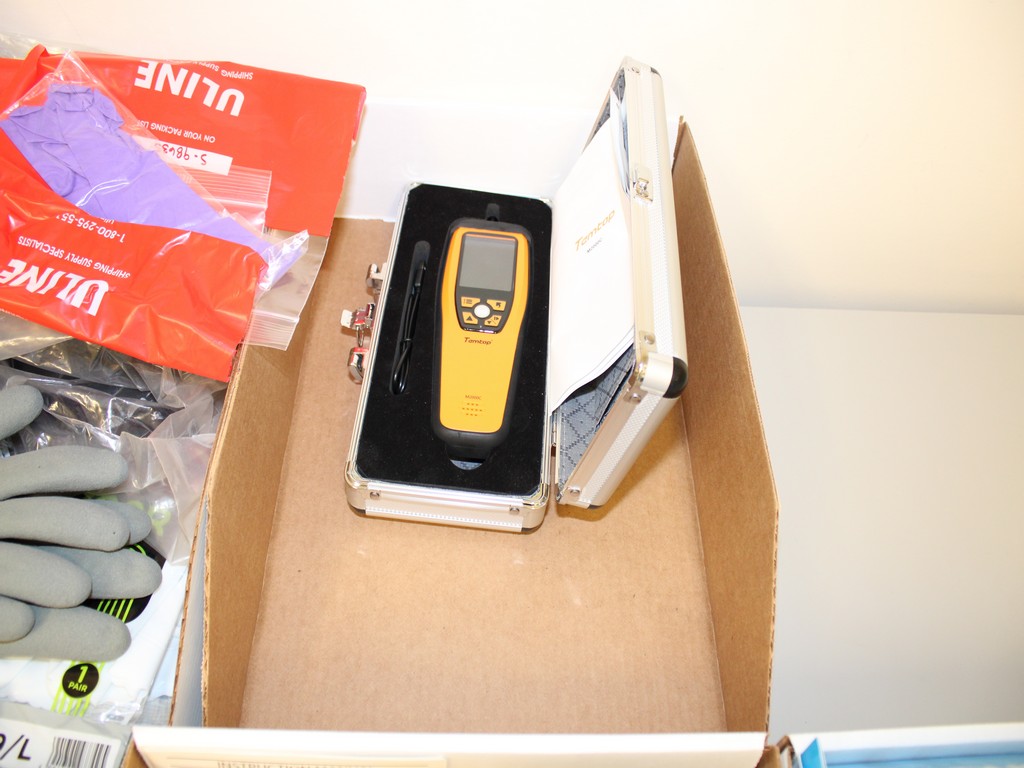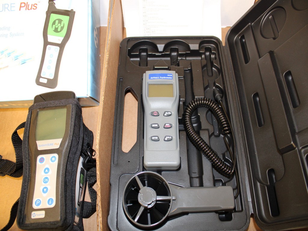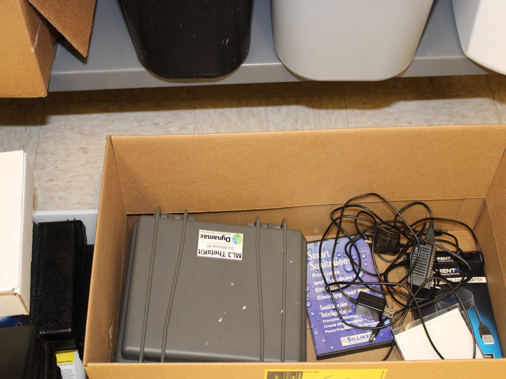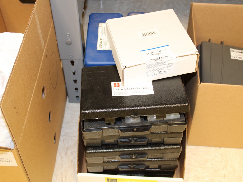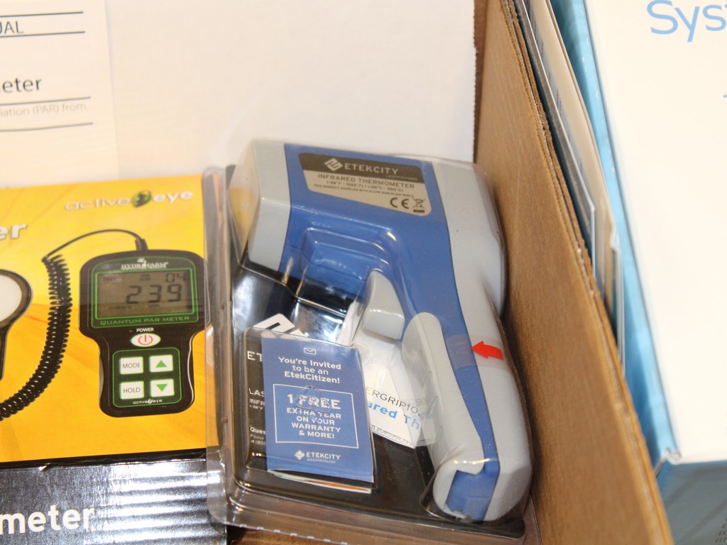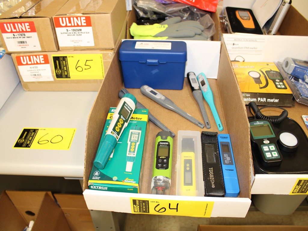 Consisting of but not limited to: HYGIENA SystemSURE Plus Luminometer, Stand, Hand Held; MASTERCOOL Airflow + Psychrometer 52236, Hand Held, Case; ACTIVE EYE Quantum Par Meter, Hand Held; ETEKCITY Lasergrip 1022 Infared Thermometer; HTH 6-Way Test Strips; TEMTOP M2000C Air Quality Tester, Hand Held, Case; Various Hand Held Probes; EXSTIK Chlorine Meter; (4) ACURITE Thermometers; OAKTON EcoTester; pH Meter; VIVOSUN TDS & EC Meter; VIVOSUN RMC Chlorinated Alkalinity Drop Count Test Kit; (2) 13-Gallon Trash Cans; 5-Gallon Trash Can; HYDRITE Multiquat #455 Test Kit; (2) SAN-I-KING #451 Test Kits; (3) FOAM BRITE #377 Test Kits; (2) PACE CHEMICALS Quat Test Kit Low Range; Open EXTECH Chlorine Box of 1000 Tablets; ISOBAR IB6 Noise Filter & Surge Protector; Various Extension Cords.