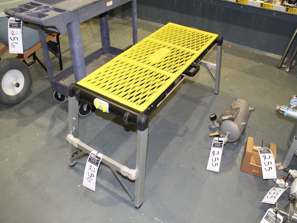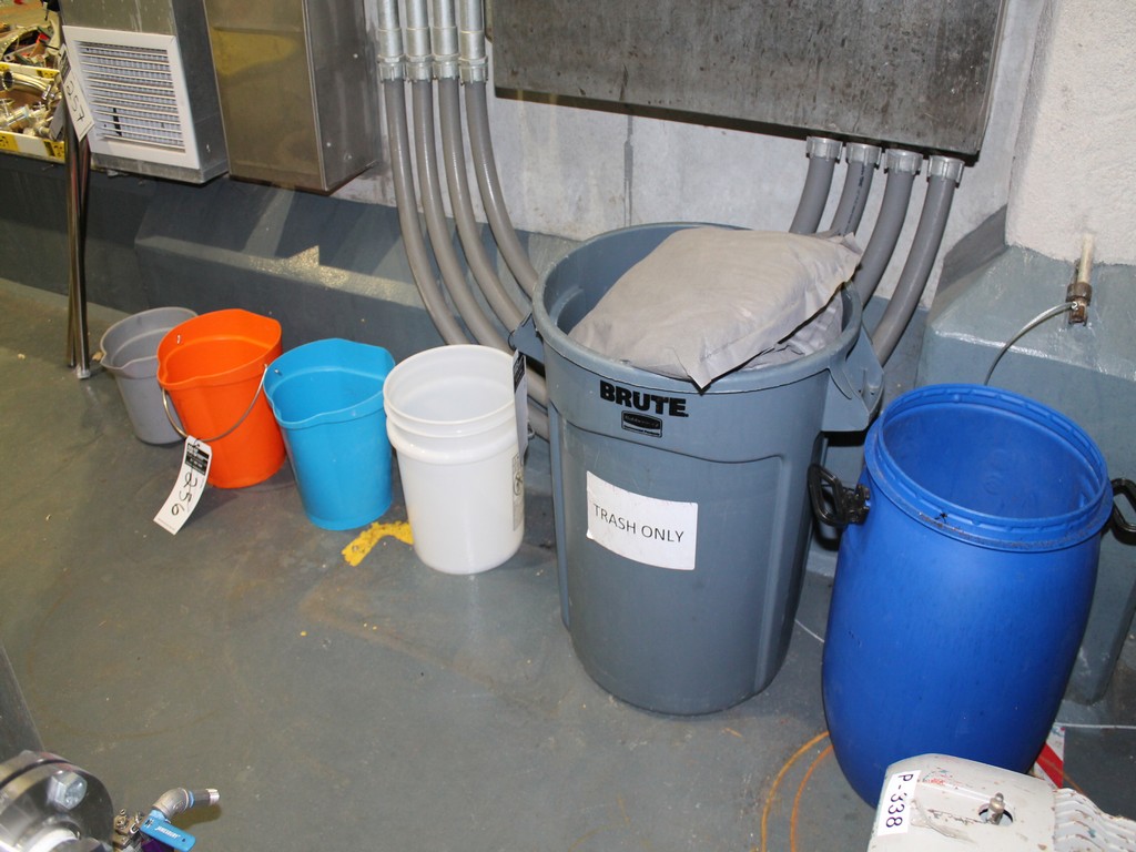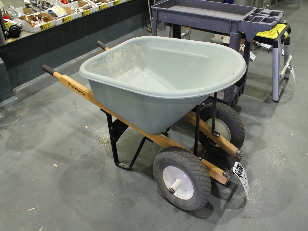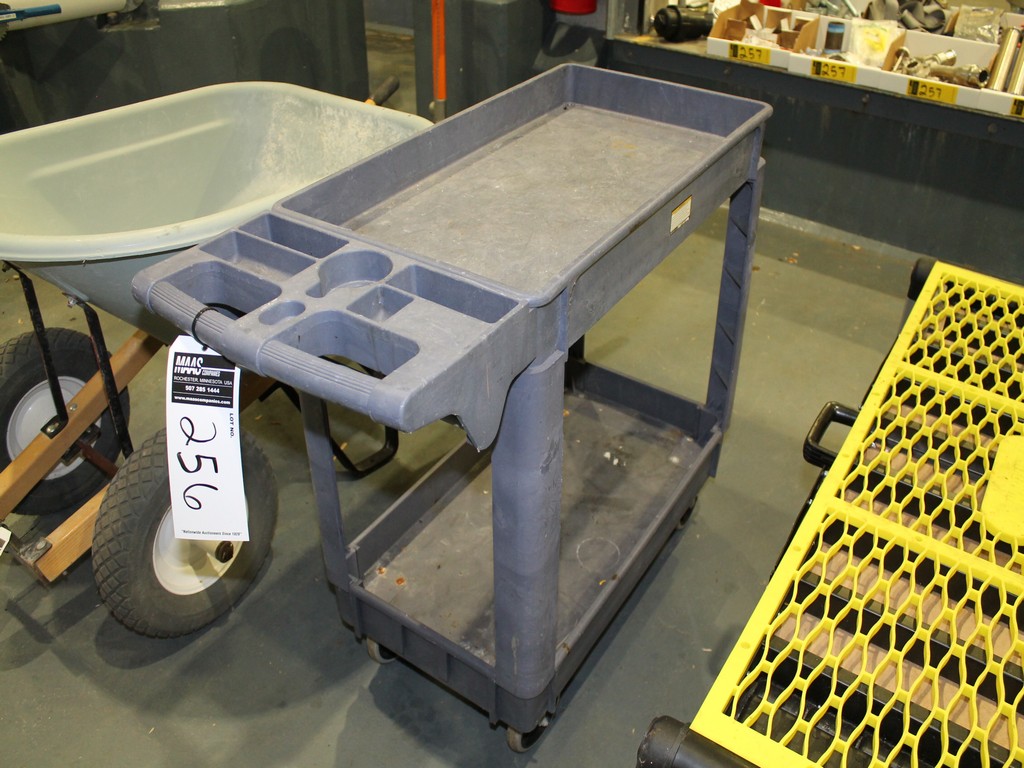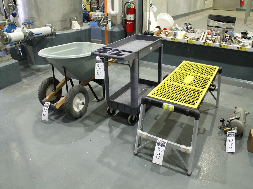 Consisting of but not limited to: Rubbermaid 4-Wheel Plastic Molded Cart with 2 Shelves; Brentwood Wheelbarrow with 2 Wheels; Performax Folding Work Table/Scaffold, Adjustable Height, 19"W x 4'L Work Surface; (3) Mop Buckets; 5 Gallon Plastic Bucket; Rubbermaid Brute Barrel; (4) Mid-States 040120M Drum Dollies; Rubbermaid 2650 Drum Dolly, 500# Capacity; Blue Barrel.
