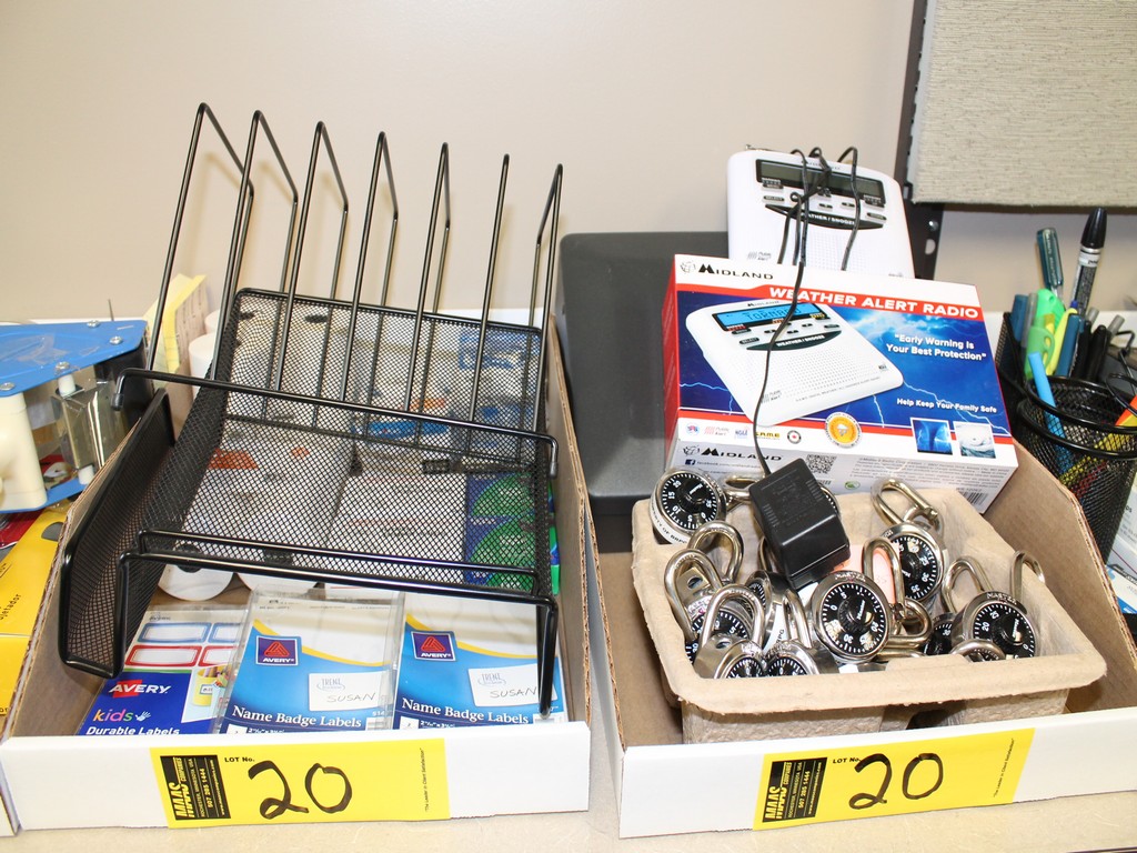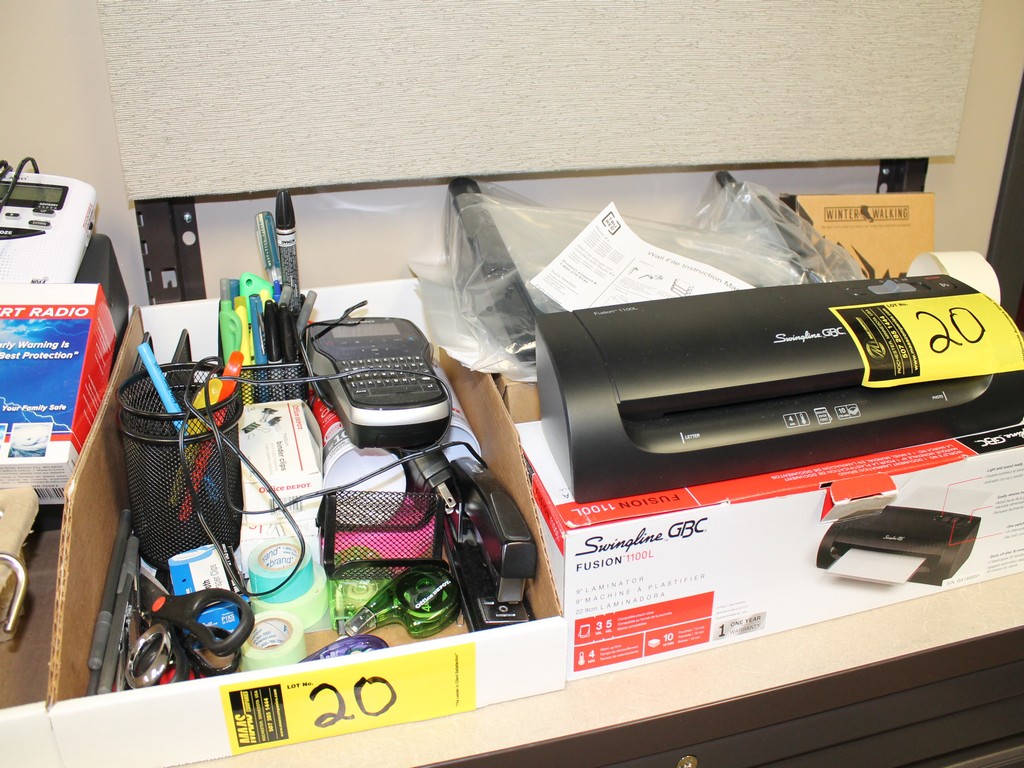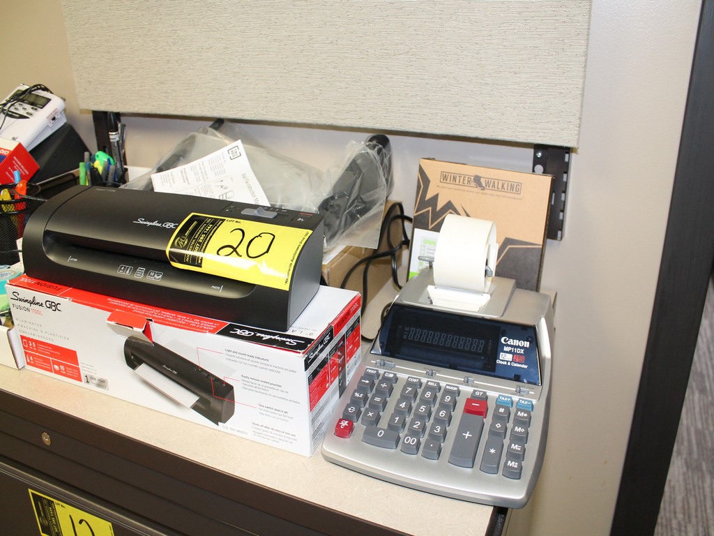 Consisting of but not limited to: Weather Radio; Combination Padlocks; Sentry Safe Cash Box; Swingline Fusion 1100L Laminator; Wall Files; Canon MP11DX Printing Calculator; 3-Hole Punch; Wall Clock on Wall; Uline 24"W Packing Paper Dispenser on Desk; GE Power Strip Under Desk; Dymo Label Manager 280 Label Maker; Boxes on Floor with (3) Desk Organizers; (6) File Organizers, etc.