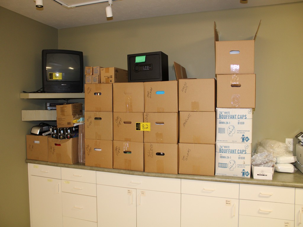 Consisting of but not limited to: (8) Boxes of Miscellaneous Office Supplies; STACKON Safe, 13?"L x 10"D x 10"W; HP LaserJet 202X Ink Cartridges; (11) Boxes of Various Sized: Gloves, Hair Nets, Beard Nets, Bouffant Caps; Box of ULINE Safety Glasses.