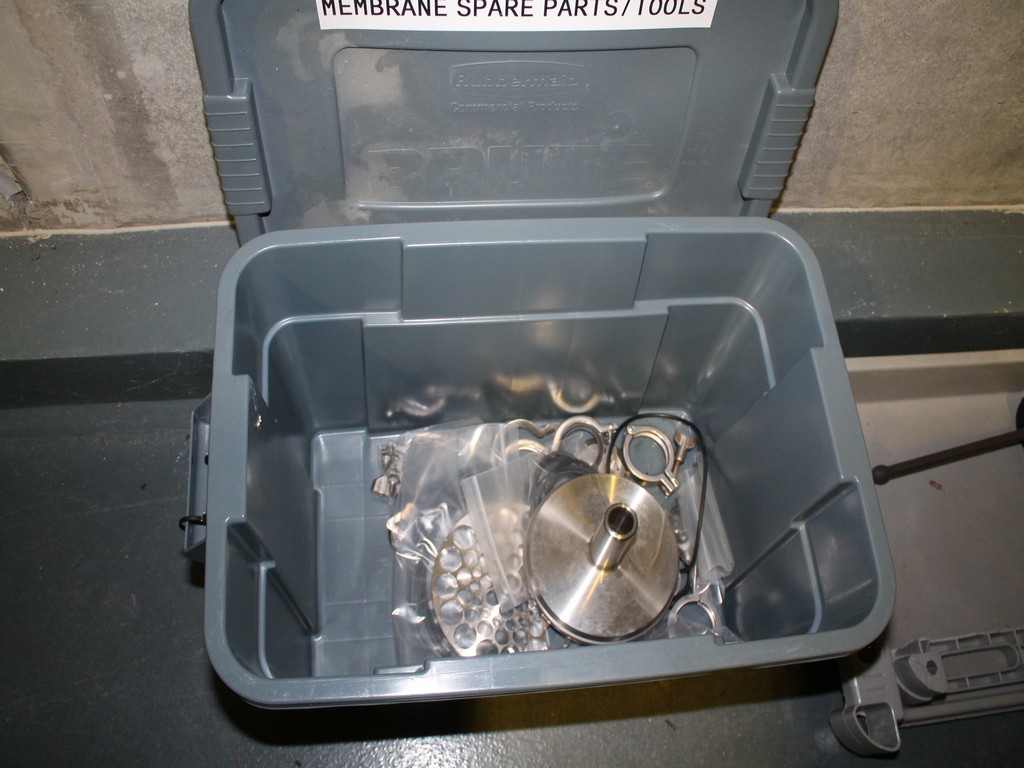 Consisting of but not limited to: Plastic Tote with Parts and Clamps; Plastic Tray with Miscellaneous Parts; Brute Plastic Trash Can with Membrane Rings; 2" Stainless Pipe with Flange; etc.