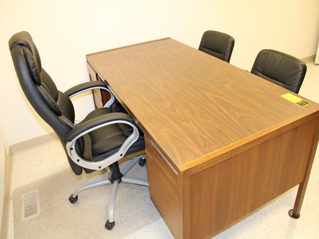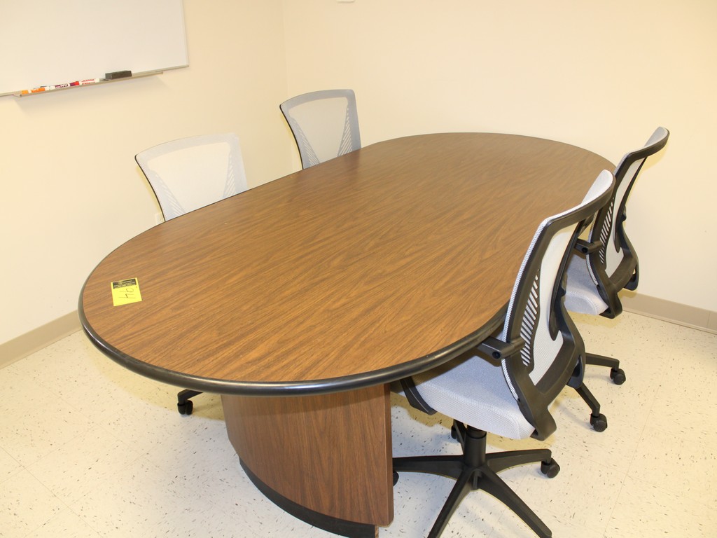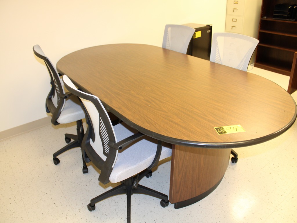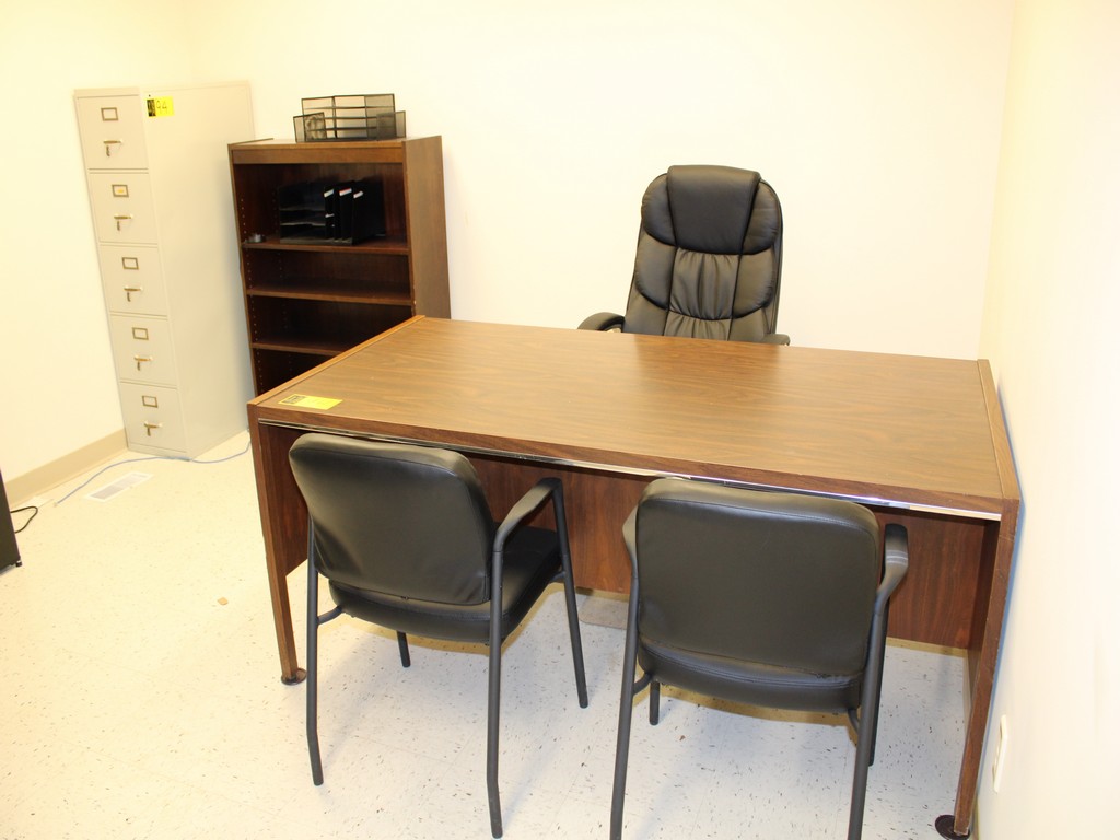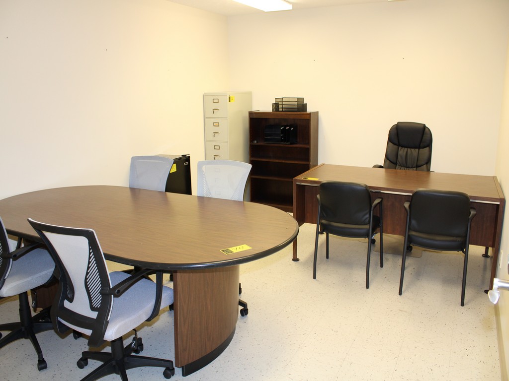 Consisting of but not limited to: 4'W x 8'L Oval Conference Table, Wood Grain Laminate; 3' x 6' Desk, Wood Grain Laminate, (5) Drawers, (4) Legs; (4) Executive Office Chair, Mesh Back, Arm Rests, 5-Roller Base; Leather Executive Office Chair, Mesh Back, Arm Rests, 5-Roller Base; (2) Leather Padded Guest Chairs, 4-Legs, Arm Rests; 15"W x 27"D x 57?"T Metal Filing Cabinet, (5) Drawers; 3'W x 4'T Wood Grain Laminate Bookcase.