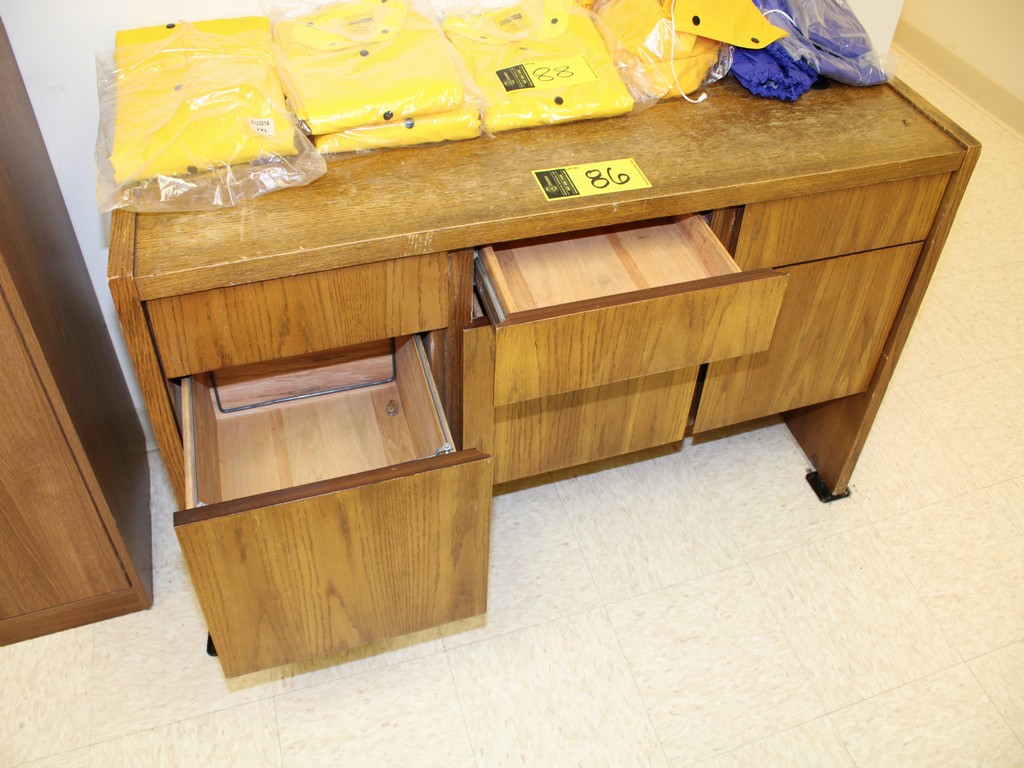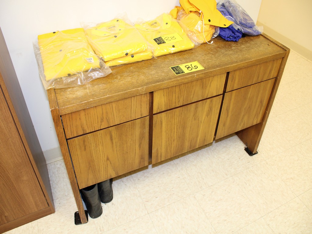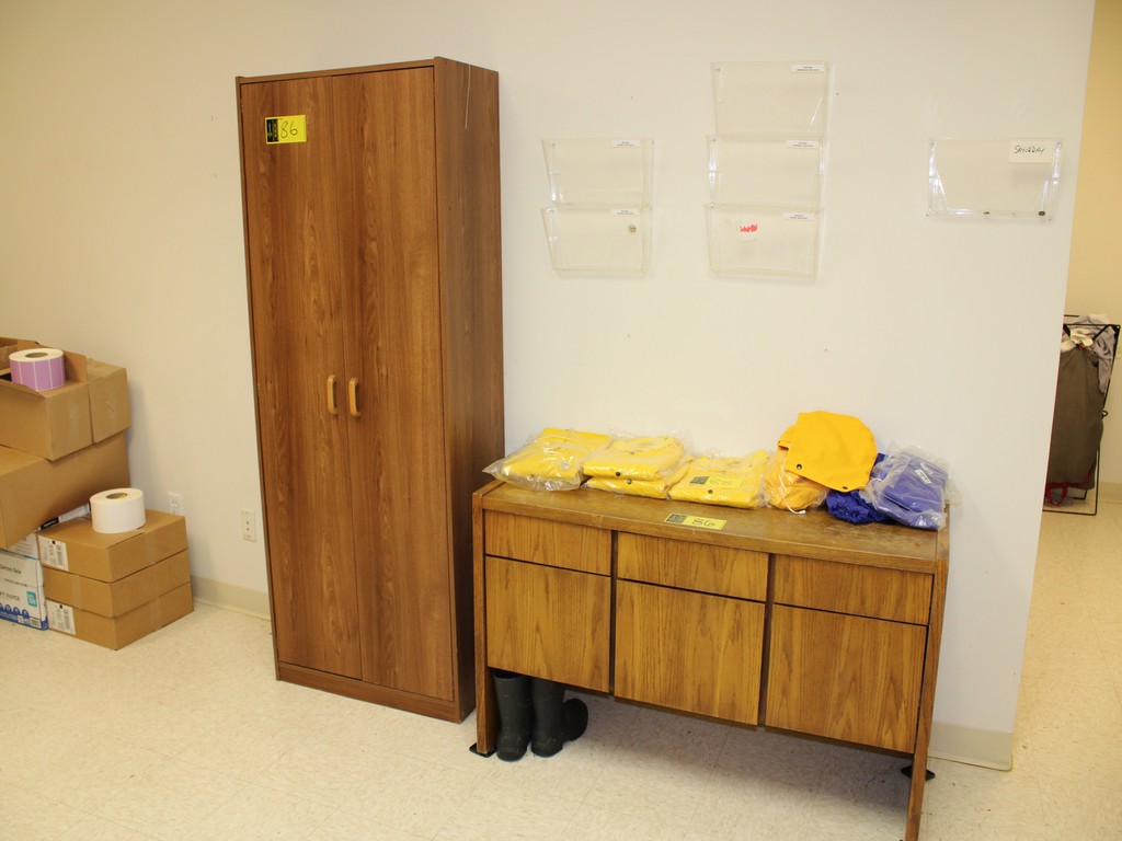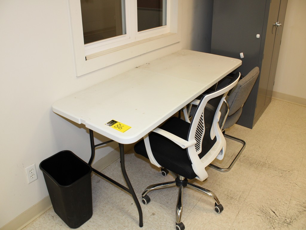 Consisting of but not limited to: COSCO 6'L Bifold Plastic Table; Executive Office Chair, Mesh Back, Arm Rests, 5-Roller Base; Padded Reception Chair, Sled Base; 3'W x 22"D x 78"T Metal Storage Cabinet, 2-Door; 49?"W x 20"D x 29"T Credenza, 6-Drawers, Wood; 29"W x 6'H Wood Cabinet, 2-Door.