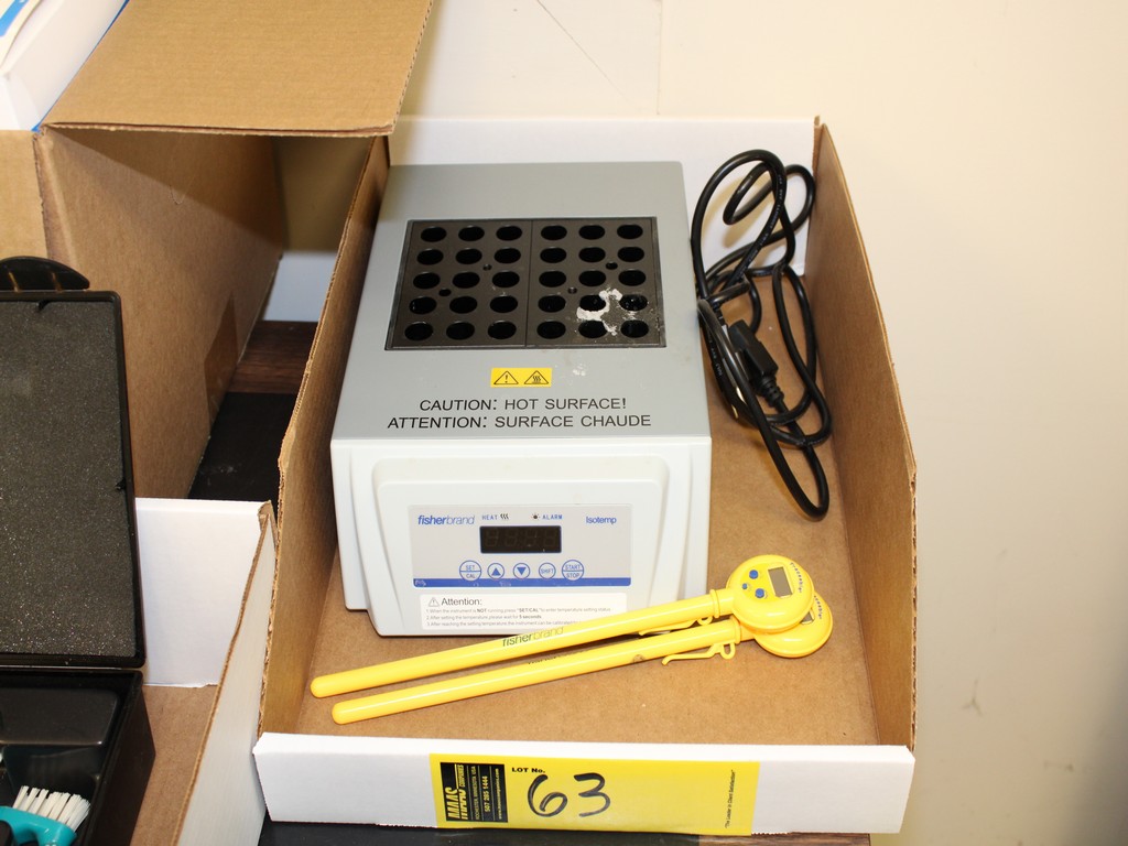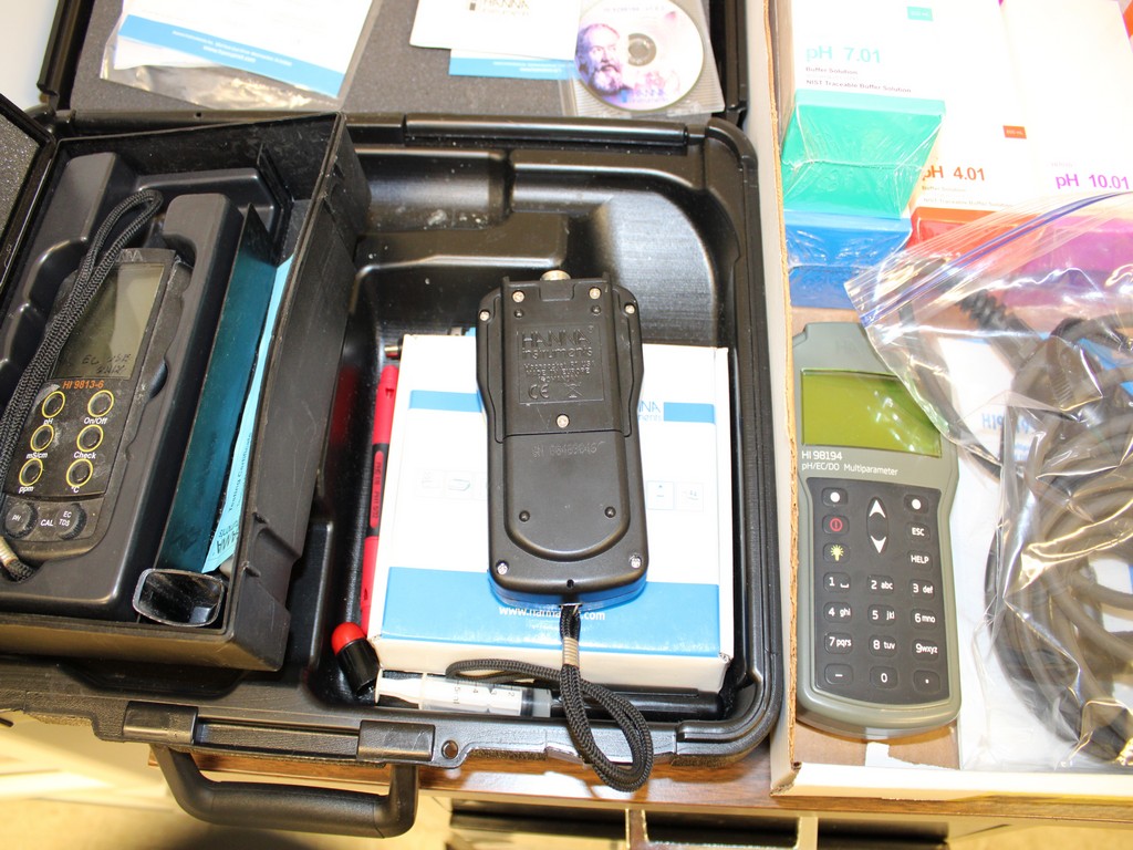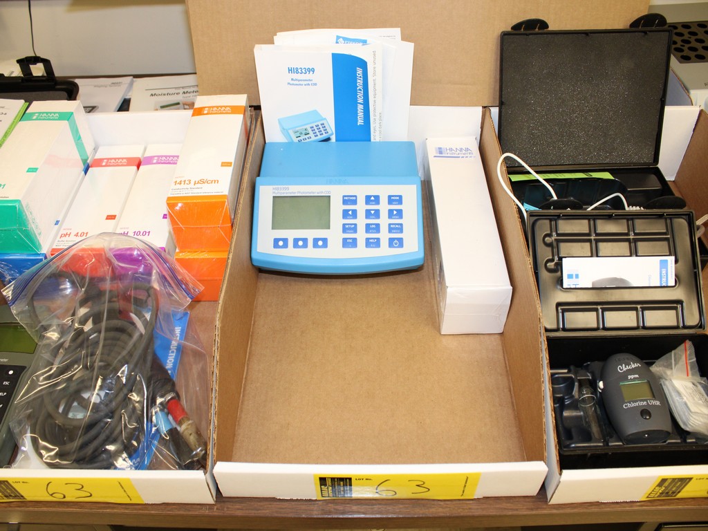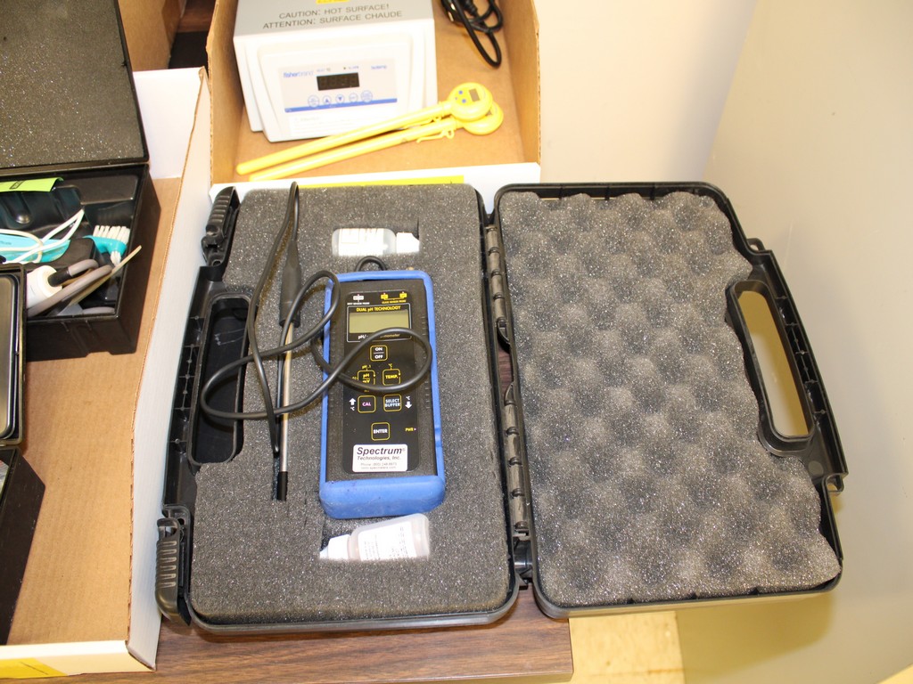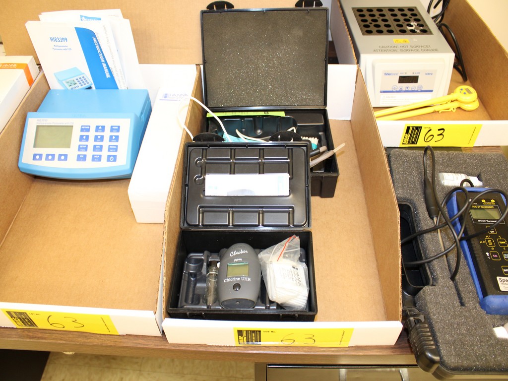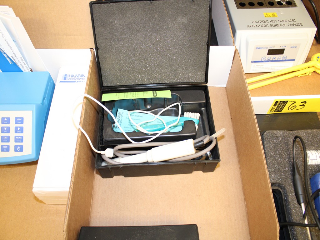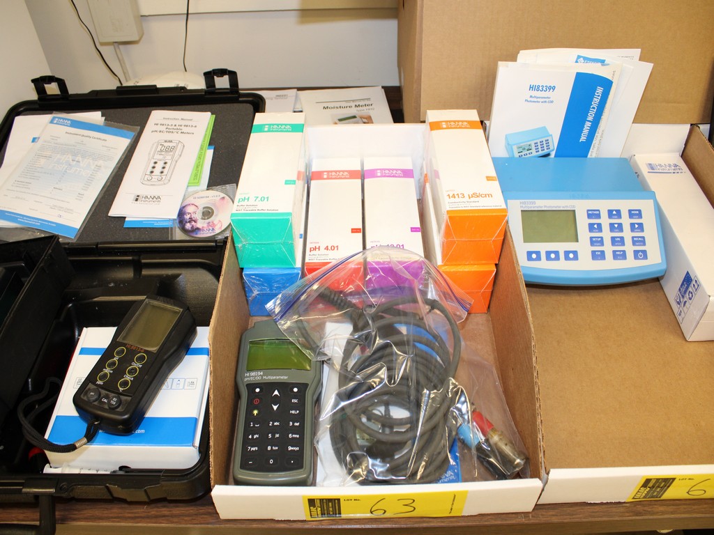 Consisting of but not limited to: SPECTRUM TECHNOLOGIES Dual pH Technology pH/mV/Thermometer, Hand Held, Sensor Probe, Case; FISHERBRAND FS Drybath Standard 2 Block, sn 14BF60022039; (2) FISHERBRAND Thermometers, digital, 8?"L; HANNA H1771 Chlorine Ultra High Range Checker, Handheld, case; HANNA H19813-6N pH Tester, Hand Held, Case; HANNA H183399 Multiparameter Photometer with COD, sn ACD0424100; Box of HANNA Equipment, (5) Probes, Total Nitrogen High Range 1 / 2, Calibration Packets, Maintenance Packets, Phosphate HR Regent 1, Nitrate, Sulfate, Chlorine; HANNA H198194 pH/EC/DO Multimeter, Hand Held Reader, 4-Sensor Probe; HANNA Various pH Buffer Solutions, Conductivity Solution; (2) HANNA H19813-6 pH/EC/TDS Thermometer Meter, Hand Held, Cases, Software.