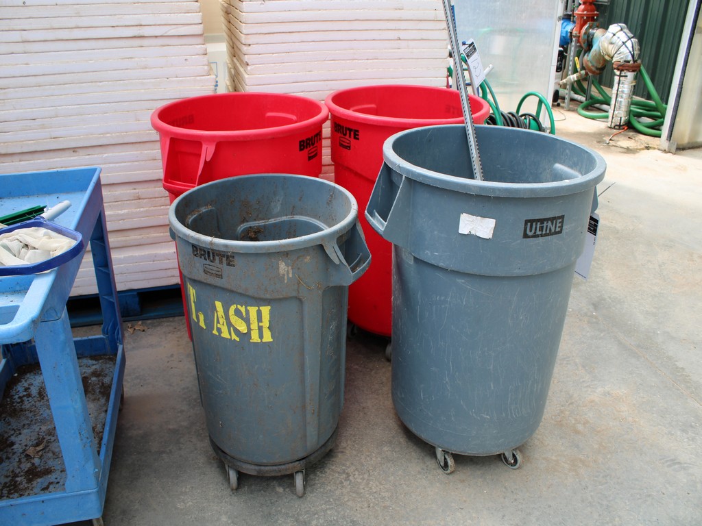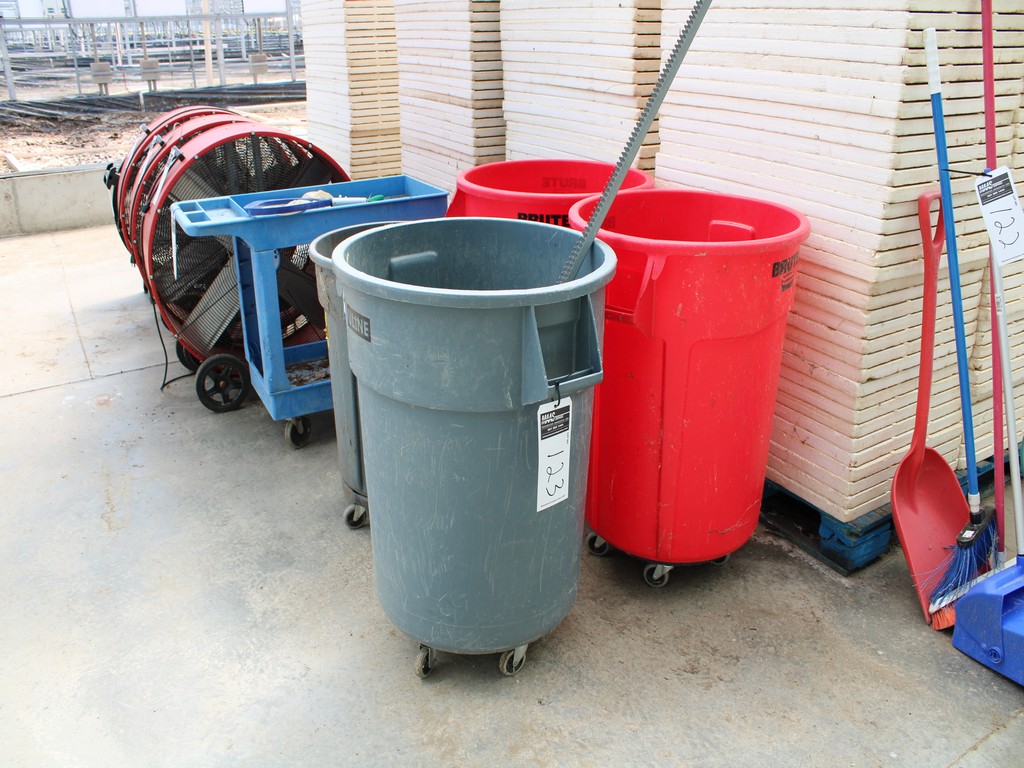 (2) BRUTE 55-Gallon Barrels, Red, on 4-Wheel Cart; ULINE 55-Gallon Barrel, on 4-Wheel Cart; BRUTE 30-Gallon Barrel, on 4-Wheel Cart.