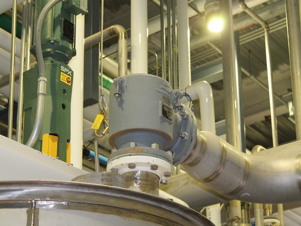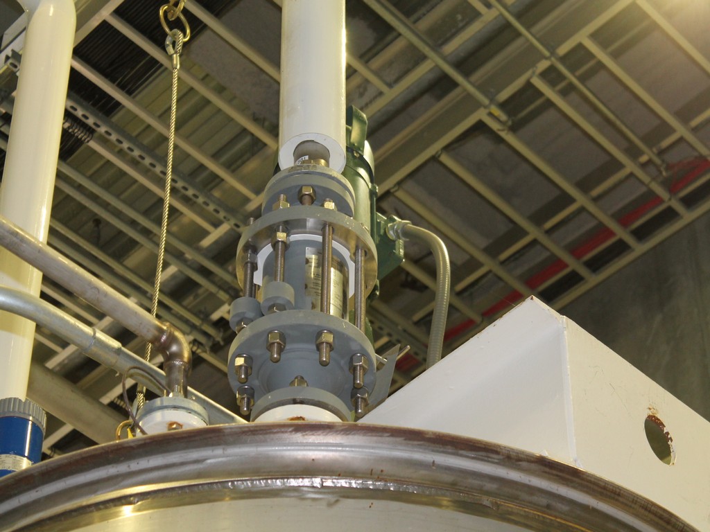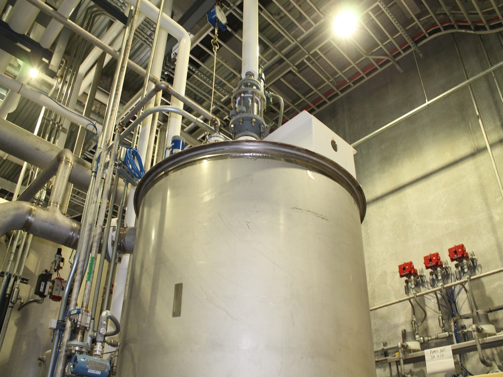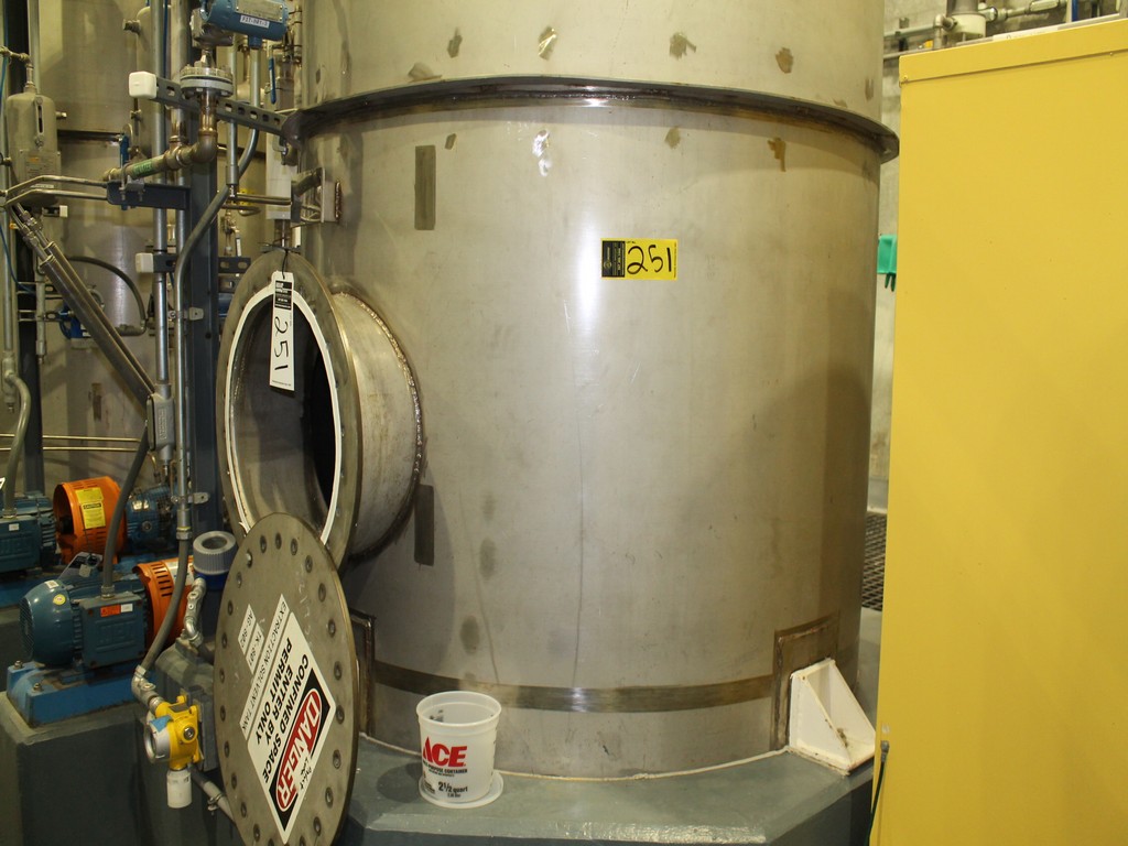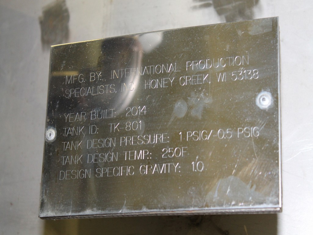 Consisting of but not limited to: 1000 Gallons, T-304L Stainless Steel, 60" Diameter x 96" Shell, Internal Sloped Bottom, Exterior Flat Bottom, Flat Top, Vertical, Single Wall, 20" Diameter Manway, Gusseted Agitator Flange, (3) 5"W x 60"L Anti-Swirl Baffles, Various Other Outlets and Inlets; Top Mounted Agitator; Protectoseal F25002 Flame Arrestor; Temperature Transmitter; Foxboro LR01 Free Space Radar Level Meter.