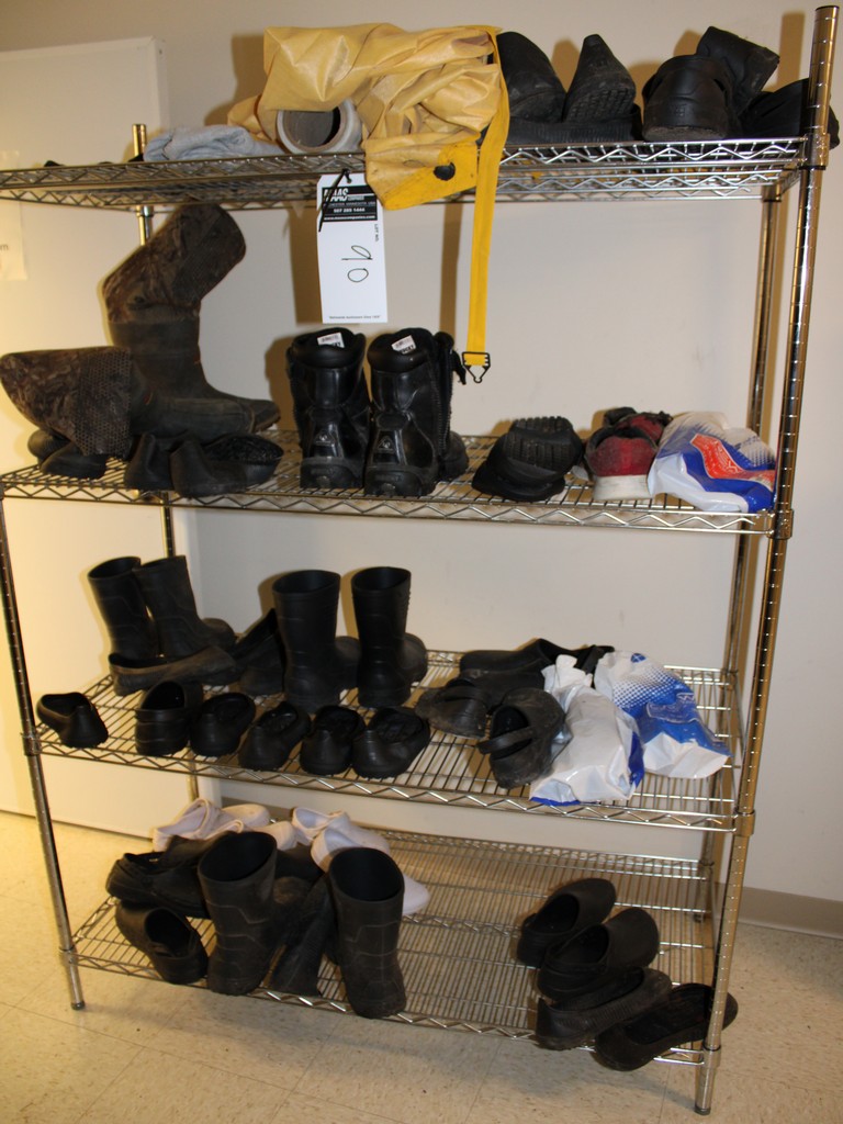 Consisting of but not limited to: 2'D x 4'L x 6'T Stainless Steel Wire Shelf Unit, (4) Shelves, Adjustable Height Shelves; Approximately (20) Pairs of Various Sized Rubber Boots/Shoes.