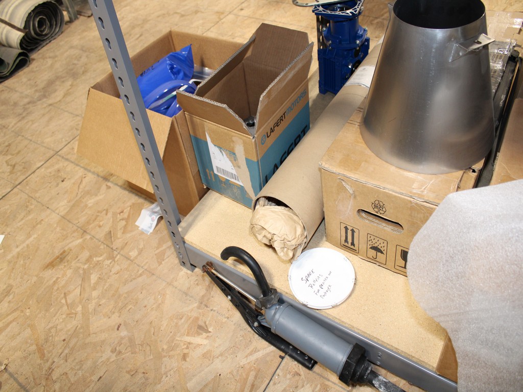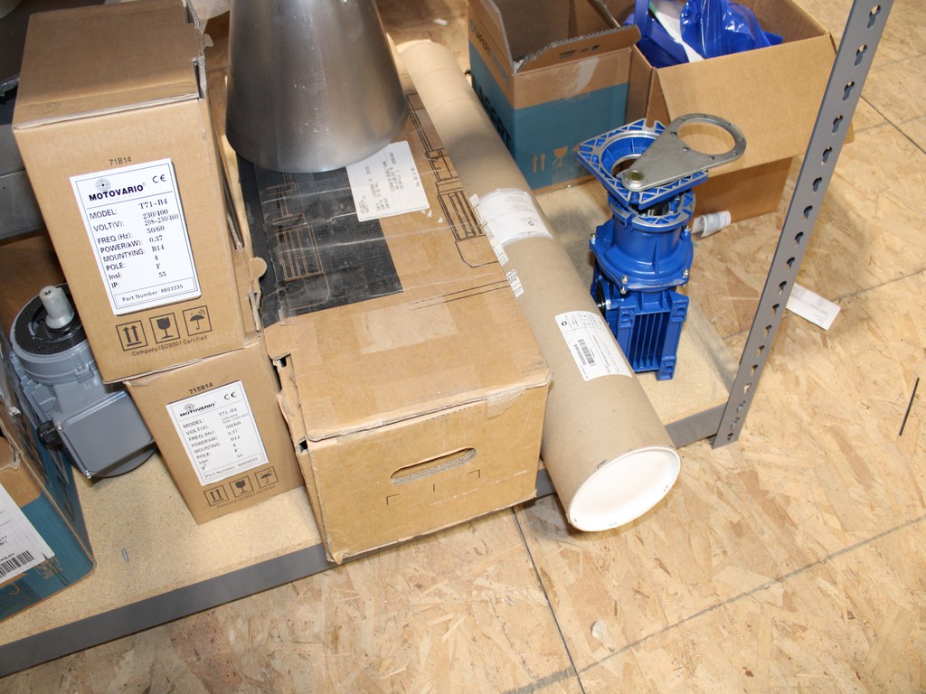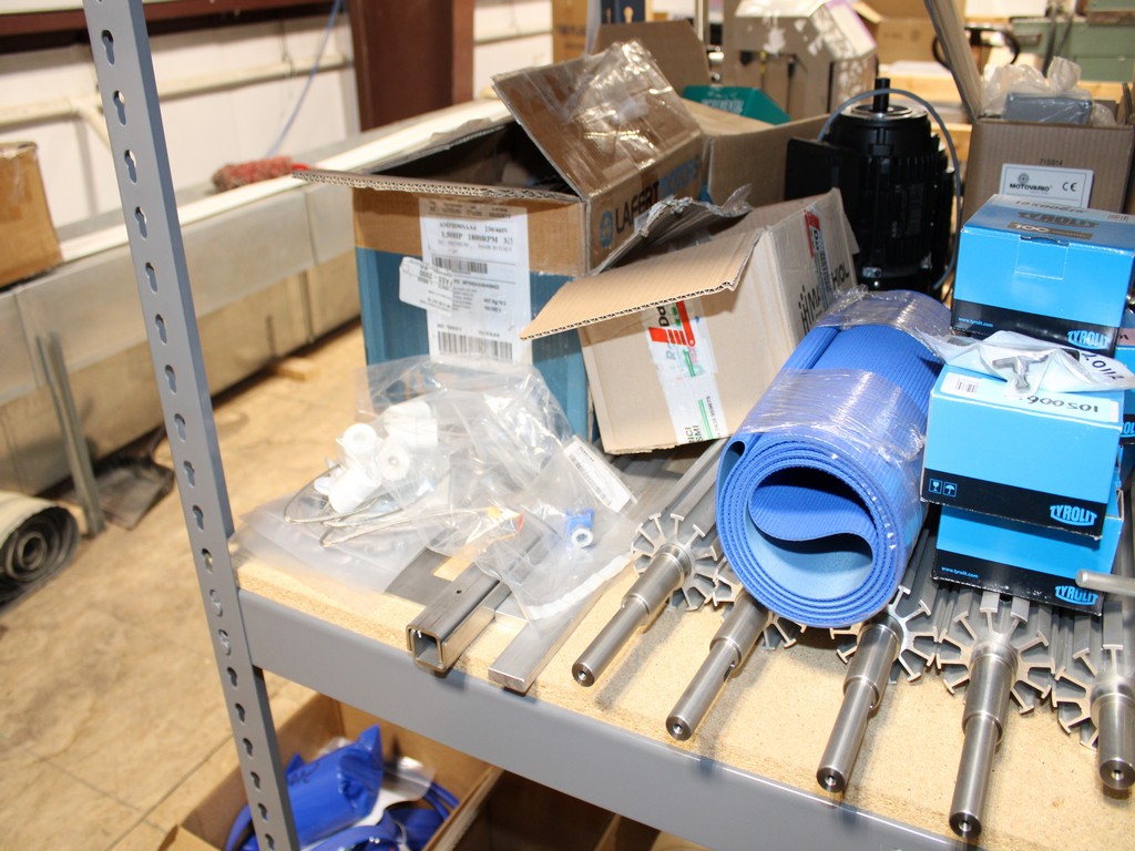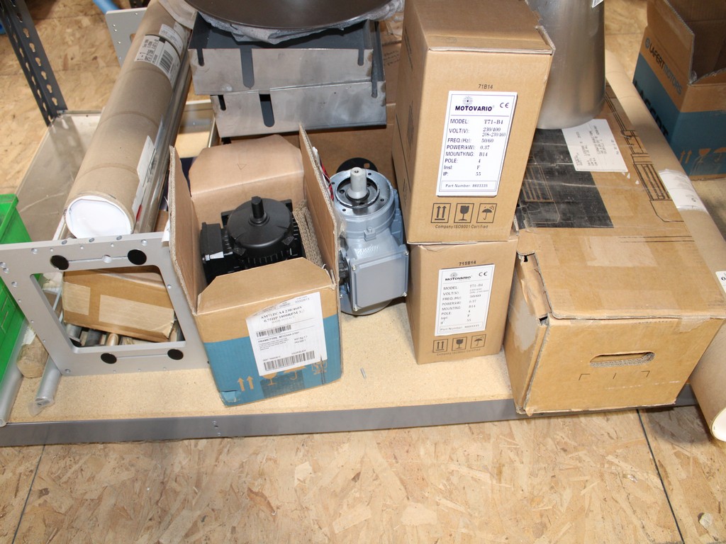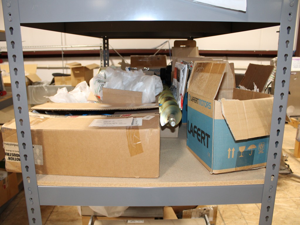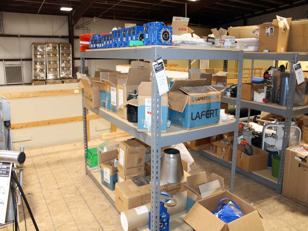 Consisting of but not limited to: 3'W x 6'L x 5'T Wide Span Storage Rack, (3) Particle Board Shelves; (2) AEG .55-KW Motor; AEG .25-KW Motor; AEG .18-KW Motor; AEG .75-KW Motor; (3) MOTOVARIO T71-B4 .37-KW Motor; MOTOVARIO T80-B4 1-HP Motor; (15) MOTOVARIO Gear Boxes; Lafert .55-KW Motor; Lafert 1.1-KW Motor; Spare Water Line Tubing; Smart Date Fault Beacon Assembly; Spare Belts, Actuators, Nuts, Bolts, Etc.; OHLSON 12" x 12?" Aluminum Box with 5-Roller Poles for Plastic Wrap; MARKEM-IMAJE box of (4) SKMI 4RL XPERT 3910 BK 55 MMX Toner, (4) SKMI 4RL XTRA 3520BK 55MMX1 Toner; (2) 10" Diameter -10"T Growlight Cam; (2) DA ROS Harvesting Blades; (8) Aluminum 12-Slotted Shaft, 1"W with Various Length Poles; 20" Spiral Brush.