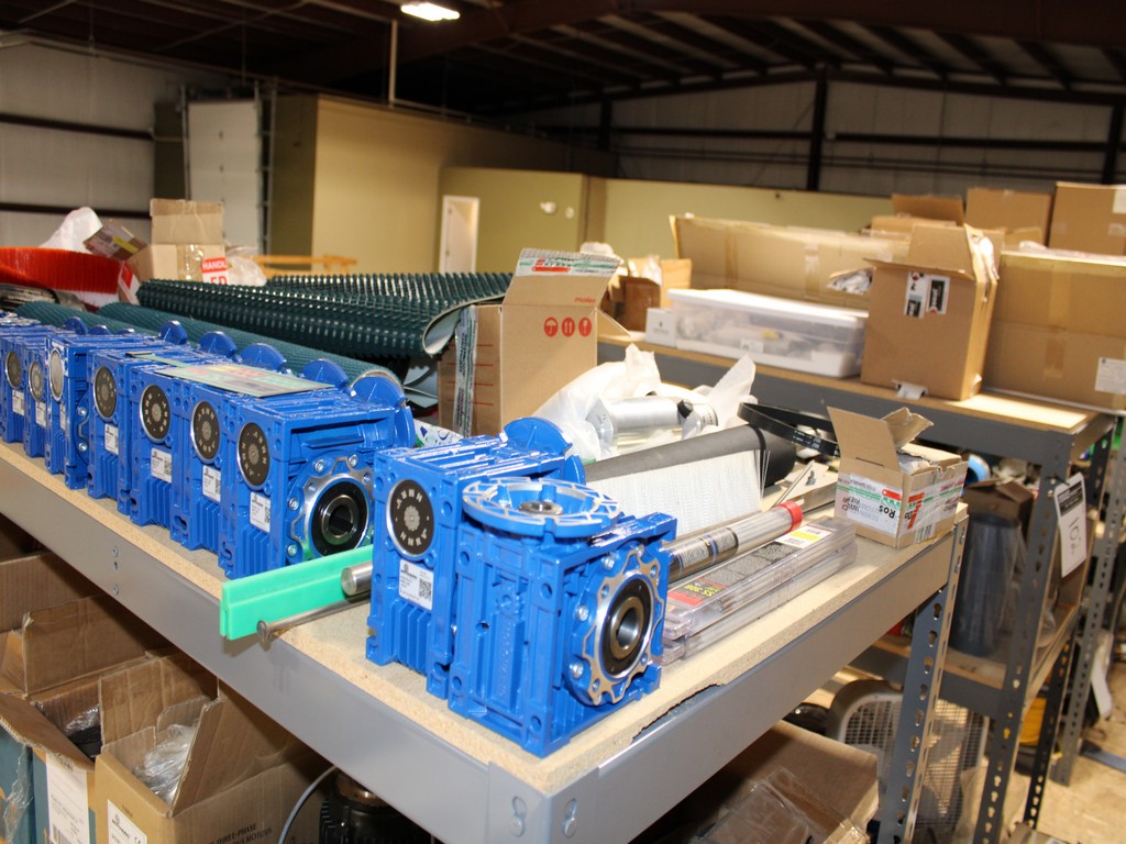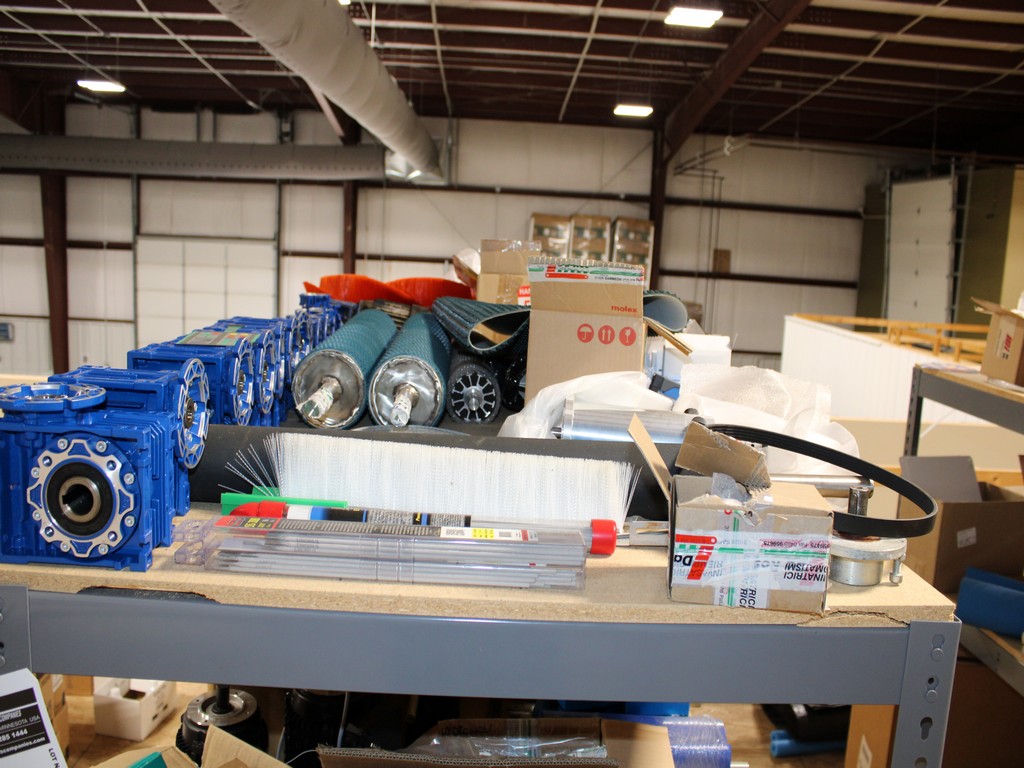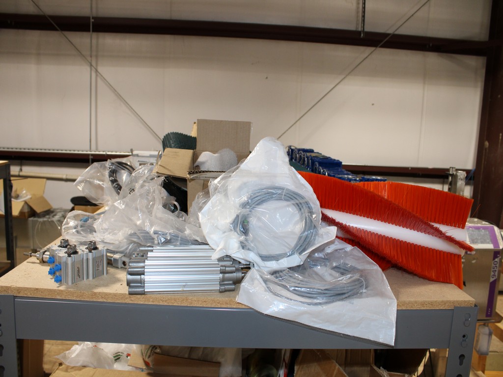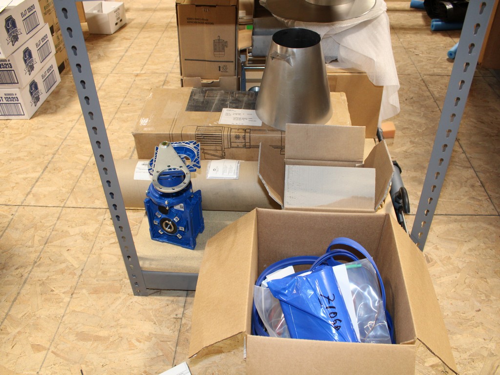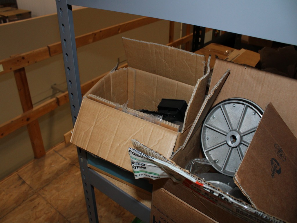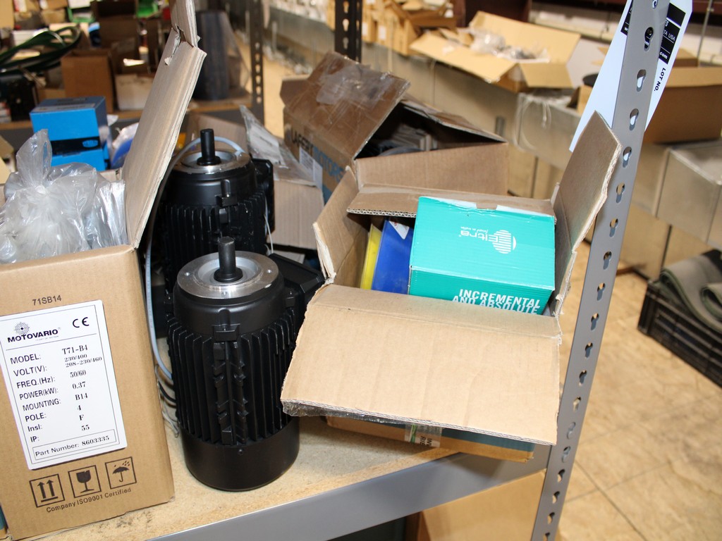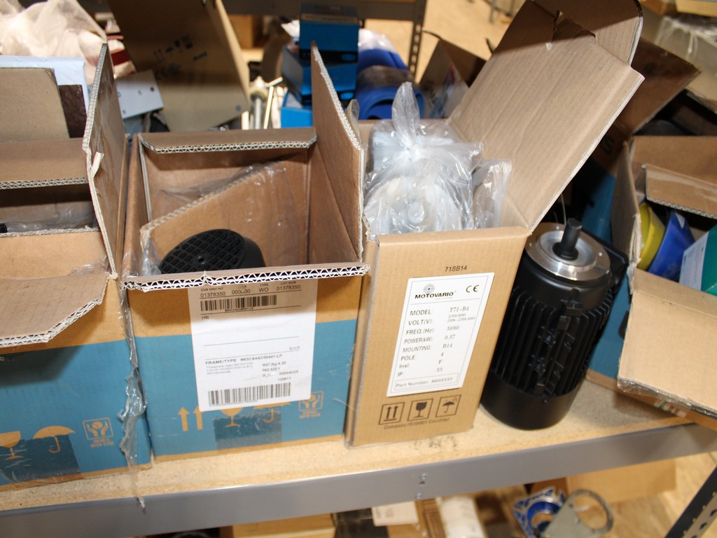 Consisting of but not limited to: 3'W x 6'L x 5'T Wide Span Storage Rack, (3) Particle Board Shelves; (2) AEG .55-KW Motor; AEG .25-KW Motor; AEG .18-KW Motor; AEG .75-KW Motor; (3) MOTOVARIO T71-B4 .37-KW Motor; MOTOVARIO T80-B4 1-HP Motor; (15) MOTOVARIO Gear Boxes; Lafert .55-KW Motor; Lafert 1.1-KW Motor; Spare Water Line Tubing; Smart Date Fault Beacon Assembly; Spare Belts, Actuators, Nuts, Bolts, Etc.; OHLSON 12" x 12?" Aluminum Box with 5-Roller Poles for Plastic Wrap; MARKEM-IMAJE box of (4) SKMI 4RL XPERT 3910 BK 55 MMX Toner, (4) SKMI 4RL XTRA 3520BK 55MMX1 Toner; (2) 10" Diameter -10"T Growlight Cam; (2) DA ROS Harvesting Blades; (8) Aluminum 12-Slotted Shaft, 1"W with Various Length Poles; 20" Spiral Brush.