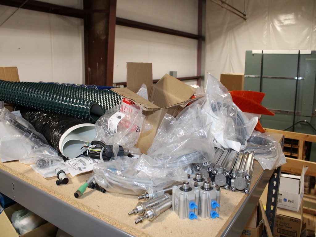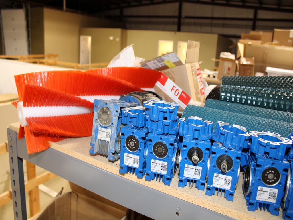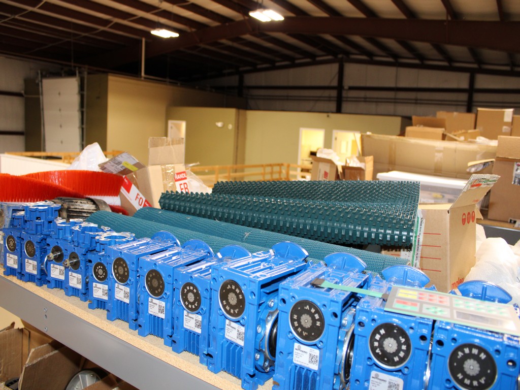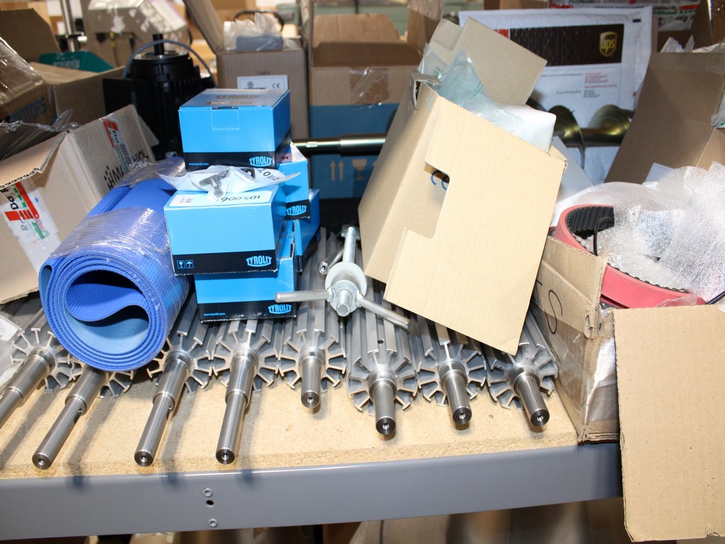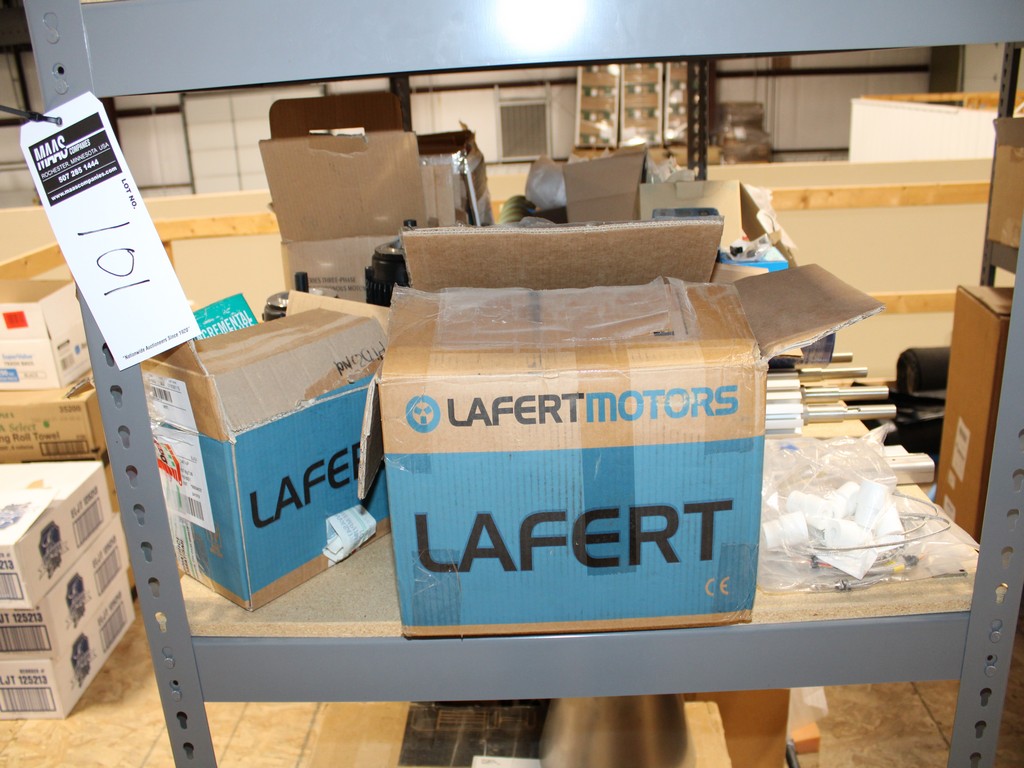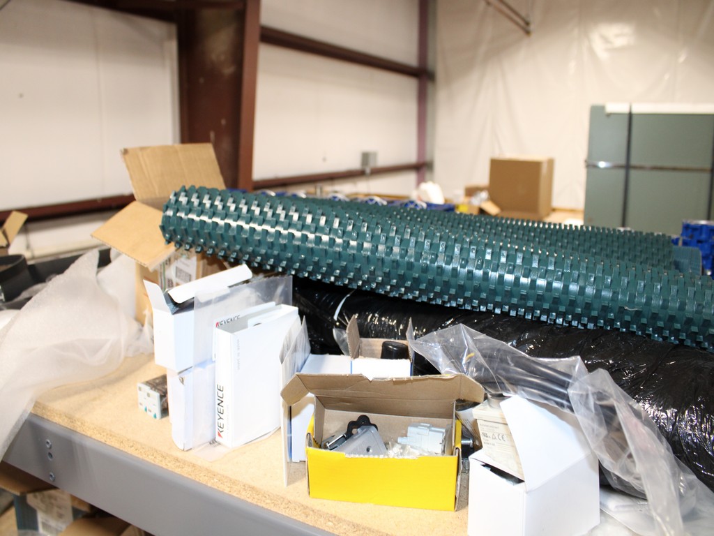Consisting of but not limited to: 3'W x 6'L x 5'T Wide Span Storage Rack, (3) Particle Board Shelves; (2) AEG .55-KW Motor; AEG .25-KW Motor; AEG .18-KW Motor; AEG .75-KW Motor; (3) MOTOVARIO T71-B4 .37-KW Motor; MOTOVARIO T80-B4 1-HP Motor; (15) MOTOVARIO Gear Boxes; Lafert .55-KW Motor; Lafert 1.1-KW Motor; Spare Water Line Tubing; Smart Date Fault Beacon Assembly; Spare Belts, Actuators, Nuts, Bolts, Etc.; OHLSON 12" x 12?" Aluminum Box with 5-Roller Poles for Plastic Wrap; MARKEM-IMAJE box of (4) SKMI 4RL XPERT 3910 BK 55 MMX Toner, (4) SKMI 4RL XTRA 3520BK 55MMX1 Toner; (2) 10" Diameter -10"T Growlight Cam; (2) DA ROS Harvesting Blades; (8) Aluminum 12-Slotted Shaft, 1"W with Various Length Poles; 20" Spiral Brush.