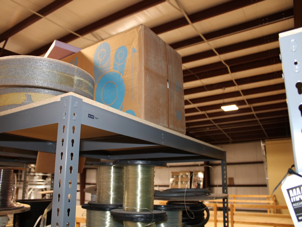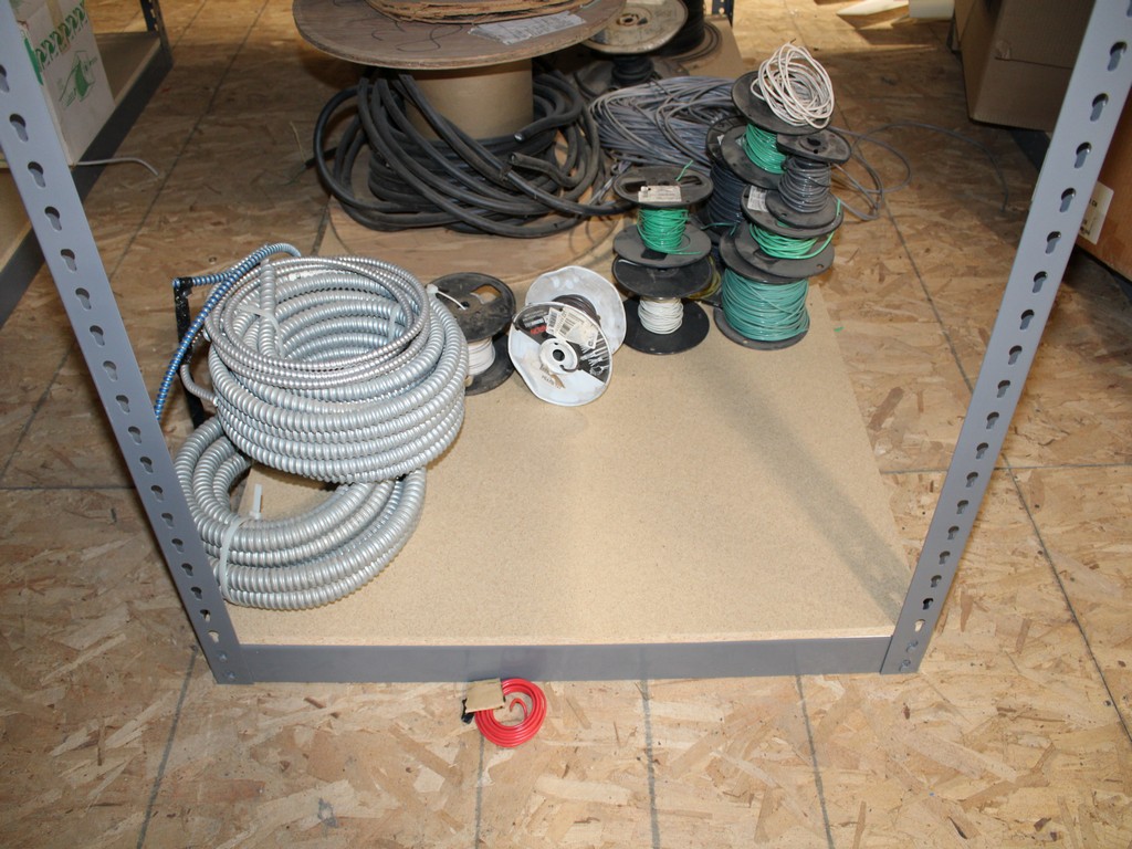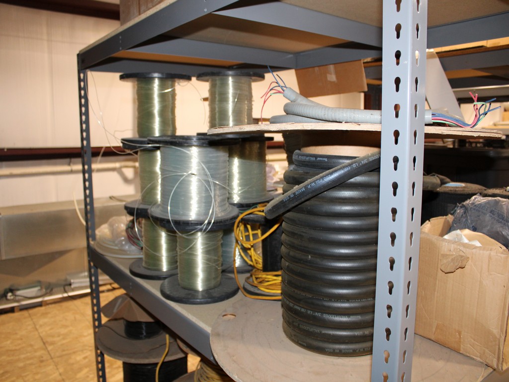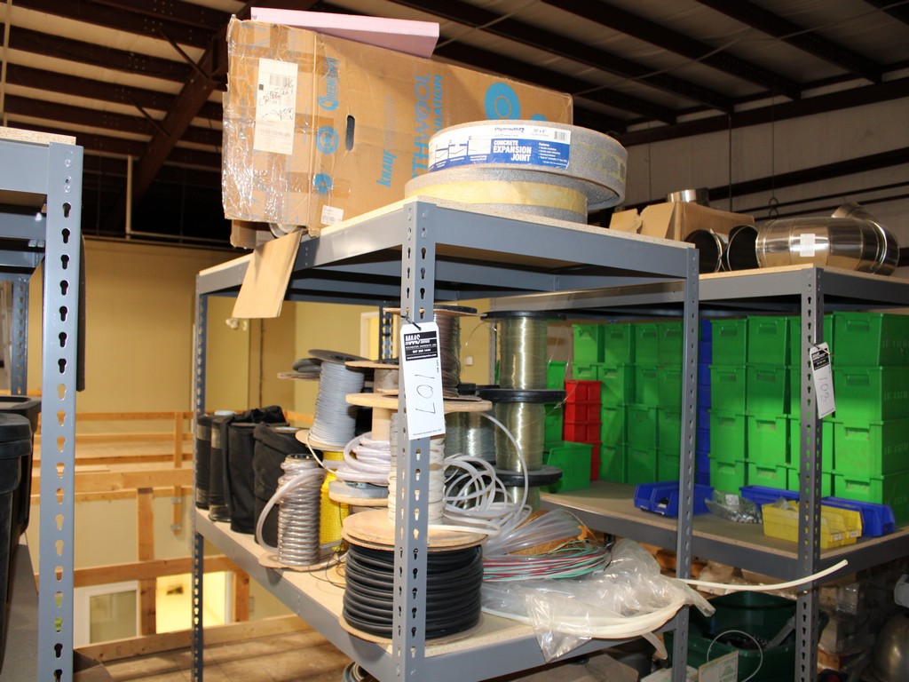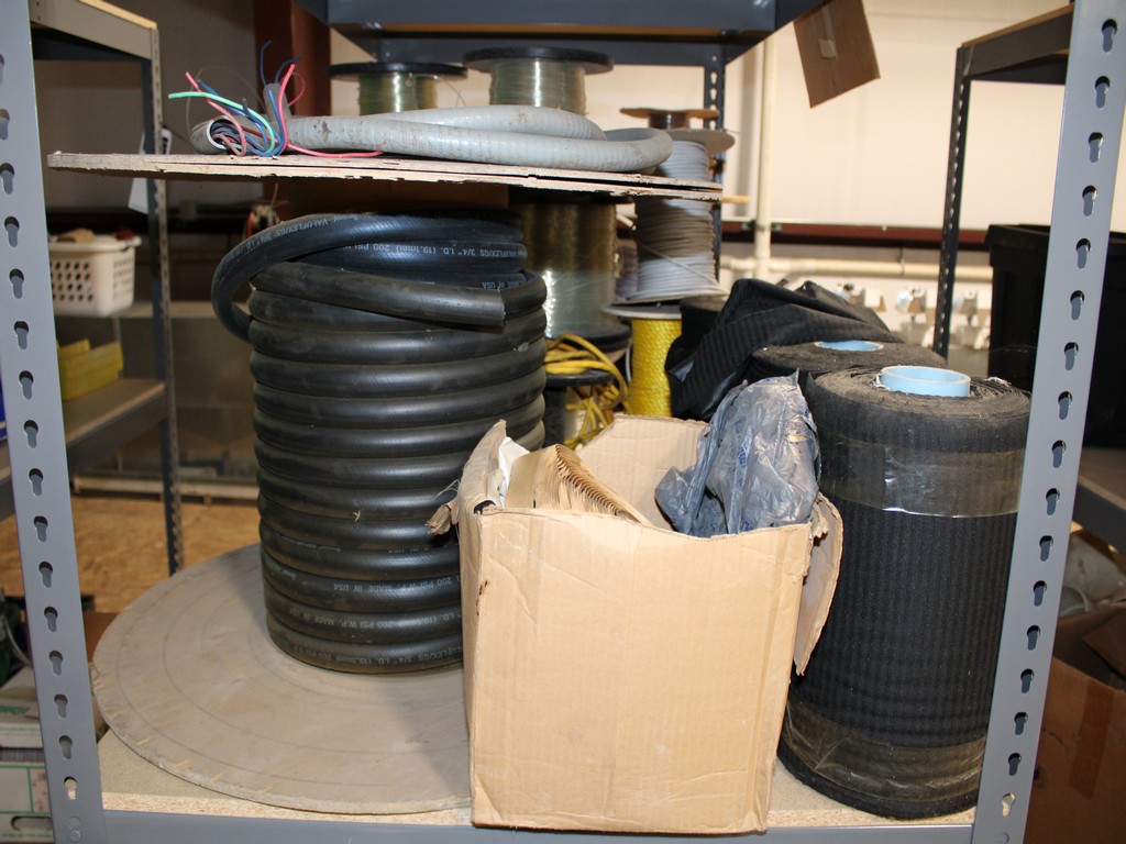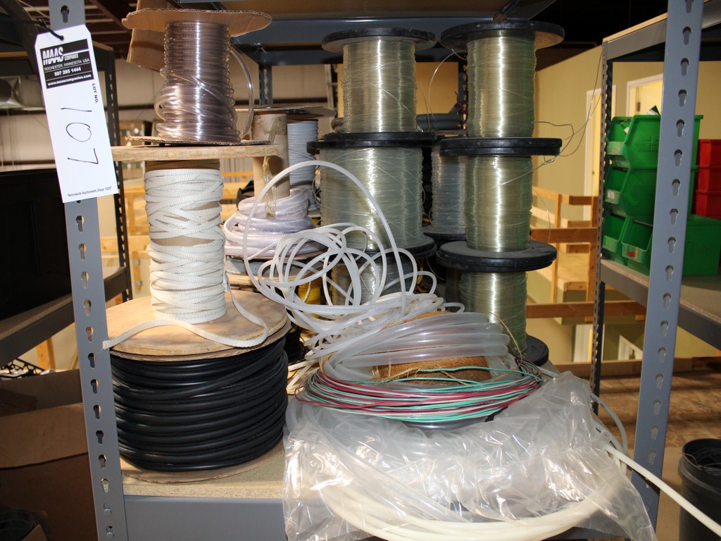 Consisting of but not limited to: 3'W x 6'L x 6'T Wide Span Storage Rack, (3) Particle Board Shelves; (8) Rolls of Clear Plastic Filament; 1/4" Diameter Clear Tube; 1/2" Black Tube; (2) Rolls of 1/2" Flex Tube; (2) Black Plastic Filament; Blue Plastic Filament; (10) Rolls of Various Gauges of Wire; 3/4" Black Tube; (4) Rolls of Black Fabric, 13?"W; (2) Rolls of Wire.