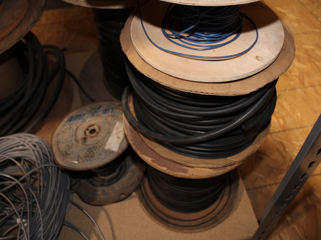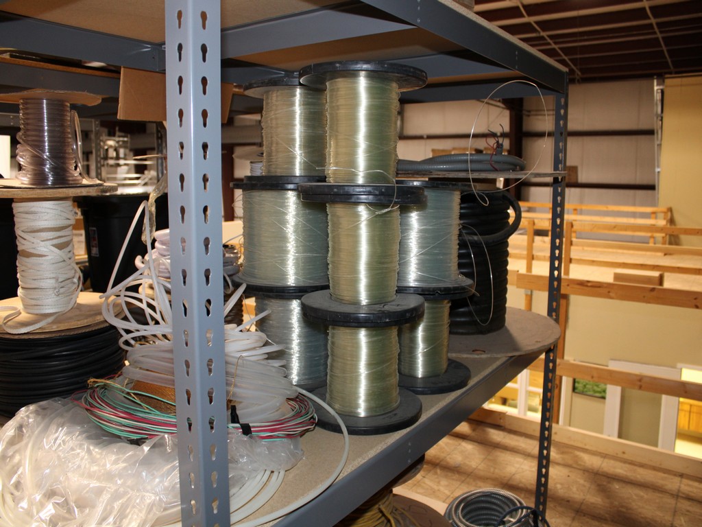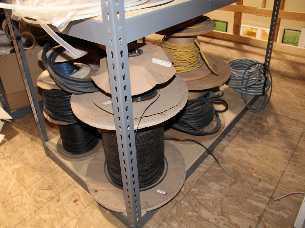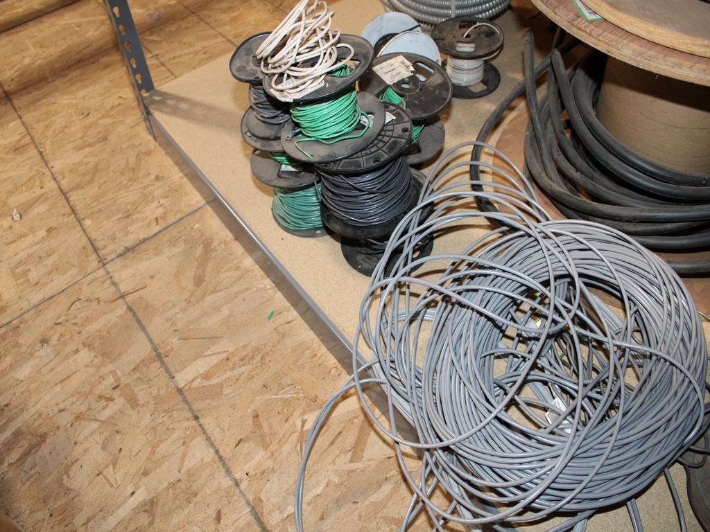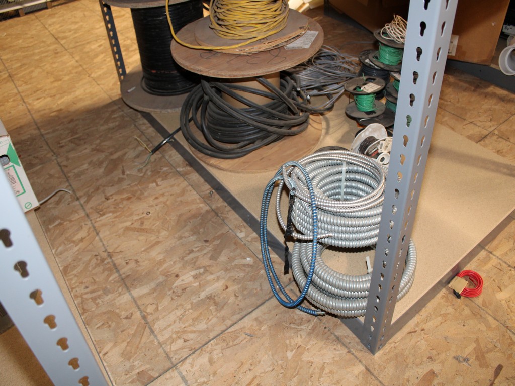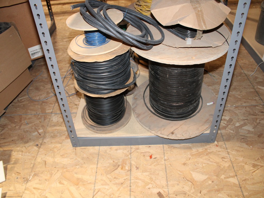 Consisting of but not limited to: 3'W x 6'L x 6'T Wide Span Storage Rack, (3) Particle Board Shelves; (8) Rolls of Clear Plastic Filament; 1/4" Diameter Clear Tube; 1/2" Black Tube; (2) Rolls of 1/2" Flex Tube; (2) Black Plastic Filament; Blue Plastic Filament; (10) Rolls of Various Gauges of Wire; 3/4" Black Tube; (4) Rolls of Black Fabric, 13?"W; (2) Rolls of Wire.