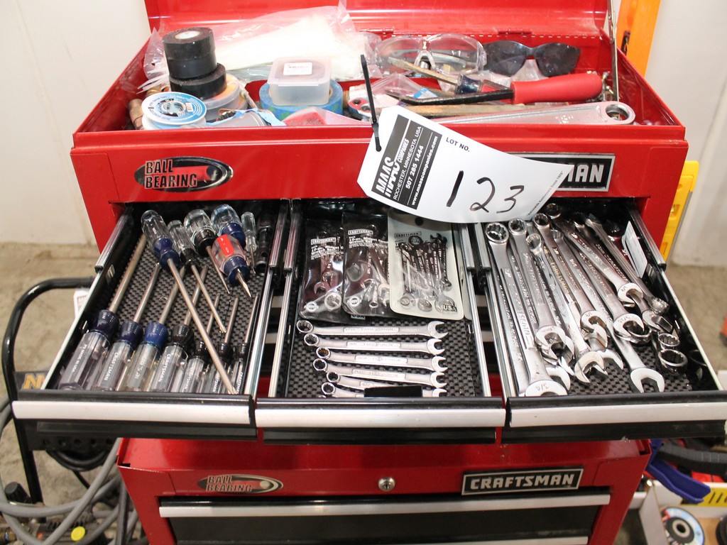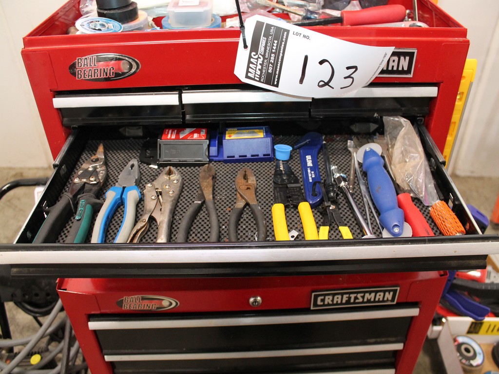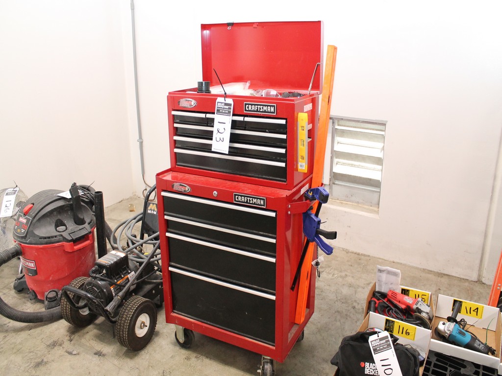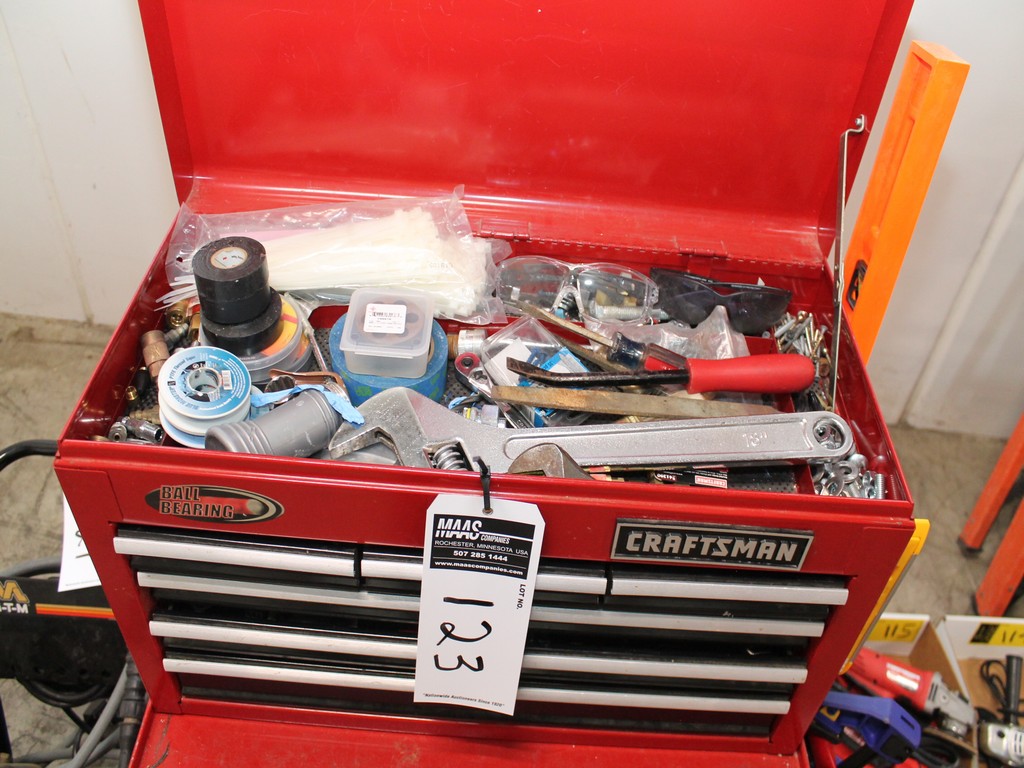 Consisting of but not limited to: Two Tier Craftsman Toolbox, 8-Drawer, Portable, Containing Hand Tools - Box and Open End Wrenches, Socket Set, Levels, Pipe Wrenches, Hammers, Pry Bar, Wire Stripper, Vise Grips, Tin Snips, Stapler, Tube Cutter, Hole Saw Bits, etc.
