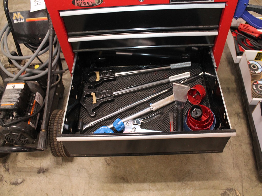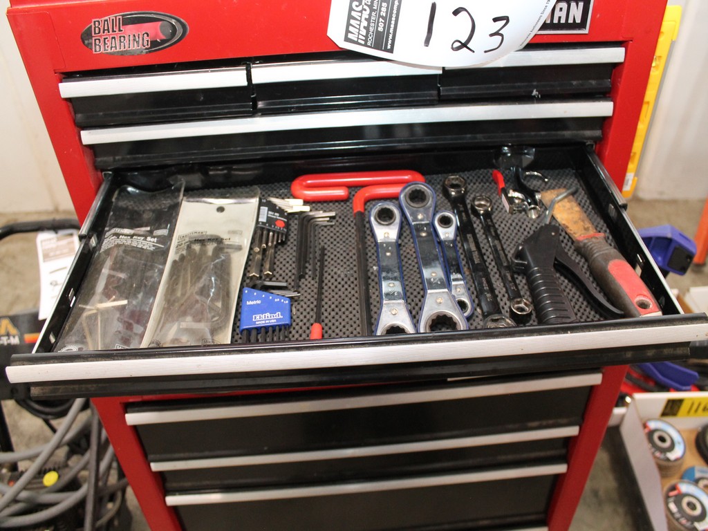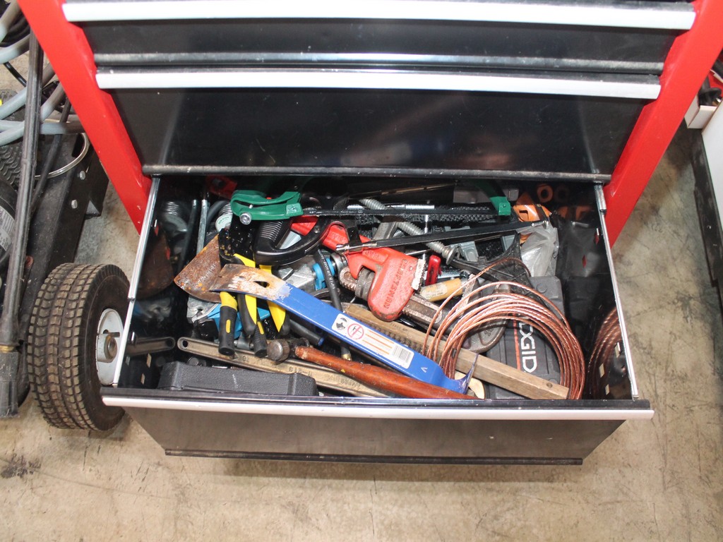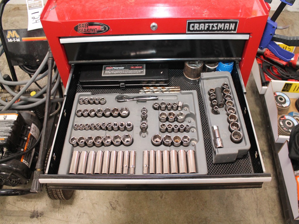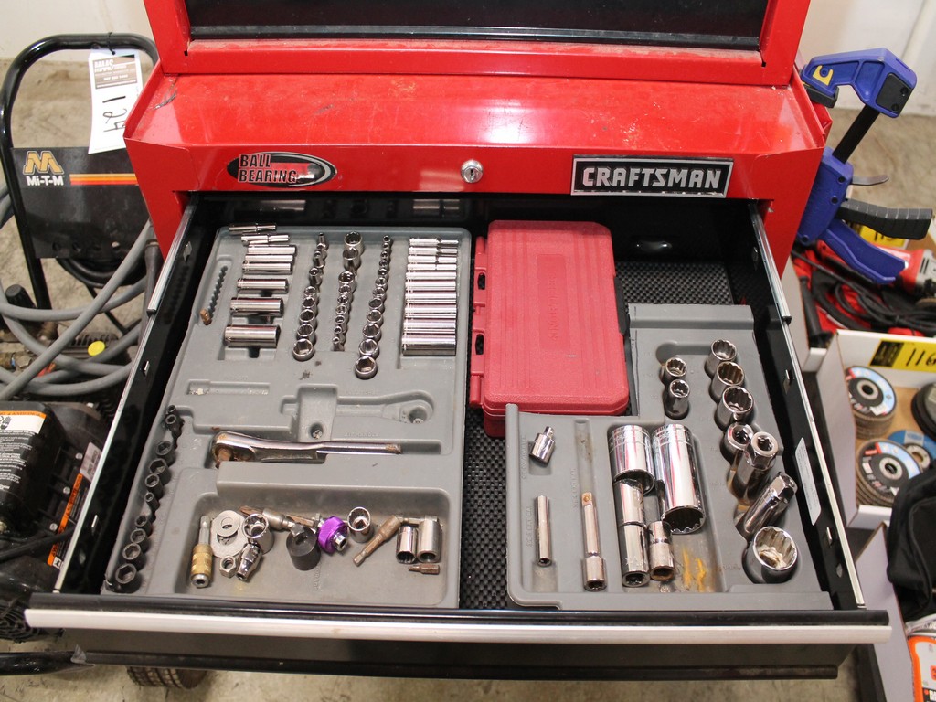 Consisting of but not limited to: Two Tier Craftsman Toolbox, 8-Drawer, Portable, Containing Hand Tools - Box and Open End Wrenches, Socket Set, Levels, Pipe Wrenches, Hammers, Pry Bar, Wire Stripper, Vise Grips, Tin Snips, Stapler, Tube Cutter, Hole Saw Bits, etc.