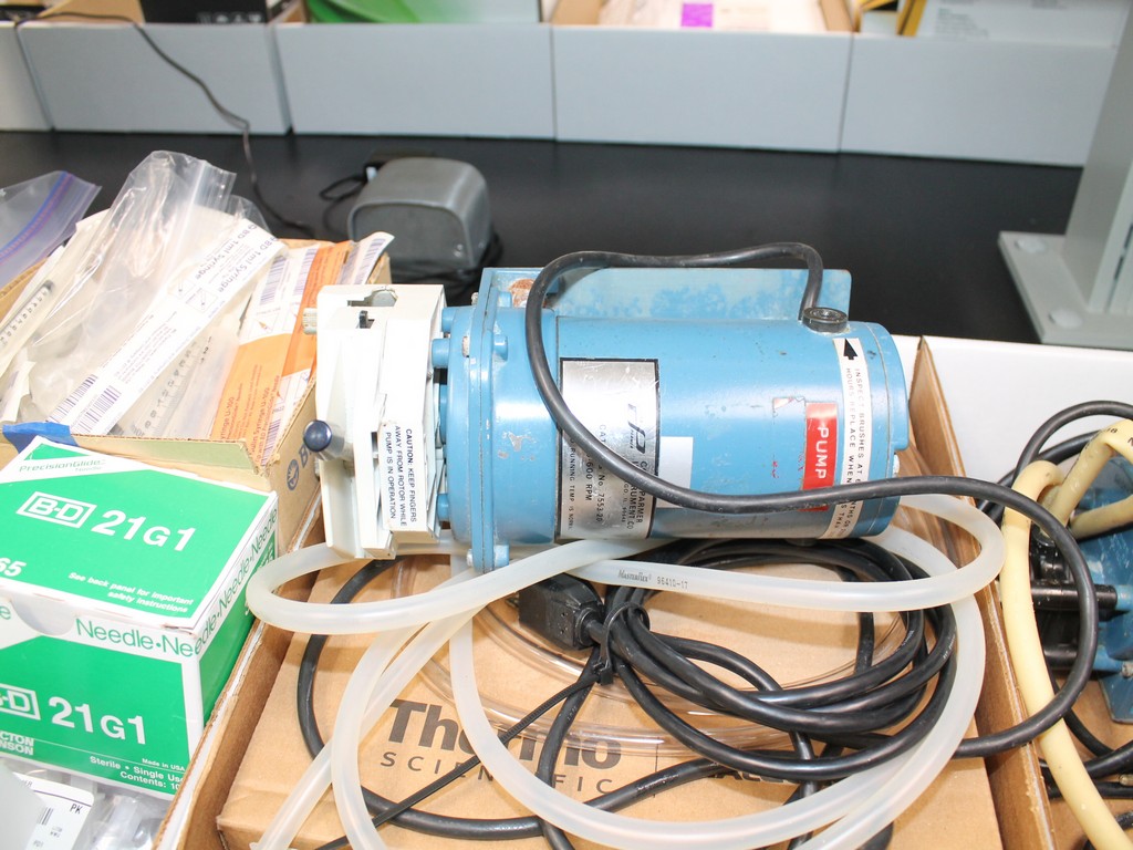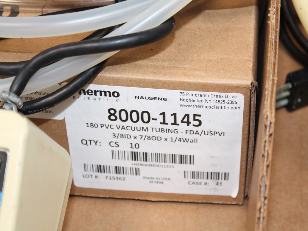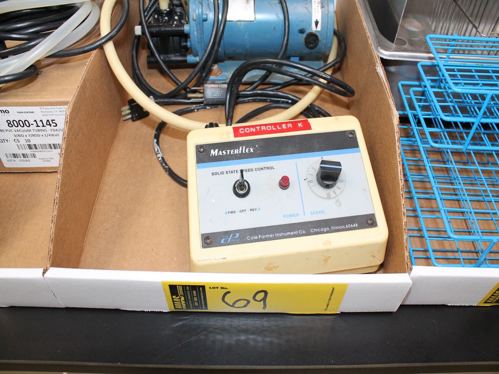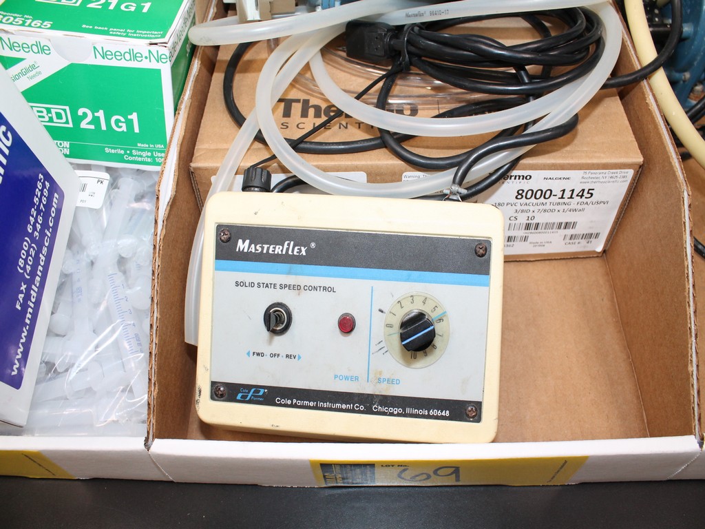 Consisting of but not limited to: (2) Cole-Parmer Vacuum Pumps Each with Masterflex Solid State Speed Controllers; Miscellaneous Tubing; Box of Thermo Scientific 180 PVC Vacuum Tubing, 3/8" ID.