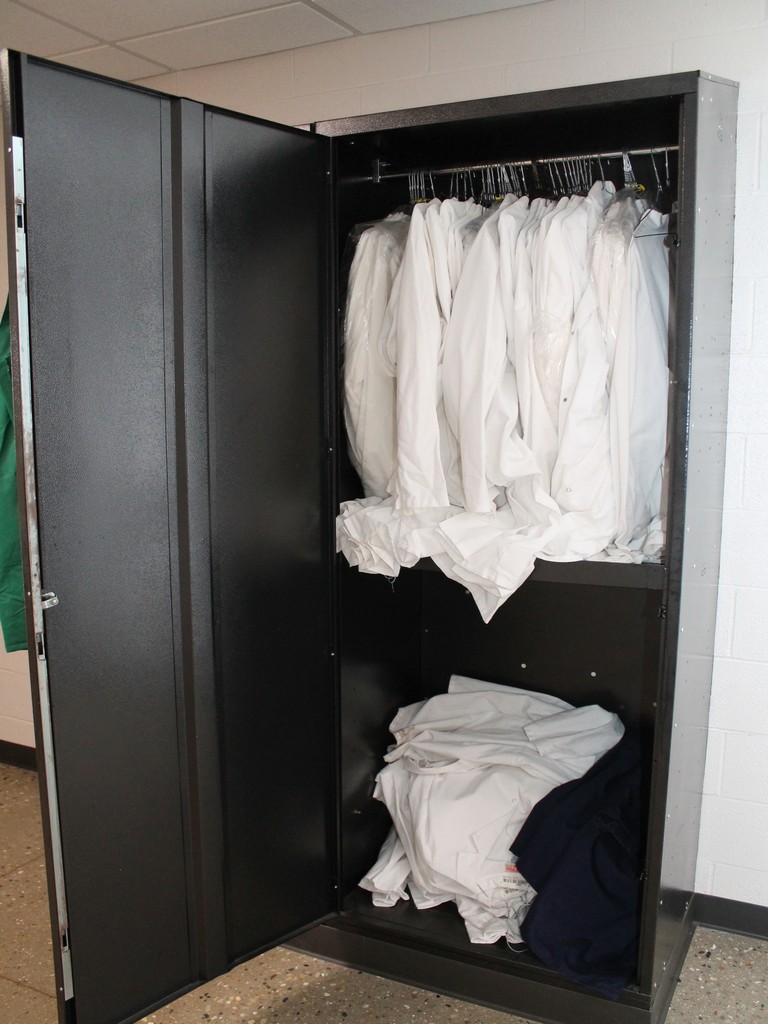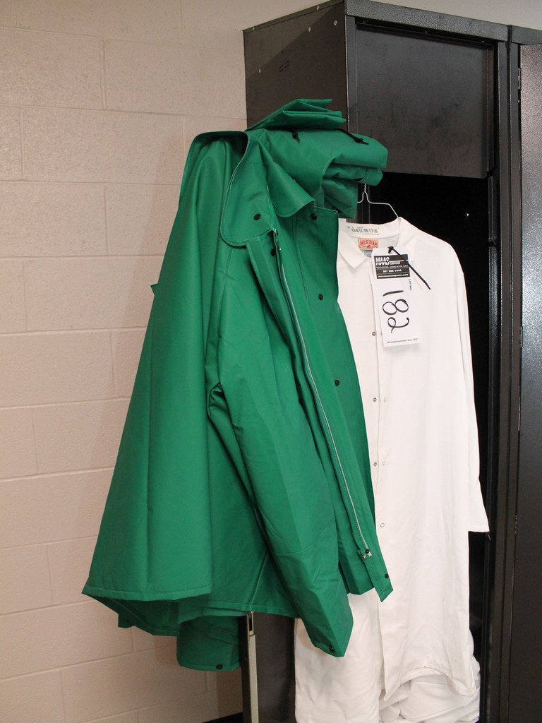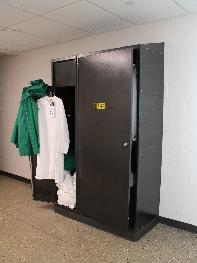 Consisting of but not limited to: Steel 2-Door Wardrobe, 47"W x 21-1/2"D x 91"T, 2-Sections, (1) Shelf with Hanging Rod, Swing Door Above; Approximately (46) Clean White Lab Coats, Approximately (30) White Soiled Lab Coats, (2) Blue Lab oats, (2) Green Protective Chemical Coats.