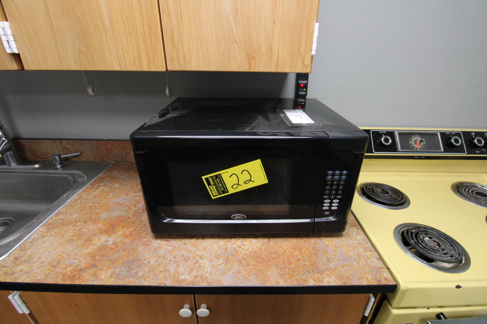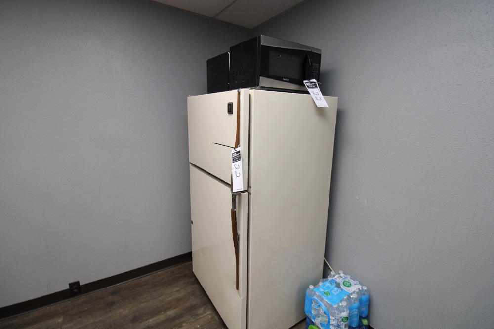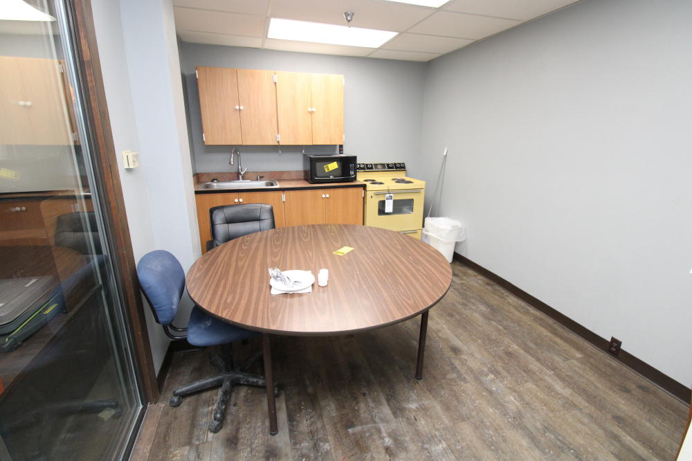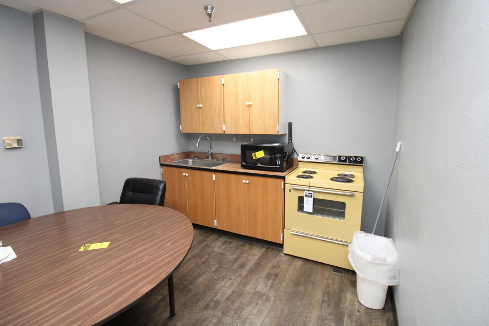 CONSISTING OF BUT NOT LIMITED TO: 60" Diameter Wood Grain Laminate Top Table, Padded 5-Roller Base Office Chair; Padded Side Chair, Arm Rests, 4-Legs; Hot Point 4-Burner Electric Stove/Oven; (3) Microwaves; GE Over/Under Full Size Refrigerator/Freezer