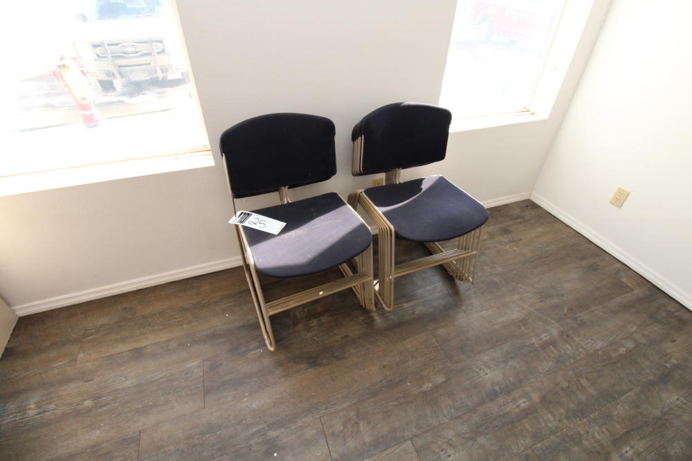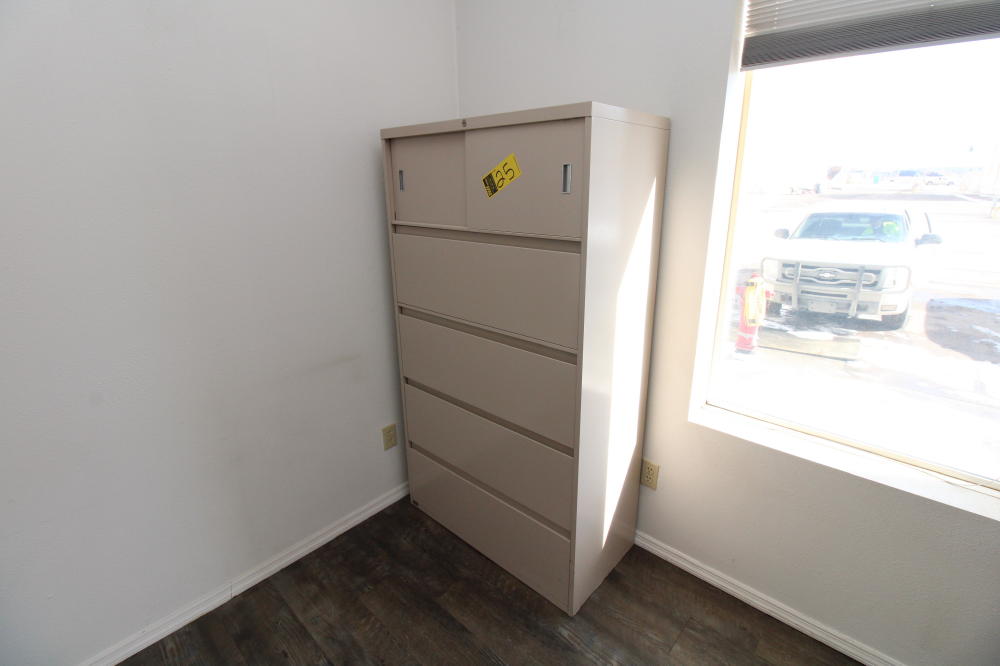 CONSISTING OF BUT NOT LIMITED TO: 72" x 65" Wood Grain Laminate L-Shaped Desk; Zeal Desk Standing Desk Platform; (2) 12"D x 13"W x 71"T 4-Shelf Wood Bookcases; Wood Podium with (2) Shelves, Pull Out Drawer, on Casters; Metal 2-Drawer Lateral Filing Cabinet; Metal 5-Drawer Lateral Filing Cabinet; (13) Padded Metal Side Chairs, Sled Base