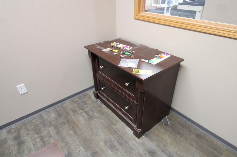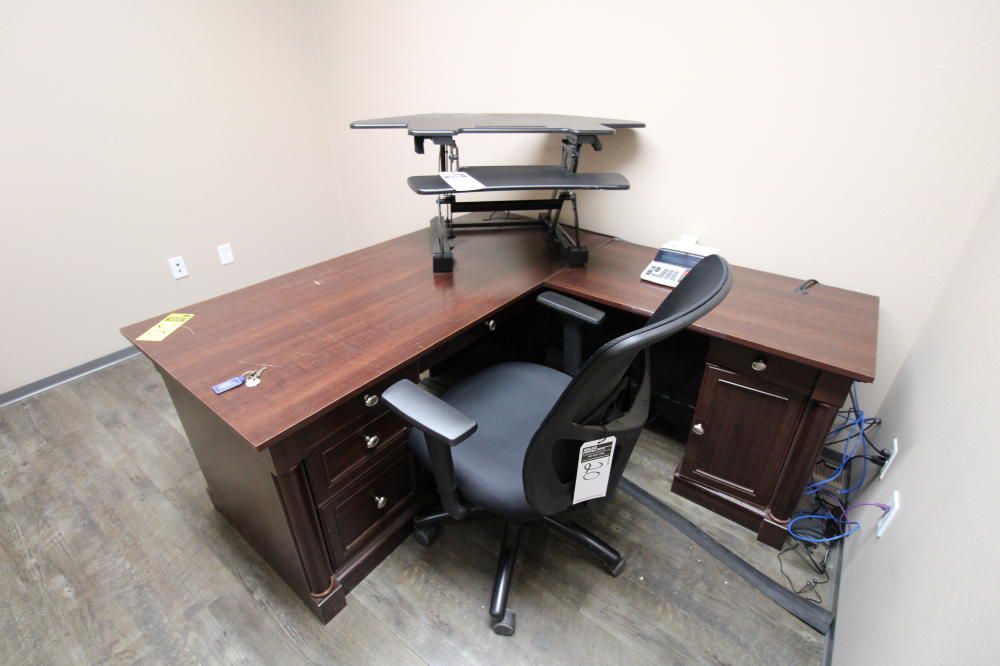 CONSISTING OF BUT NOT LIMITED TO: 65" x 69" Wood Grain Laminate L-Shaped Desk; Zeal Desk Standing Desk Platform; Wood 2-Drawer Lateral Filing Cabinet; 5-Roller Base Office Chair with Mesh Back, Arm Rests; Sharp Printing Calculator;