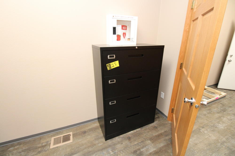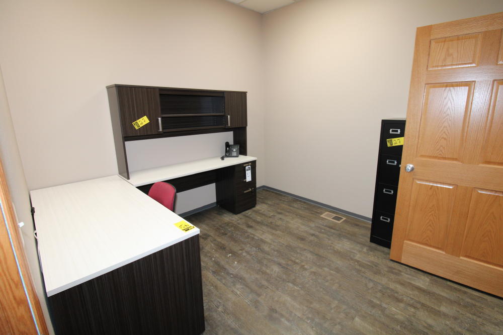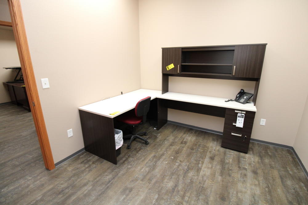 CONSISTING OF BUT NOT LIMITED TO: 27.5" x 65" L-Shaped Wood Grain Laminate Desk; 18.5" x 65" Wood Grain Laminate Hutch with Desk Shelf; Metal 4-Drawer Lateral Filing Cabinet; Padded 5-Roller Base Office Chair; Avaya 9508 Handset; Plastic Waste Receptacle