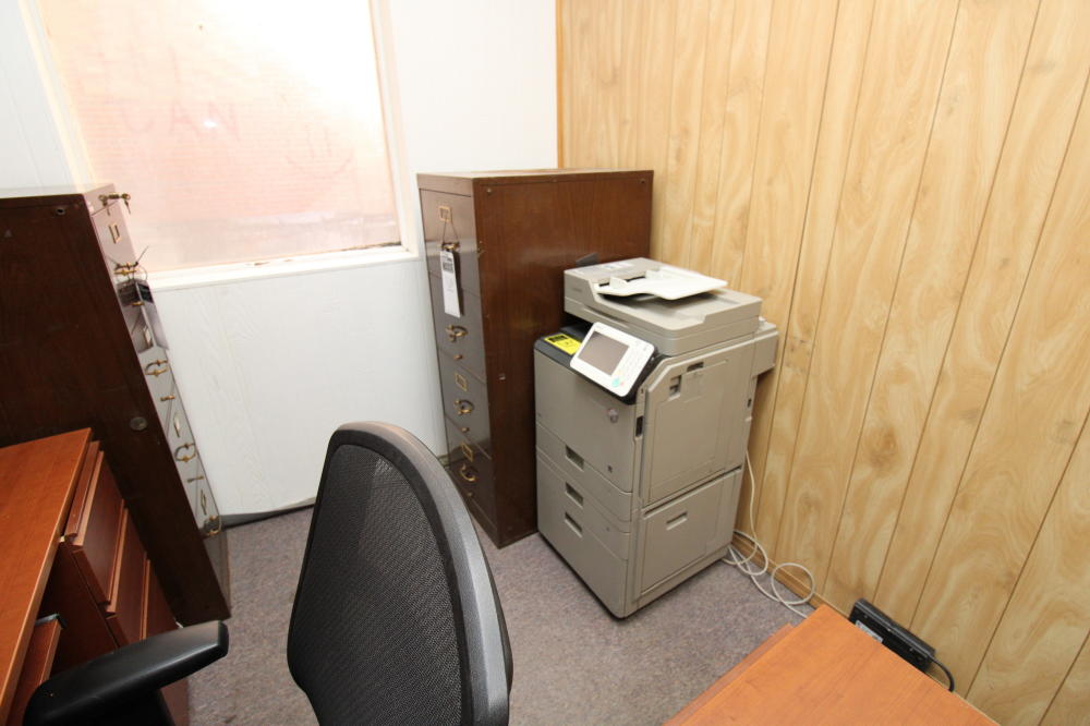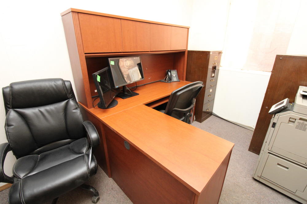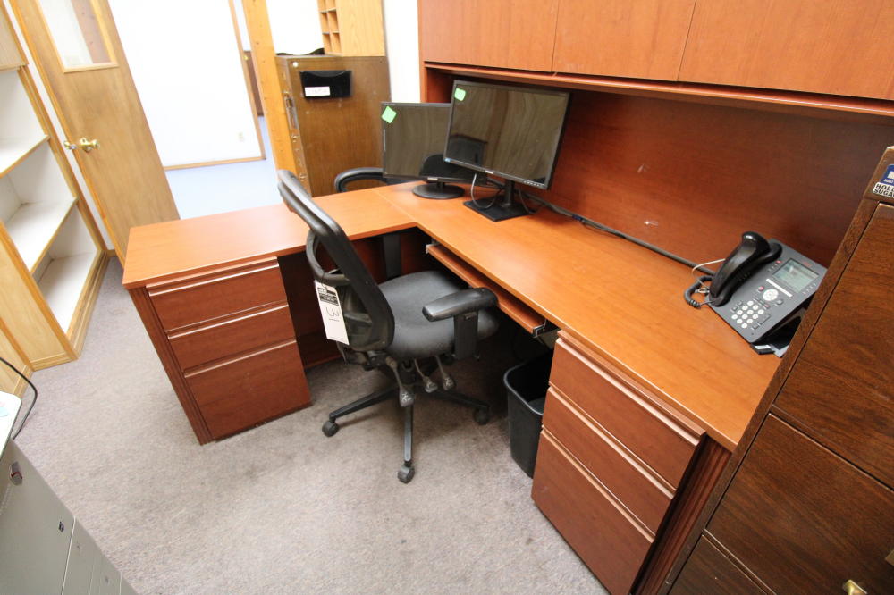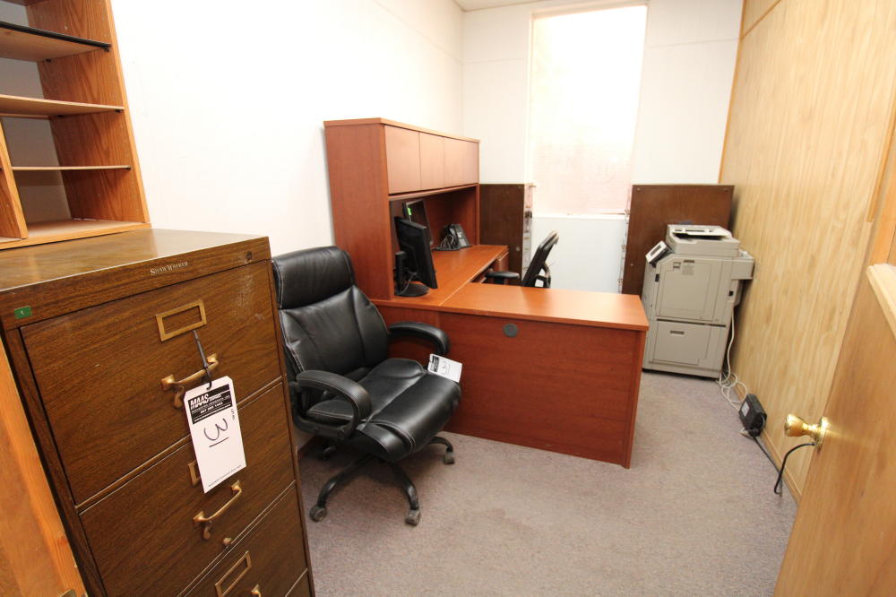 CONSISTING OF BUT NOT LIMITED TO: 71" x 63" L-Shaped Desk, (3) Metal 4-Drawer Filing Cabinets; Leather Executive Office Chair; 5-Roller Base Office Chair, Mesh Back, Arm Rests; Canon C350iF Printer; Avaya Handset
