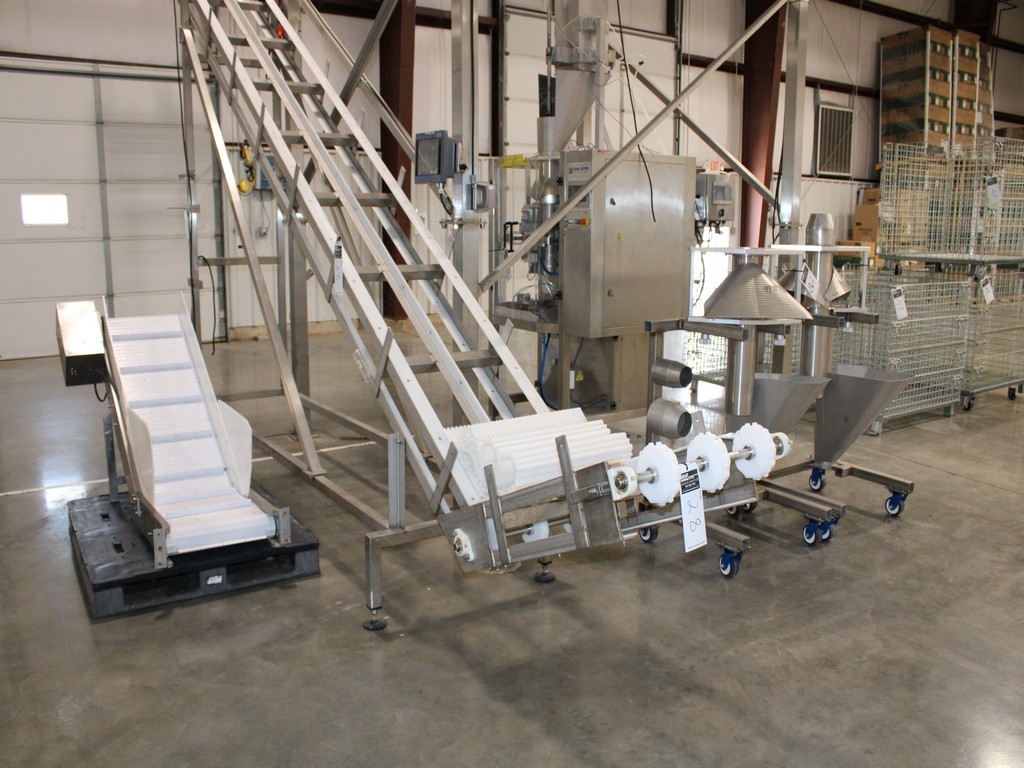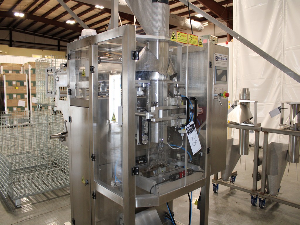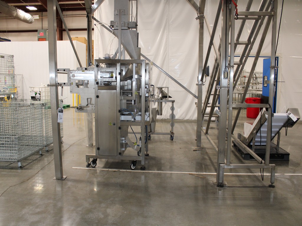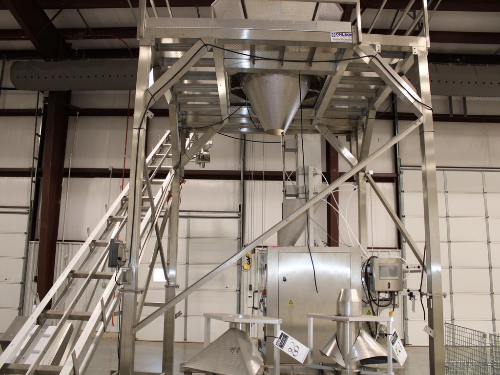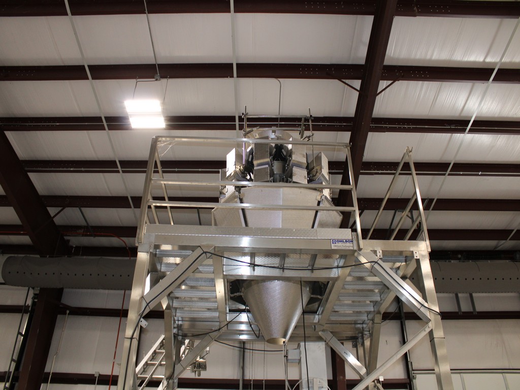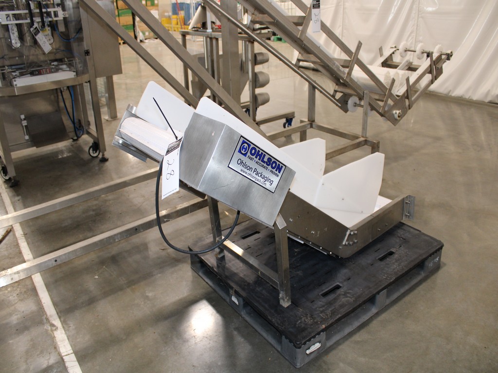 Consisting of but not limited to: OHLSON MHW-CW10 MultiHead Weigher, Infeed Funnel, (10) Feed Buckets/Weigh Buckets, Collating Chute, 80-Bags/Minute; Steel Frame, Approximately 92"W x 112"L x 12'T Platform, Hand Rails on All Sides; OHLSON Model 6312 (VFFX6312SS) Automatic Form Fill & Seal Machine, 25?" Max Film Width, 3?" - 12"W Max Bag Width, 2" - 11" Max Bag Length, WEINVIEW Touchscreen Controls; (2) 4-Wheel Cart with Steel Chute, Various Sized heads Ranging 3" - 5" Diameter; 23"W x Approximately 28'L Inclined Powered Conveyor, Belt Conveyor, Steel Frame; 20"W x Approximately 4'L Inclined Powered Conveyor, 2'L Landing, Plastic Bucket Belt.