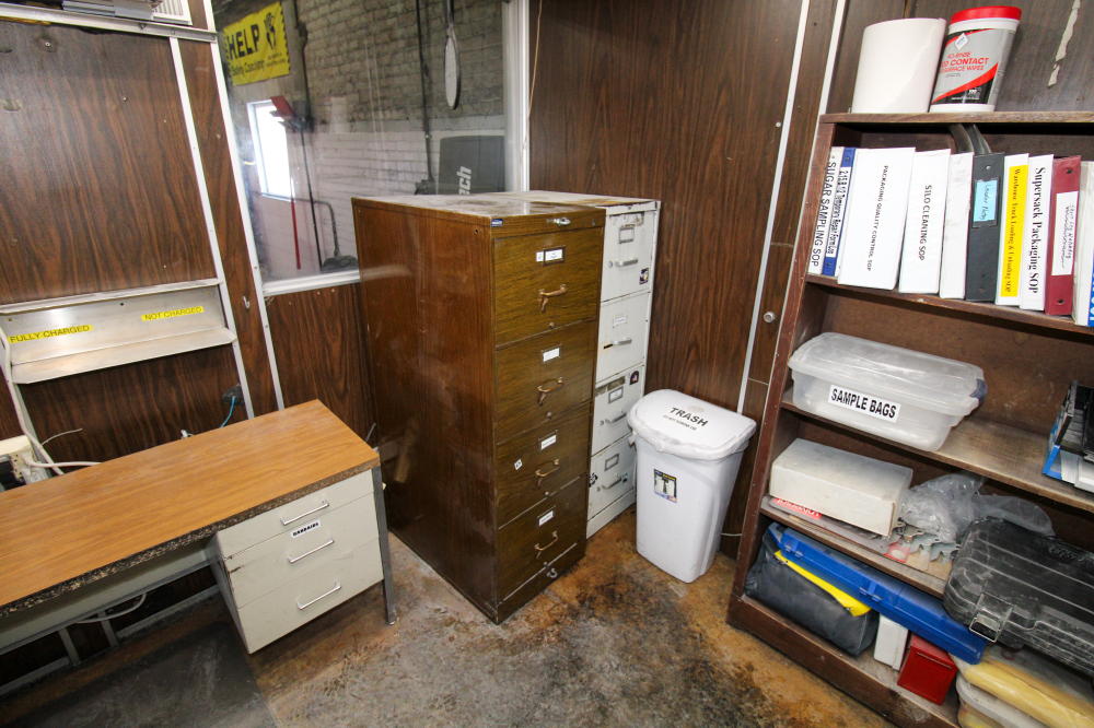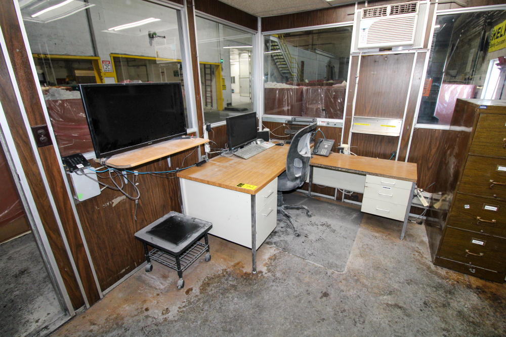 CONSISTING OF BUT NOT LIMITED TO: 149"L x 125"W Outside Dimensions; 30" x 50" Metal Desk, Wood Grain Laminate Top, 72" x 18" Hutch; Wood Bookcase, 4-Shelves; (2) Metal 4-Drawer Filing Cabinets; (2) 5-Roller Base Office Chairs, Mesh Back; Crosley A/C Unit; Samsung 24" Monitor; Samsung 32" Monitor; Keyboard and Mouse; APC Backups 425 Battery Backup; Avaya Handset, Printing Calculator