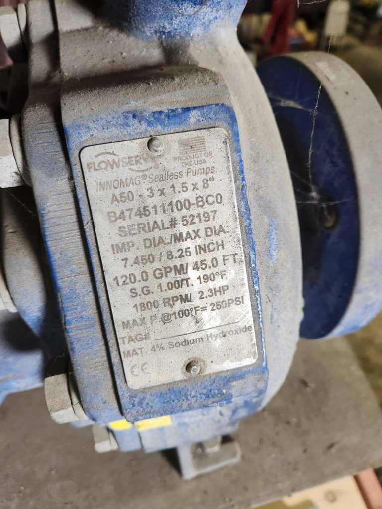 Flowserv Innomag Sealless Pump, Model A50-3"x1.5"x8" B474511100-BCO, SN 52197, Imp. Diameter/Max. Diameter: 7.450"/8.25", 120 GPM/45'; Powered by WEG 2.3-HP, 1,800-RPM Electric Motor.