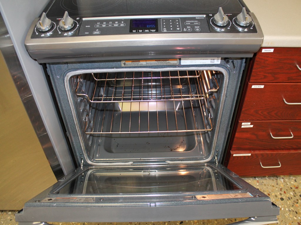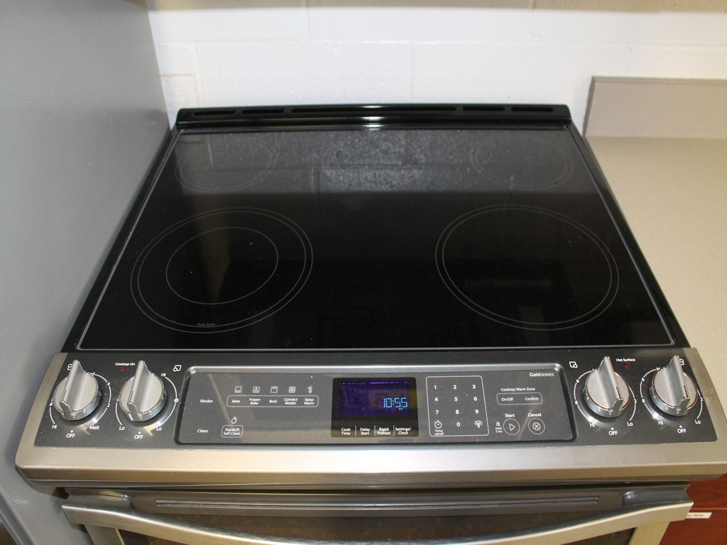 Range/Oven, Stainless Steel, 4-Burner Glass Top, Electric, Warmer, Digital Display and Controls, Dials for Stove.