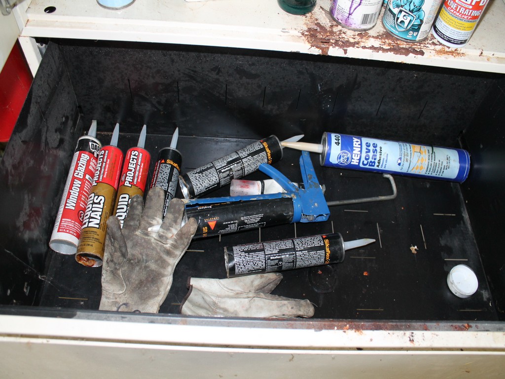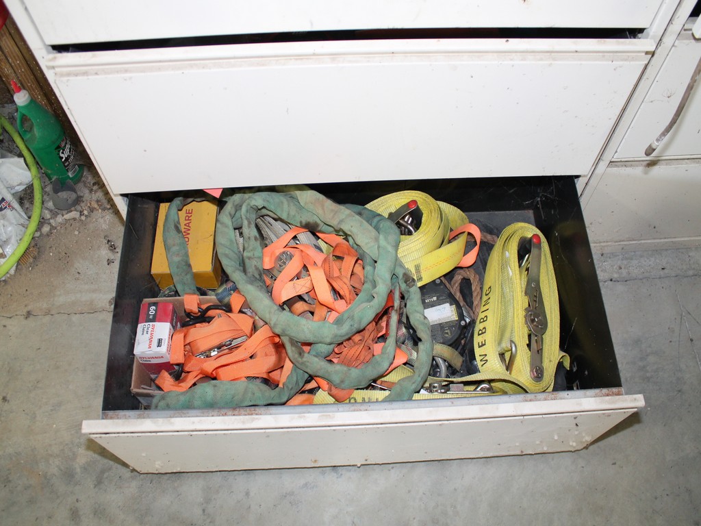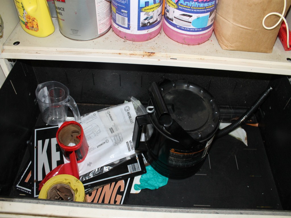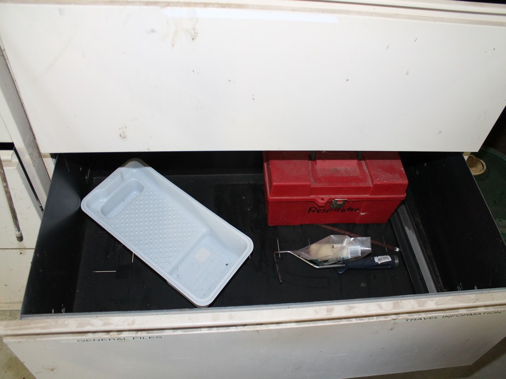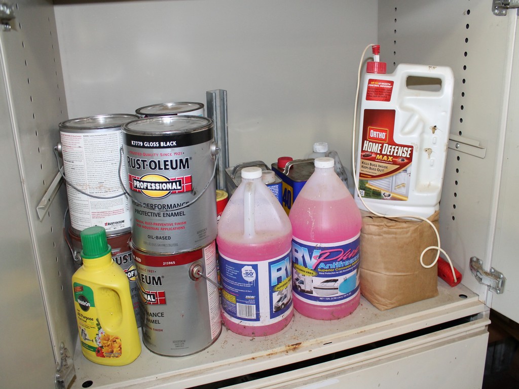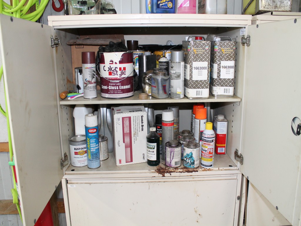 Consisting of but not necessarily limited to: 2-Steel Cabinets, 2-doors and 3 Pull Out Drawers; Miscellaneous Chemicals including WD40, Acetone, Cleaners, PVC Pipe Cement, Paints, etc.