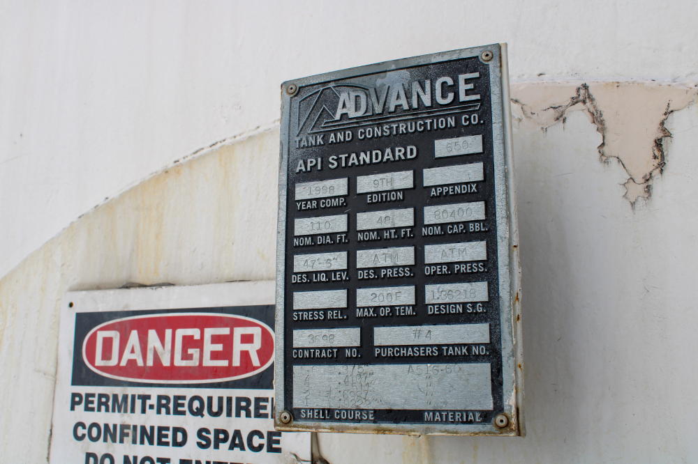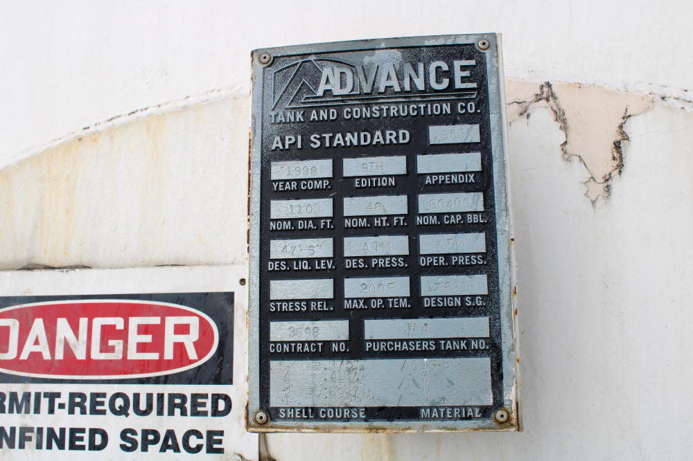 CONSISTING OF BUT NOT LIMITED TO: 1998 Advance Tank & Construction Company, 110' Diameter x 48'H, 80,400-BBL Capacity; Pump House with Pump and Motor