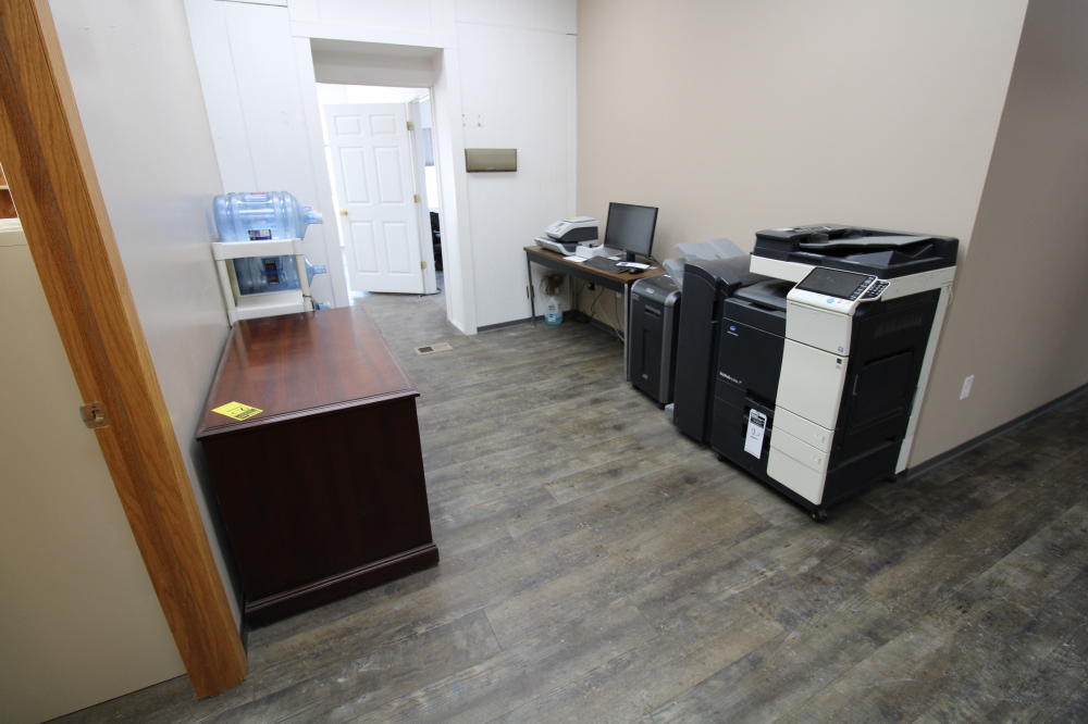 CONSISTING OF BUT NOT LIMITED TO: 60"W x 20"D Wood Grain Laminate Top 4-Leg Table; 30" x 60" Metal Desk with Metal Desk Shelf; 25"W x 52"L Wood Grain Laminate Desk; 12"D x 13"W x 71"T 4-Shelf Wood Bookcase; (3) 4-Position 5-Gallon Water Jug Holders; Hasler In-300 Series USPS Shipping Label Scale; Fellowes 225i Shredder; Konica Minolta Bizhub C364e