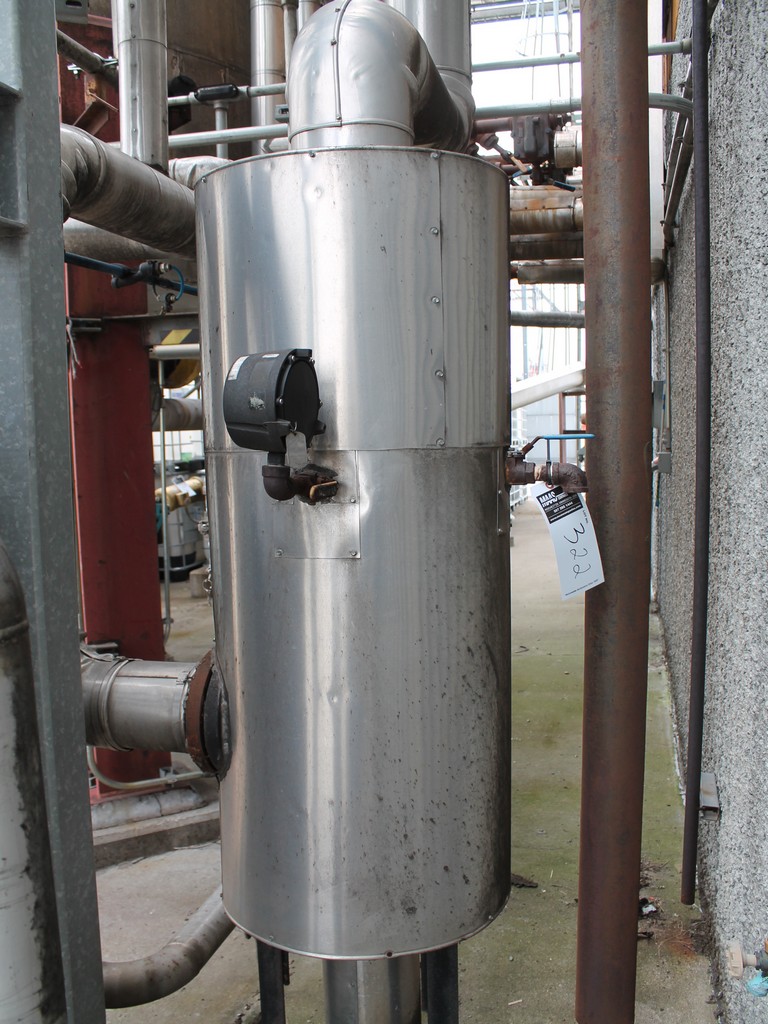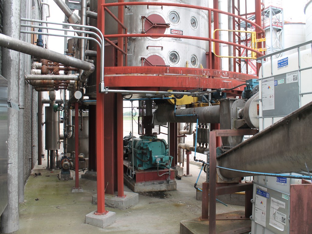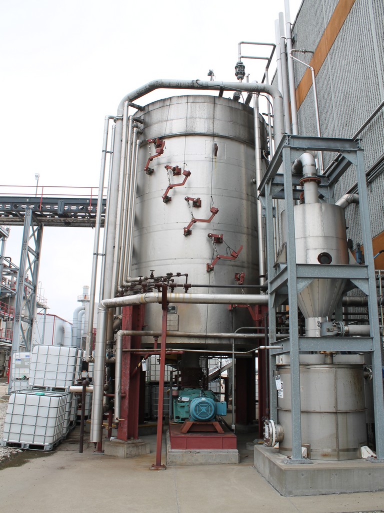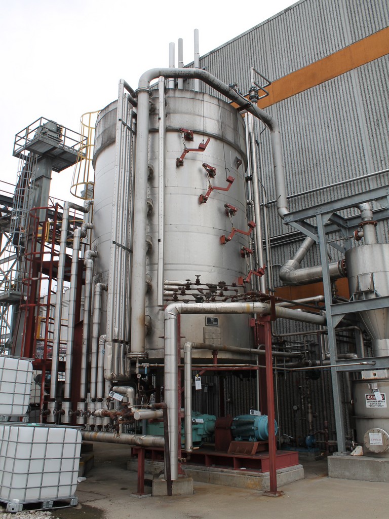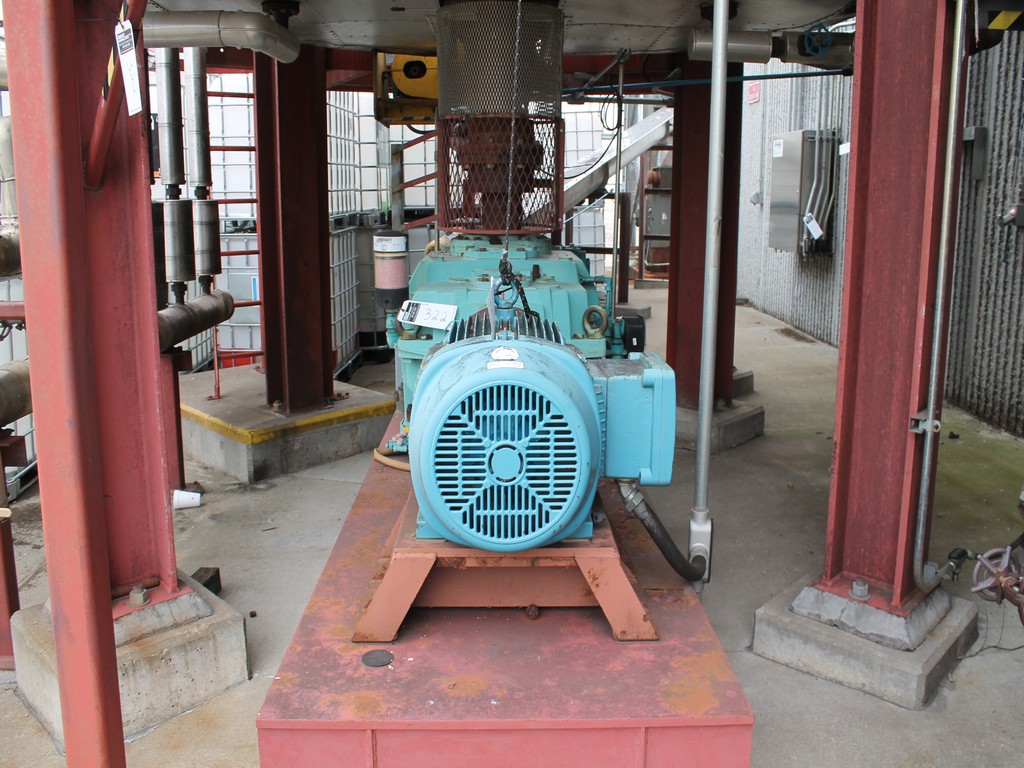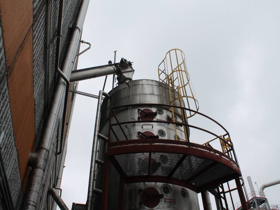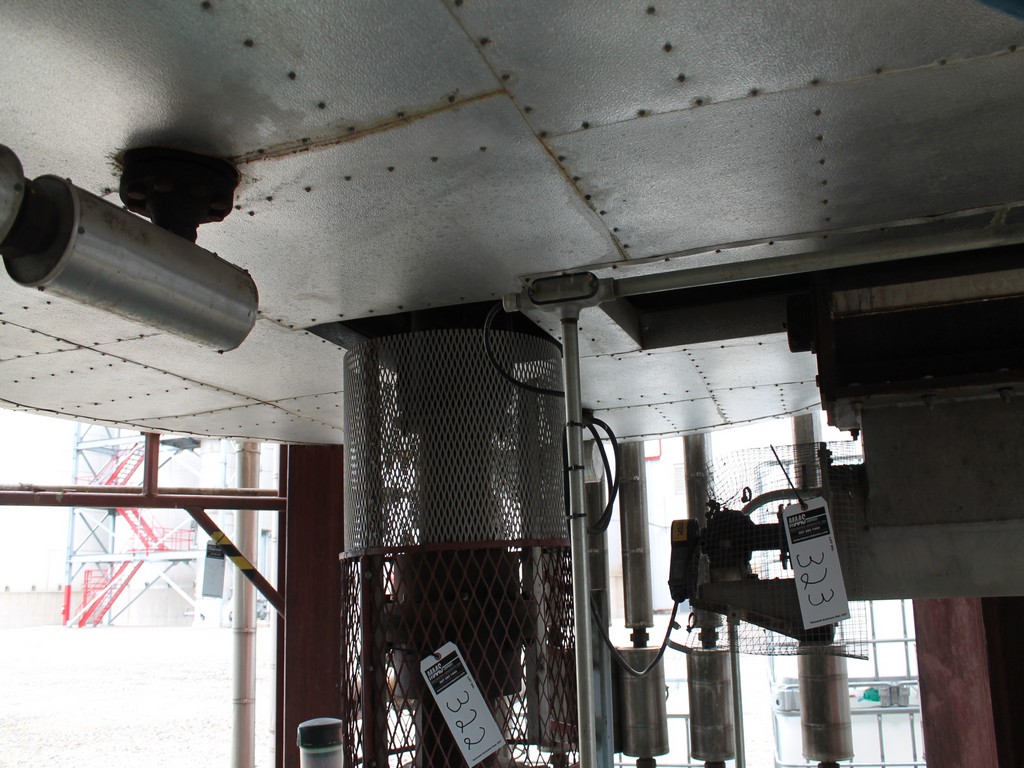 Vertical Stainless Steel Processing Tank, Processes 65 Metric Tons Per Day, Interior Main Shaft with (6) Sweep Arms, DT Feed Rotary Valve with TEXP 1800 RPM Motor, Bottom Rotary Valve, Mounted on Mild Steel Stand with Legs; Hansen QVRG4-CUN-112 Gear Drive, SN UUM002061-1A, Weg 75-HP Electric Motor, Frame 36415T; Includes 4'' Stainless Cylinder and All 6'' Ductwork and Manifolds, Steel Ladder and Work Platform. NOTE: Remove Ducts and Other Items from Building and Patch Holes in Building.