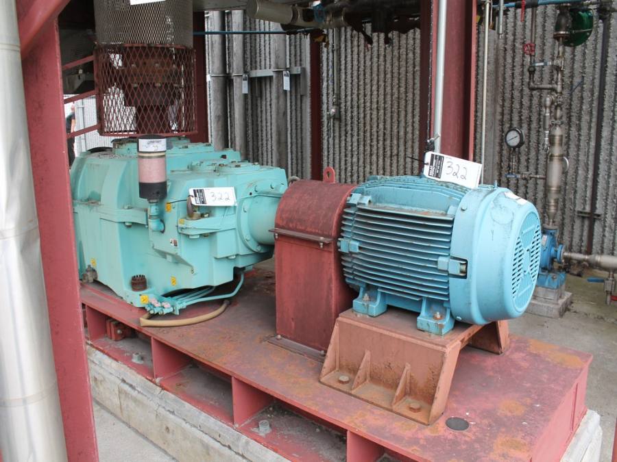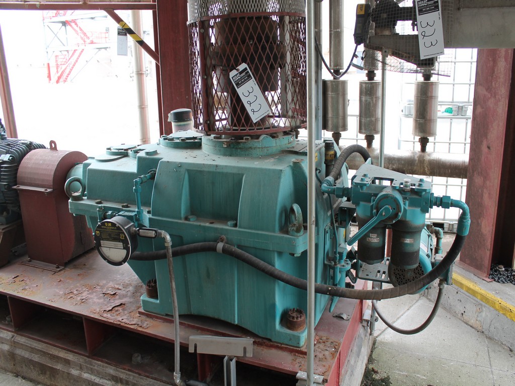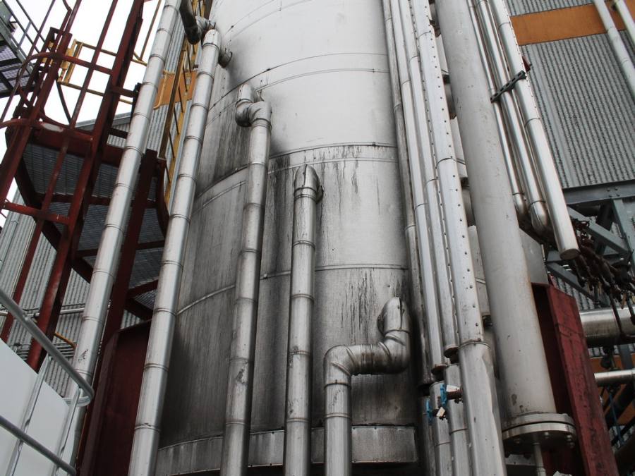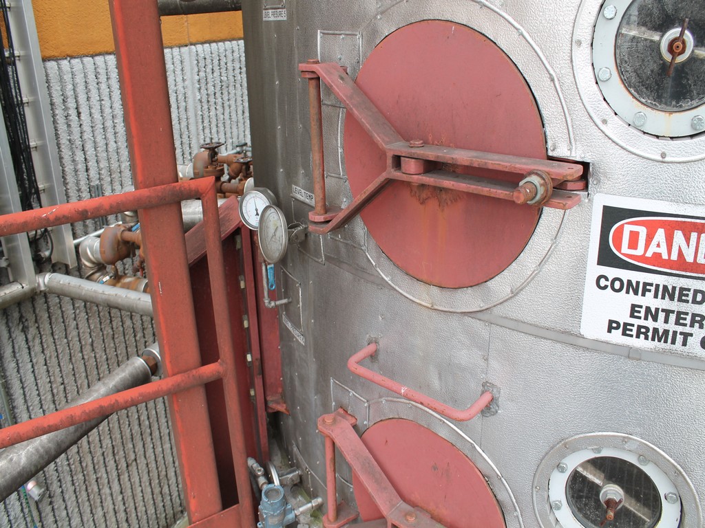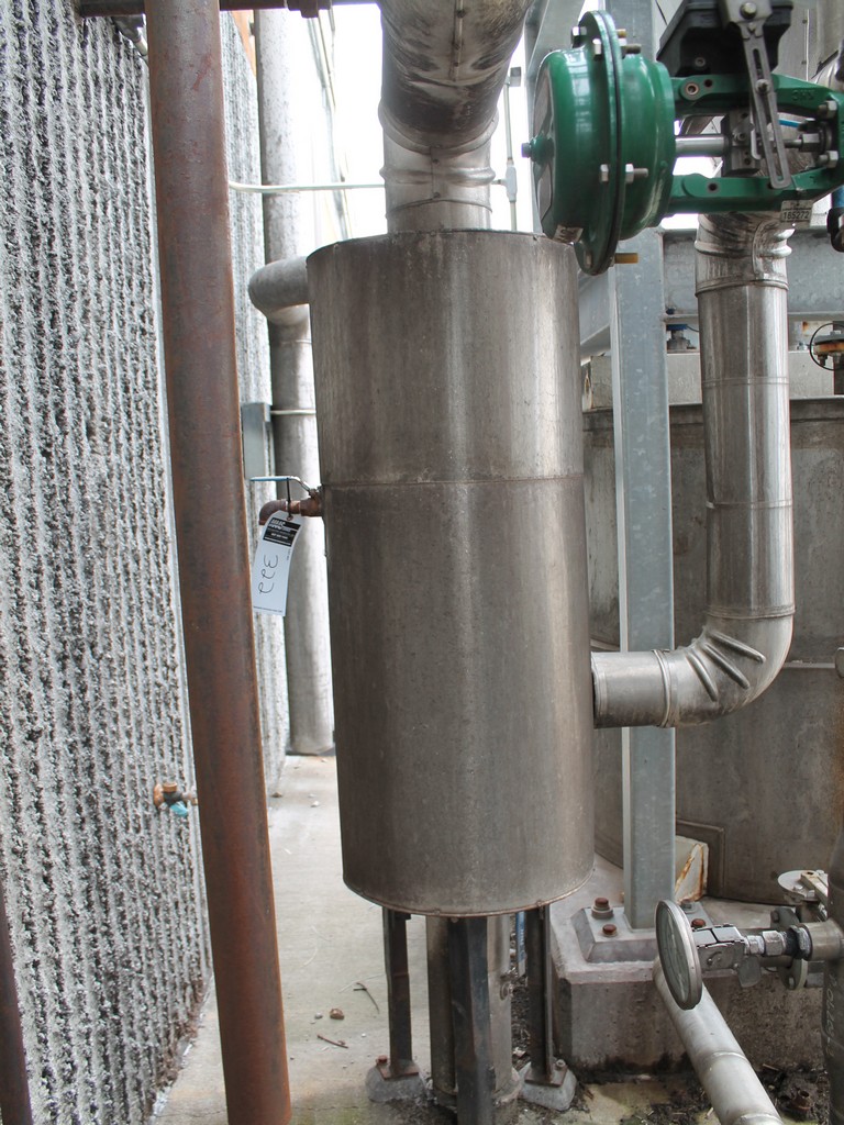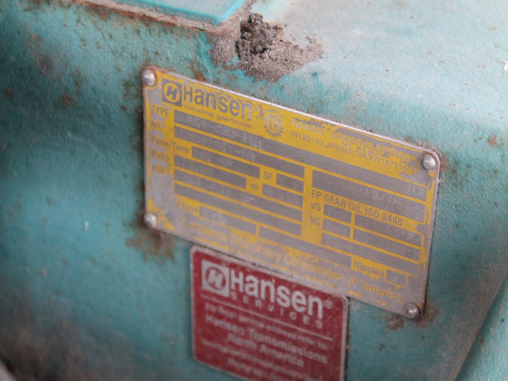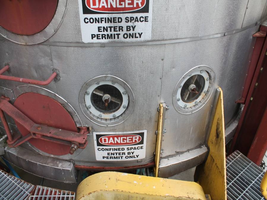 Vertical Stainless Steel Processing Tank, Processes 65 Metric Tons Per Day, Interior Main Shaft with (6) Sweep Arms, DT Feed Rotary Valve with TEXP 1800 RPM Motor, Bottom Rotary Valve, Mounted on Mild Steel Stand with Legs; Hansen QVRG4-CUN-112 Gear Drive, SN UUM002061-1A, Weg 75-HP Electric Motor, Frame 36415T; Includes 4'' Stainless Cylinder and All 6'' Ductwork and Manifolds, Steel Ladder and Work Platform. NOTE: Remove Ducts and Other Items from Building and Patch Holes in Building.