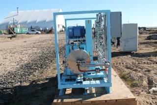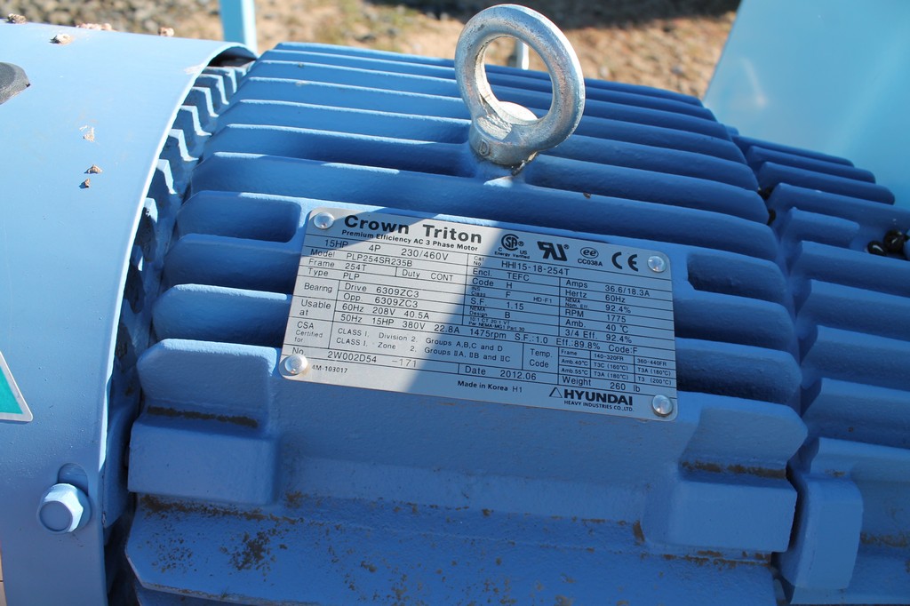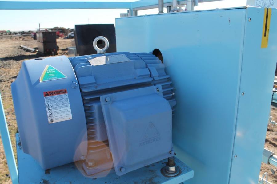 NEW/UNUSED 2- Cylinder Horizontal Opposed Compressor, powered by HYUNDAI Crown Triton 15 hp, 230 v, 60 Hz, 1775 rpm Electric Motor, mounted in Fabricated Metal Frame 5 ft. 8 in. x 44 in. deep x 7 ft. long (approx.) OD, having an I-Beam Base. (NOTE: Most Piping and Valves are Stainless Steel.) Single Stage, Horizontally Opposed Frame Configuration; Inlet MWAP: 90 psig, Max Inlet Temperature: 140 F, MAWP Discharge: 330 psig, Normal Running Parameters: Inlet pressure 40 psig, Capacity 40 SCFM. With Electrical Control Panel, Group A, B, C, D, Type 4, Class 1, Div. 2, 13-(total) Run, Stop, and Standby Button Switches having Integral Indicator Lights, 3-(total) Start, Stop & Jog Button Switches and 1- Emergency Stop Switch.