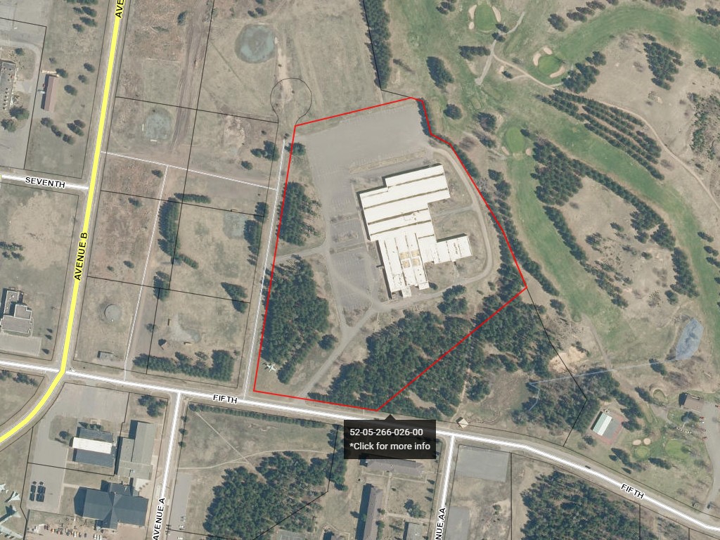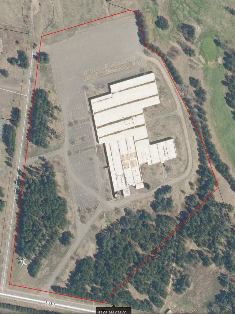 The campus like property has two entrances off of 5th Street that lead up the hill into large paved parking areas. A paved service road circles the property. The building is adjacent to the county operated Red Fox Run Golf Course.